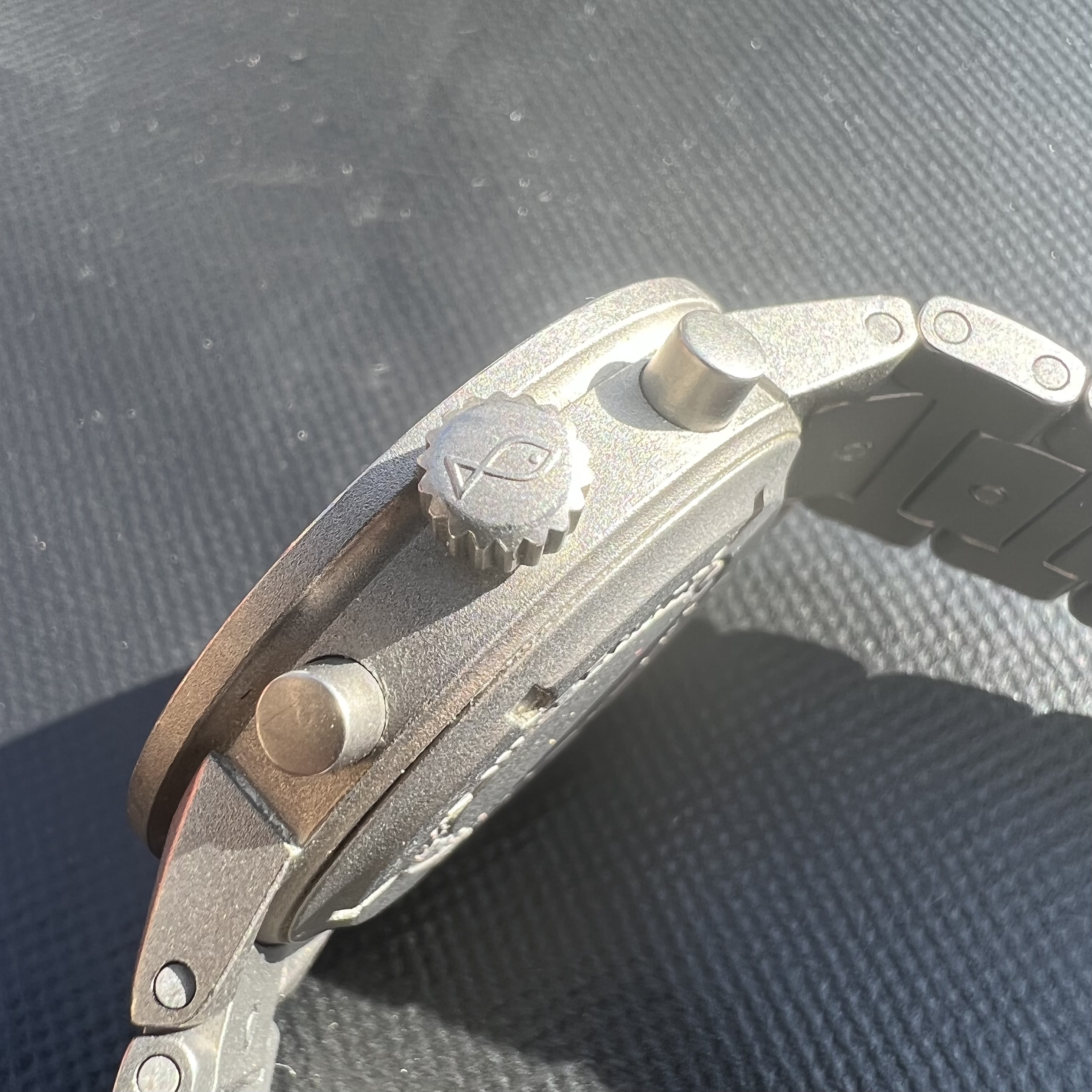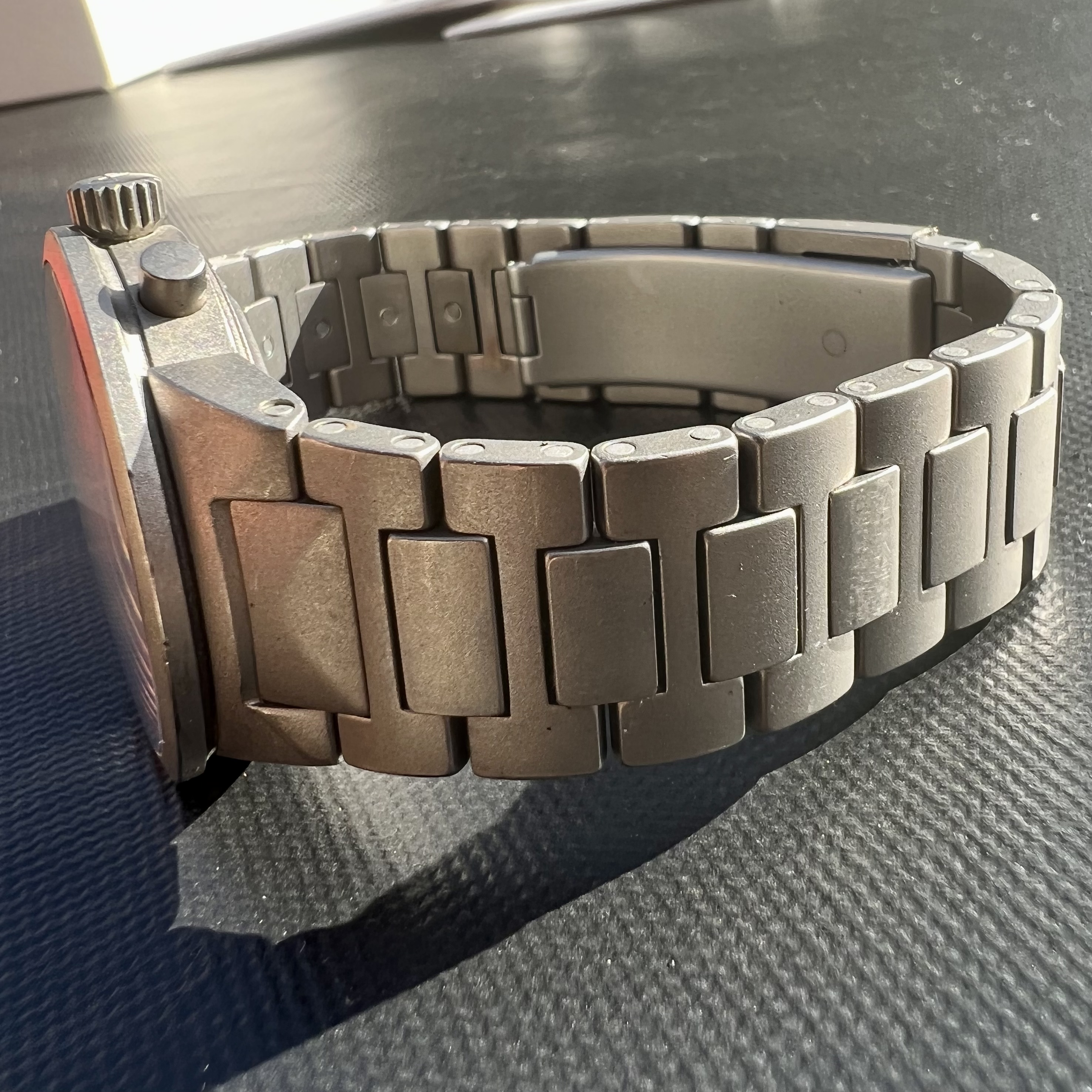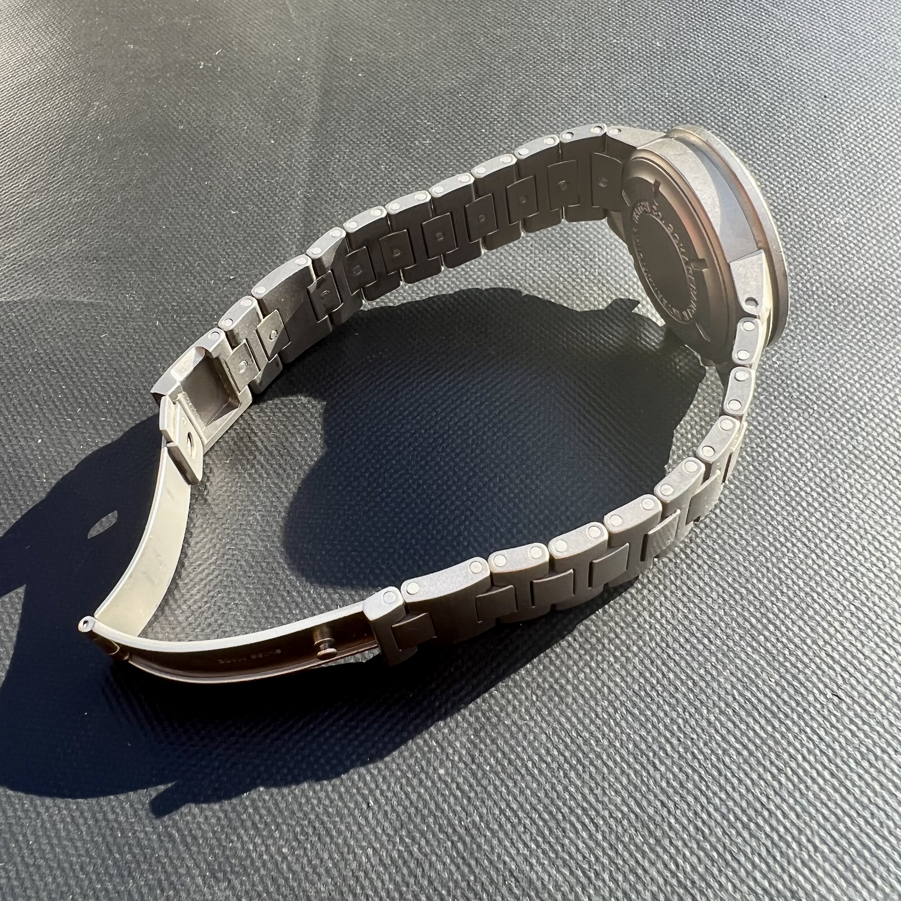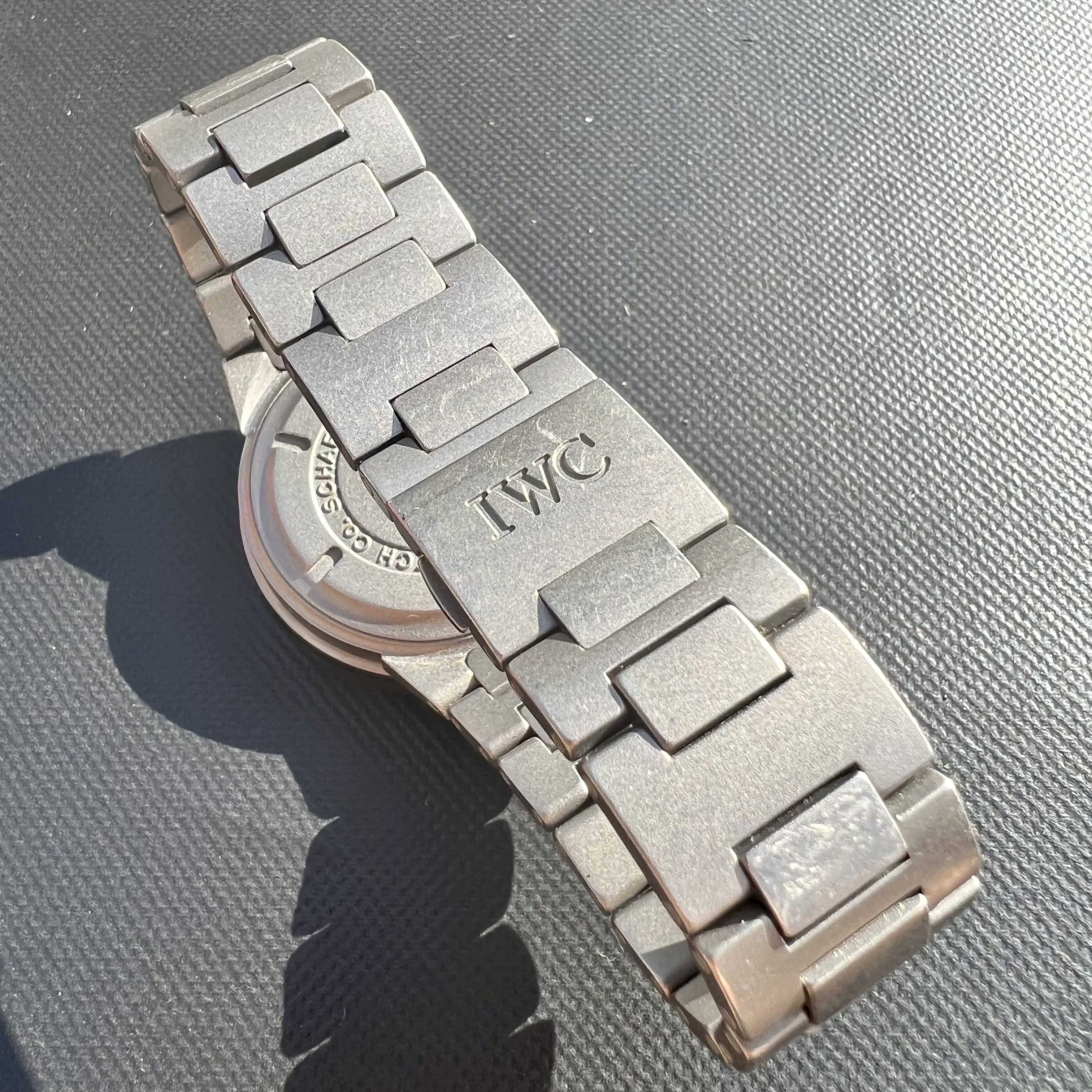 The watch case measures 37mm without the crown, sapphire crystal. The pushers and crown are original. With the pushers it wears a bit bigger, but extremely comfortably. The case back has deep engravings and looks absolutely beautiful. The movement is keeping excellent time, and is the famous mechaquartz made by Jaeger LeCoultre. An IWC sports watch powered by a JLC movement is a really interesting thing indeed. The battery was changed last year by IWC and the watch passed its pressure test. The dial and hands are all original of course. The bracelet contains all of the links, and there are some desk-diving scratches as one would expect.