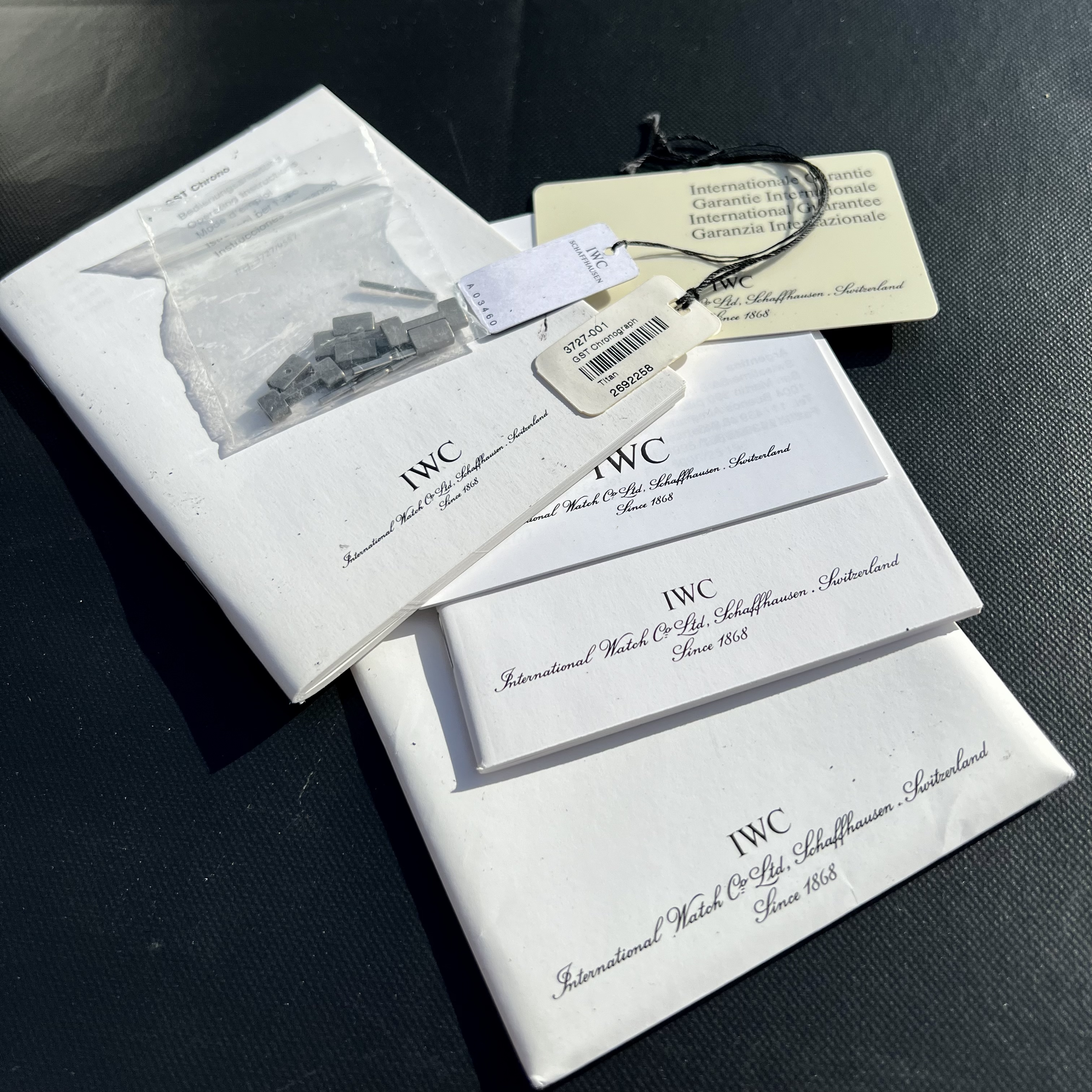 Up for sale is my IWC 3727 GST Chronograph in Titanium. This is the full set including boxes, warranty card (unsigned, undated), the books, and two original hang tags. The watch comes with all of the links for the bracelet as well.