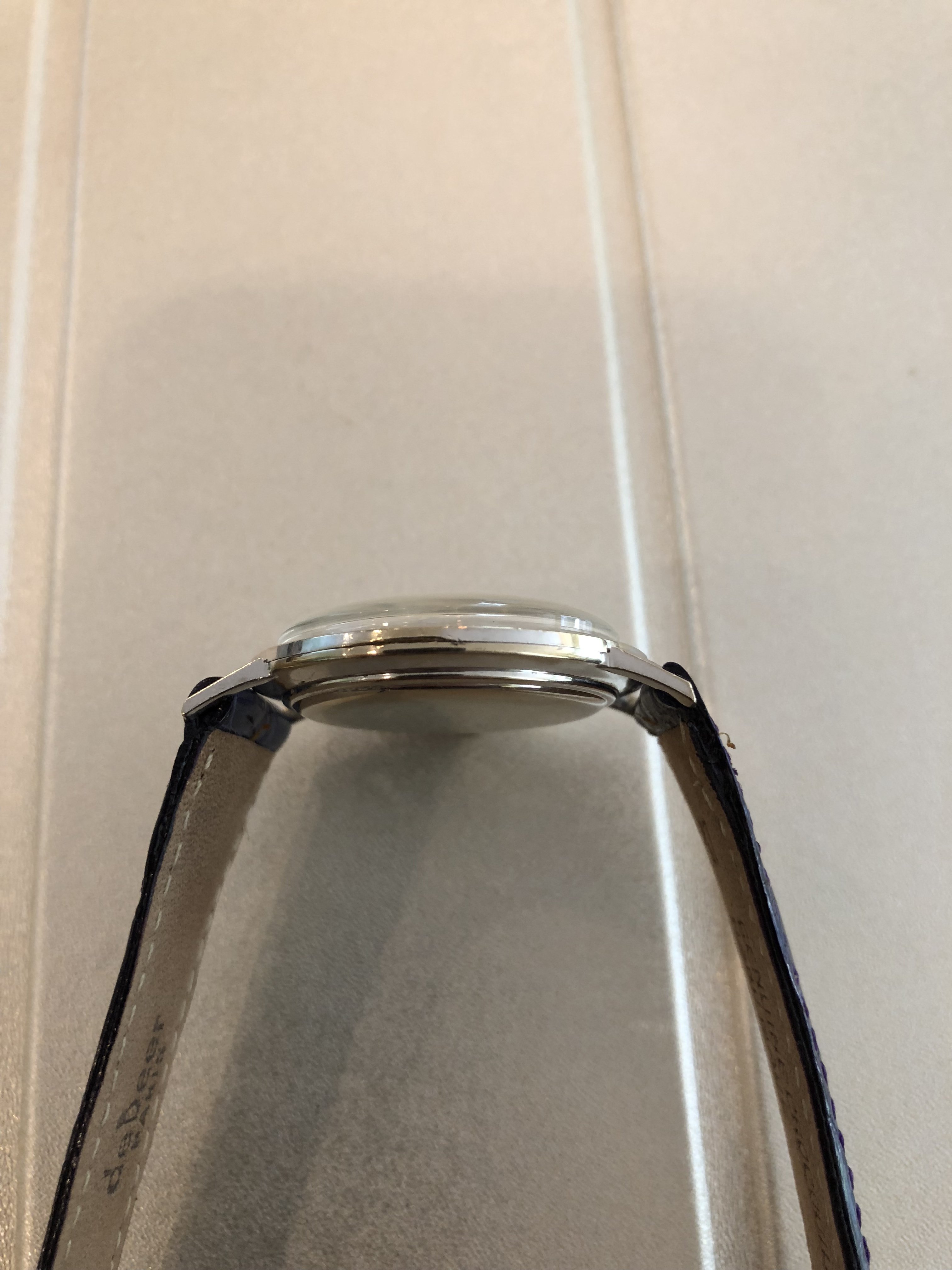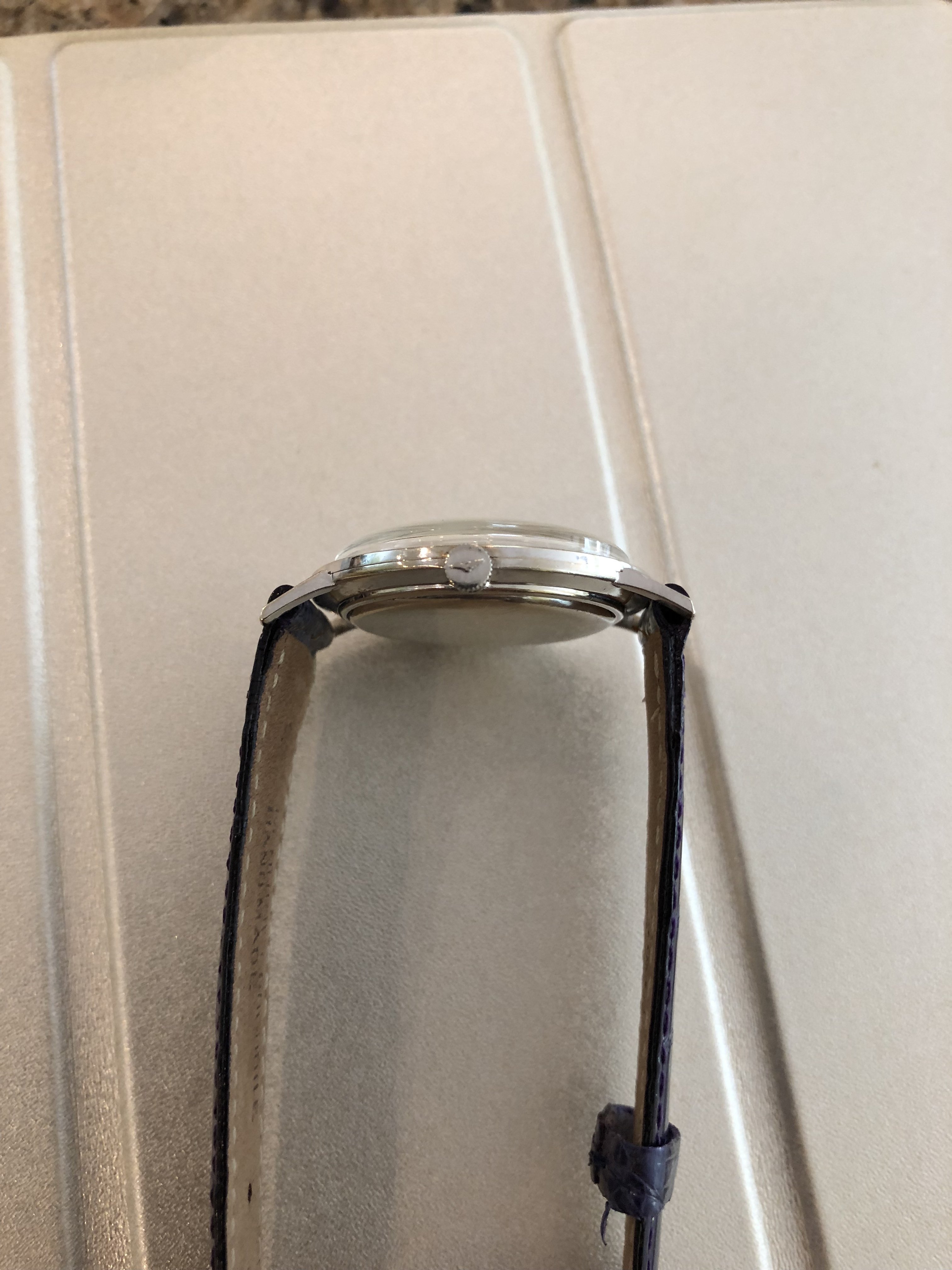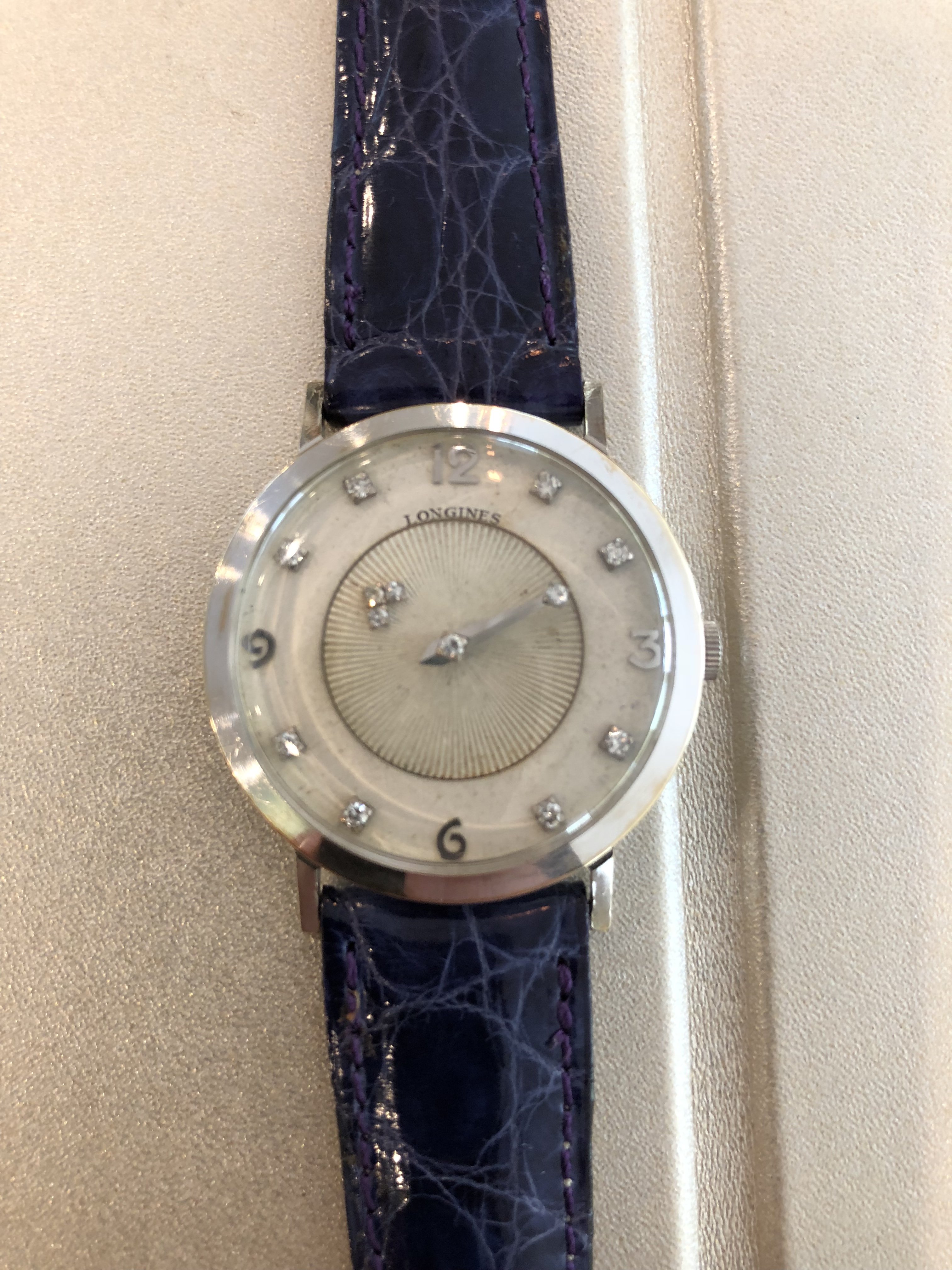 ·Have never sold before, only bought, so here goes. This is a nice late 50’s Longines with American 14k white gold case containing manual wind 19.4 movement. Had service with my watchmaker mid-2016 and I have wound a few times since then, but have never worn, hence why I should probably try and sell it. Case is 32mm without crown. Crown appears original and is appropriate for this model. Lugs are 17 mm, and I’ll ship with the purple croc band shown. It is croc, but super thin and nobody will mistake it for high quality. Tried to show the discoloration on the white dial, which has not been refinished. Diamonds are real, but pinky ring optional. As anyone in the jewelry business can tell you, small melee diamonds like these don’t have a ton of value. I am asking $450, PayPal and shipping costs included. Will ship USPS priority in US, but whatever seems safe and cheap overseas. Since my first sale, feel free to critique via PM as appropriate.