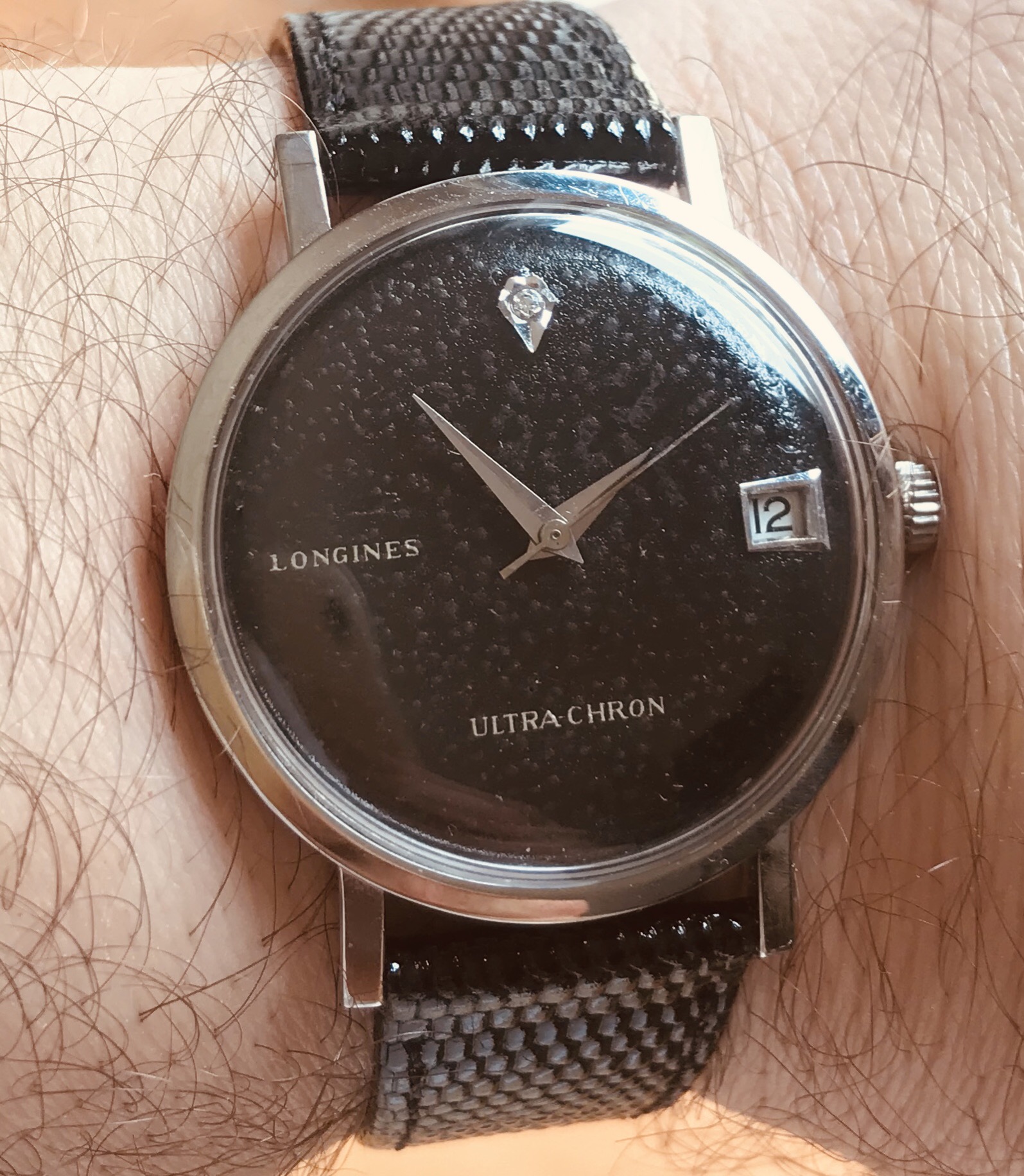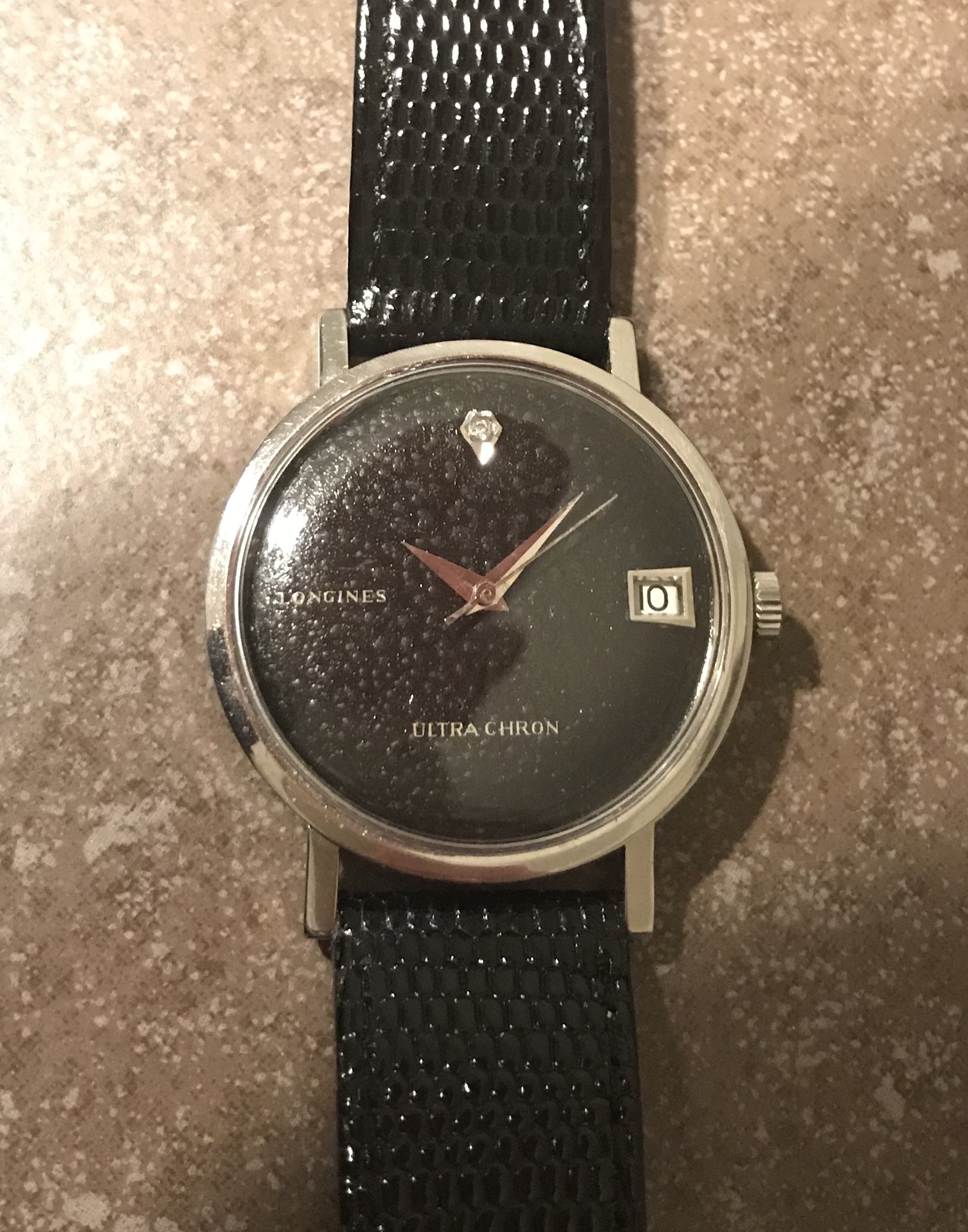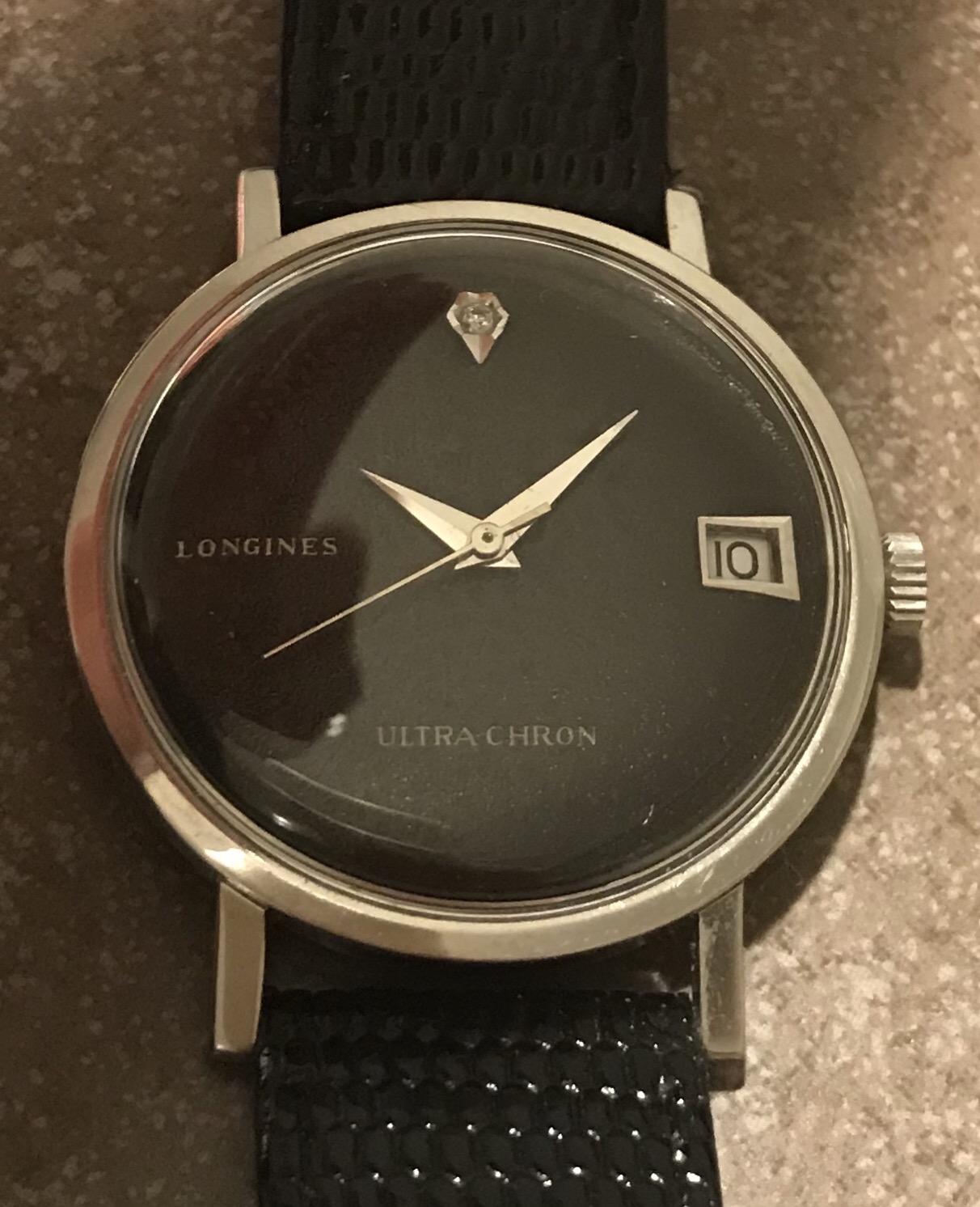 ·For sale is a fantastic Longines Ultra Chron with an original black diamond dial. The stainless steel case and hands contrast beautifully with the black dial and 12 o’clock diamond. Comes on a Banda strap with plenty of life left. The 431 movement was serviced last year and crystal was also replaced. Ready to wear and enjoy. $450 net to me + shipping.