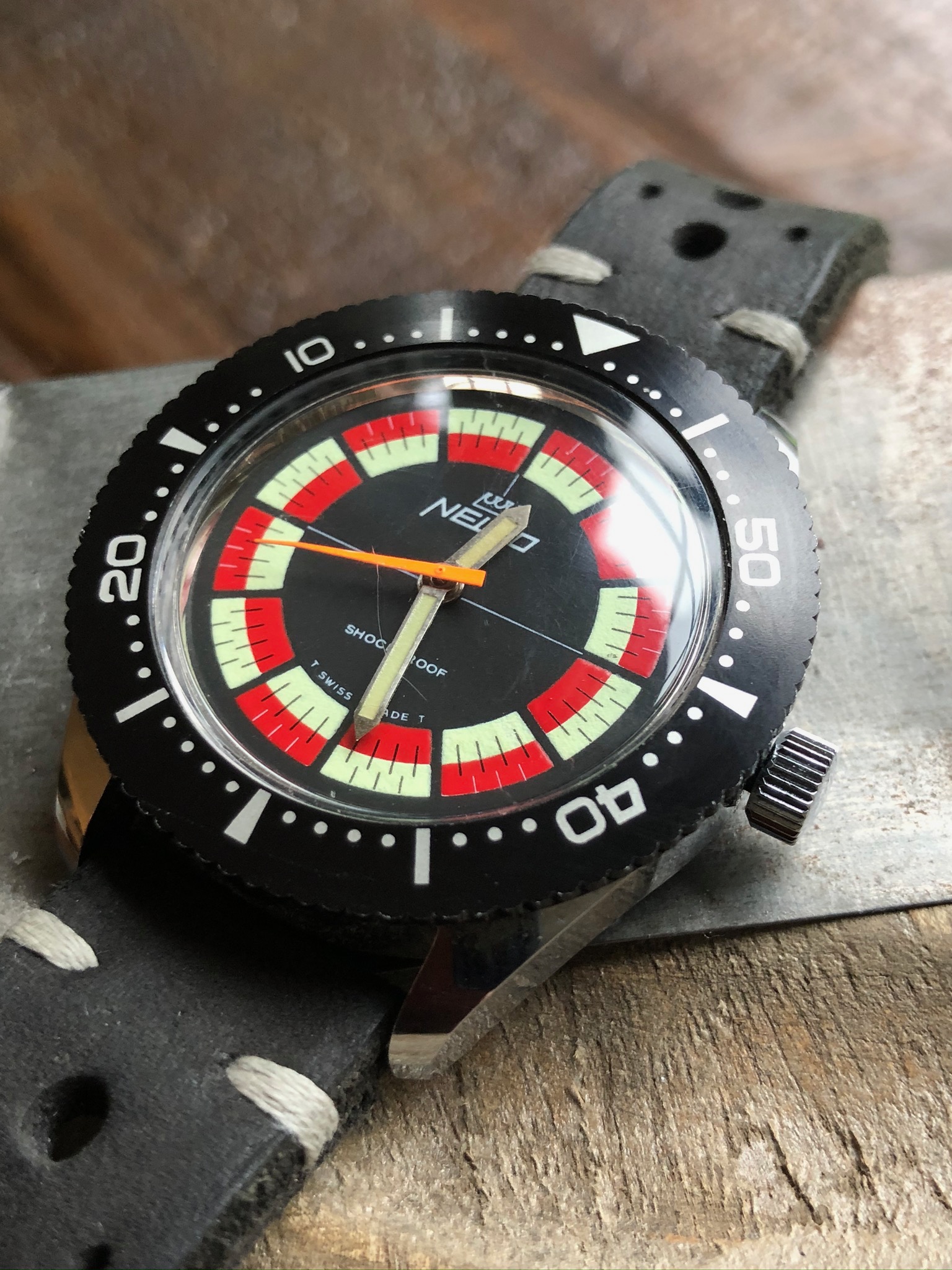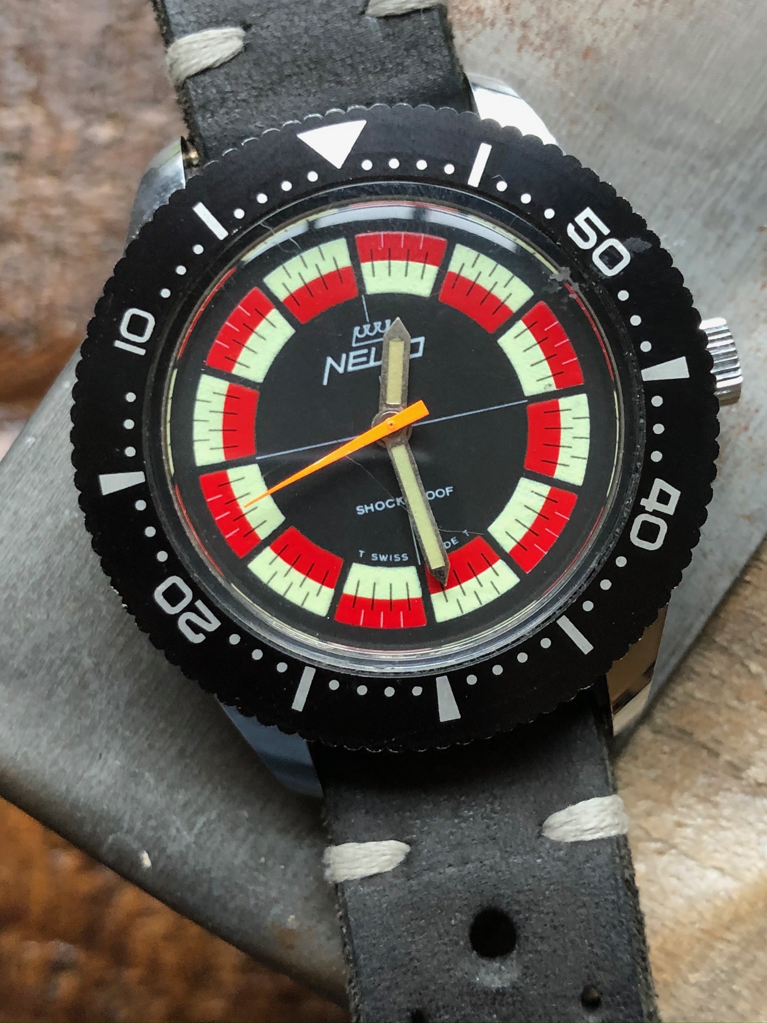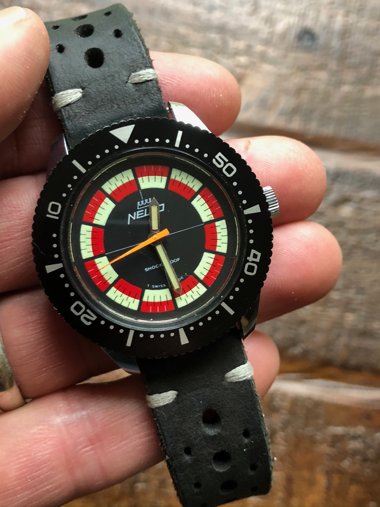 Posts 131 Likes 163 Clockworld ·Jan 4, 2020 Here is a pretty cool watch that I am letting Rare and Very good condition, NELCO Race $500.00 Fun watch guilt-free! I had it recently serviced an is good running order. Making room new incoming