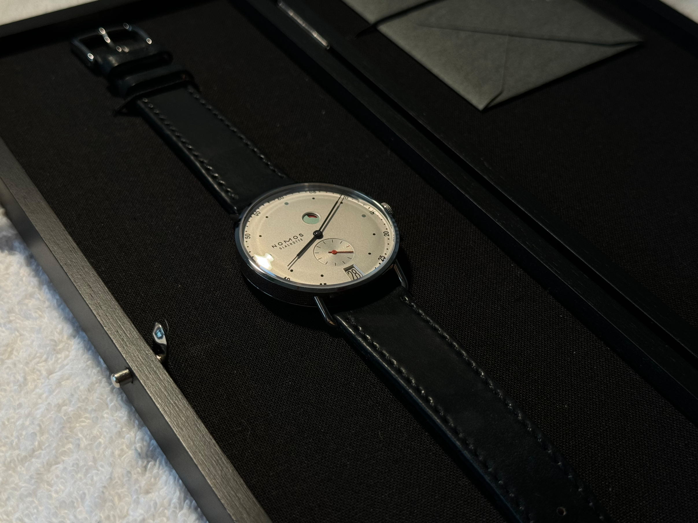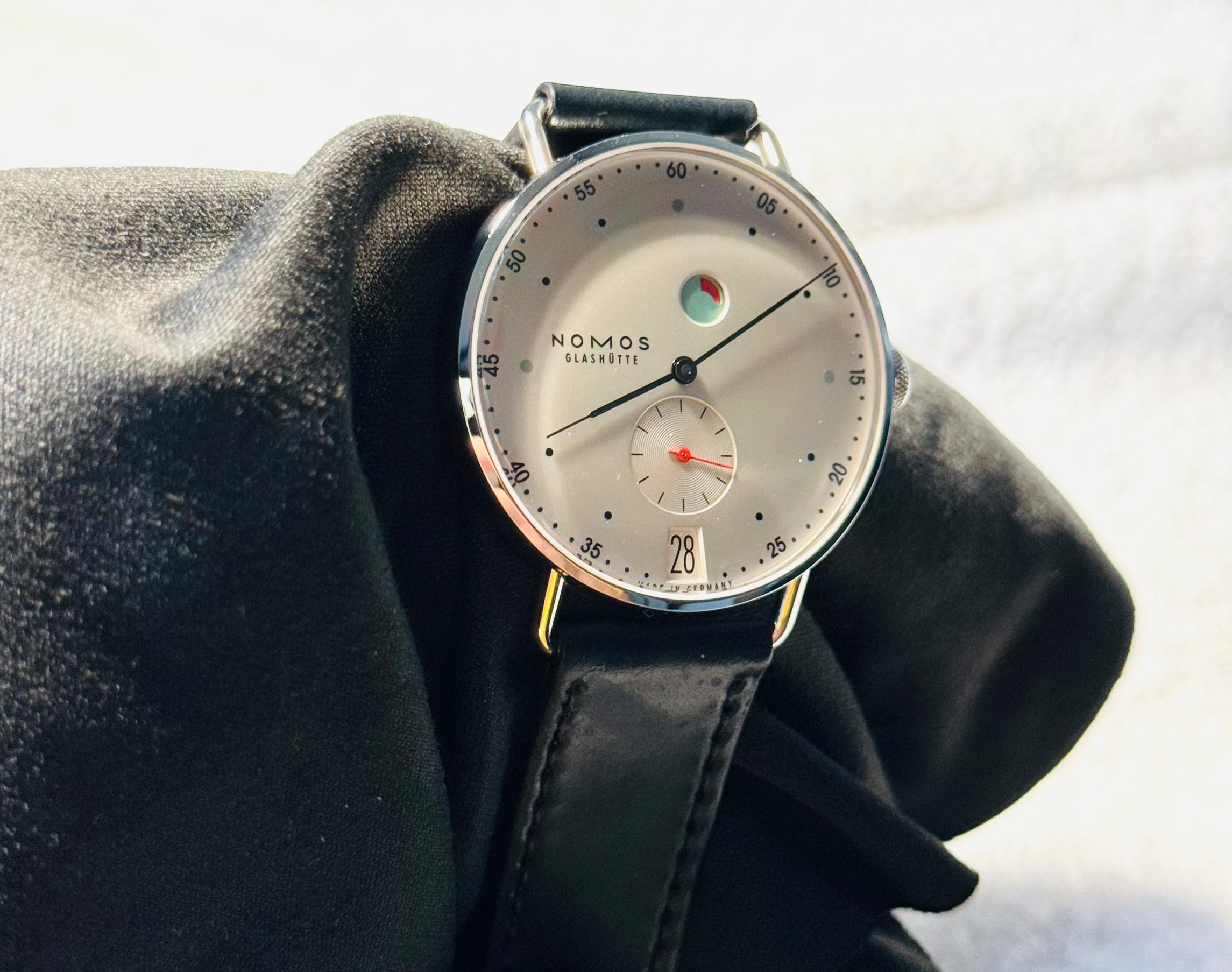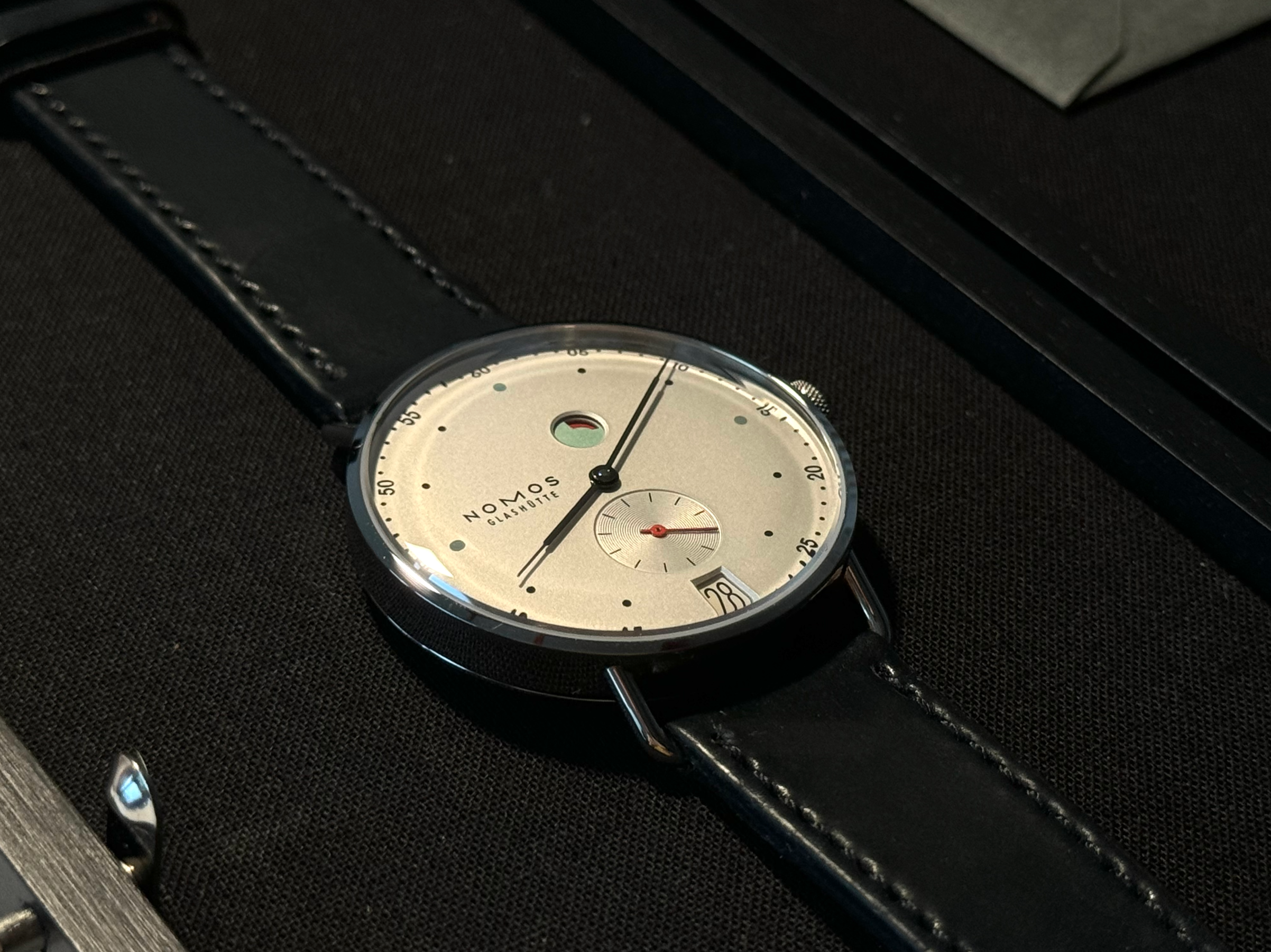 - Rhodium plated surfaces with Glashütte ribbing and NOMOS perlage decoration.
