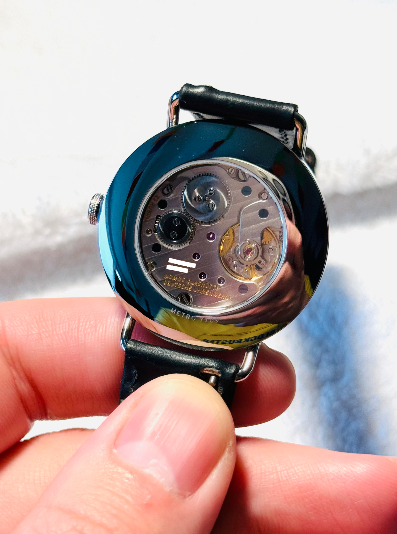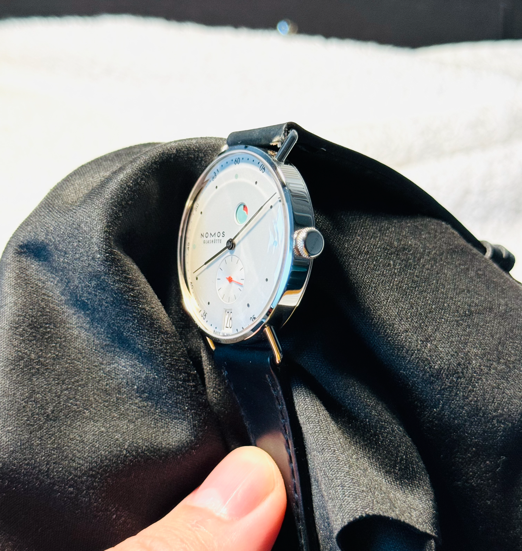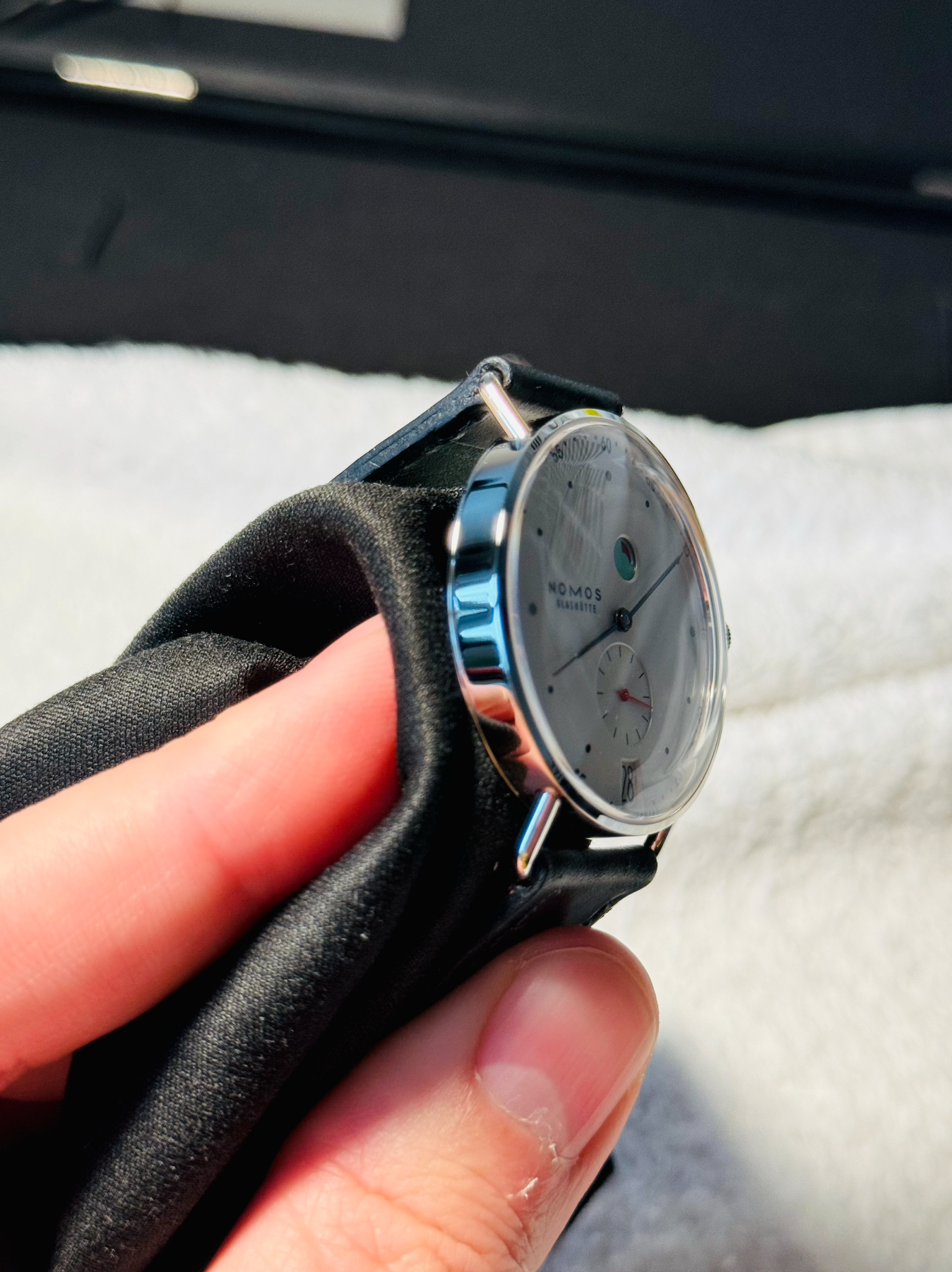- Rhodium plated surfaces with Glashütte ribbing and NOMOS perlage decoration.