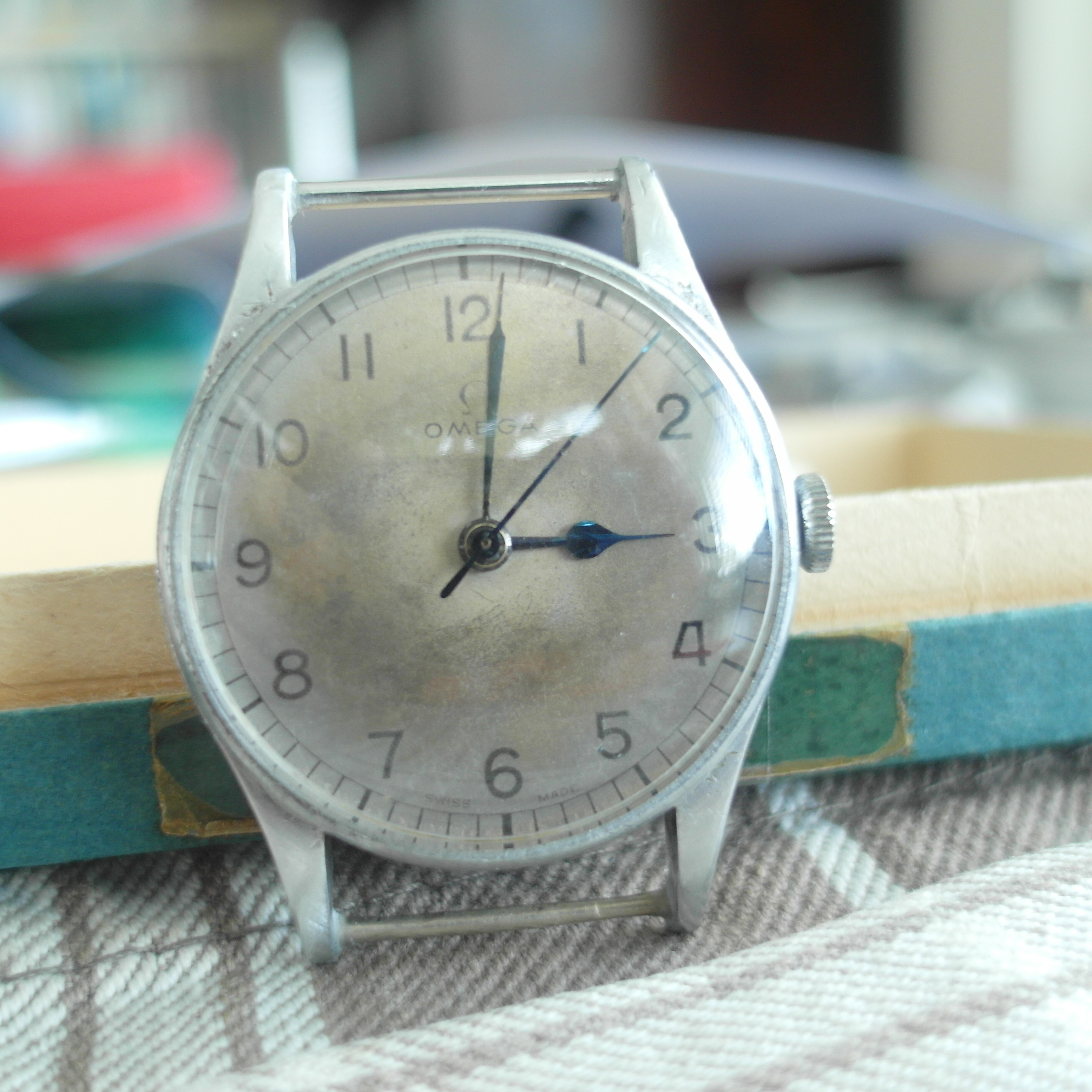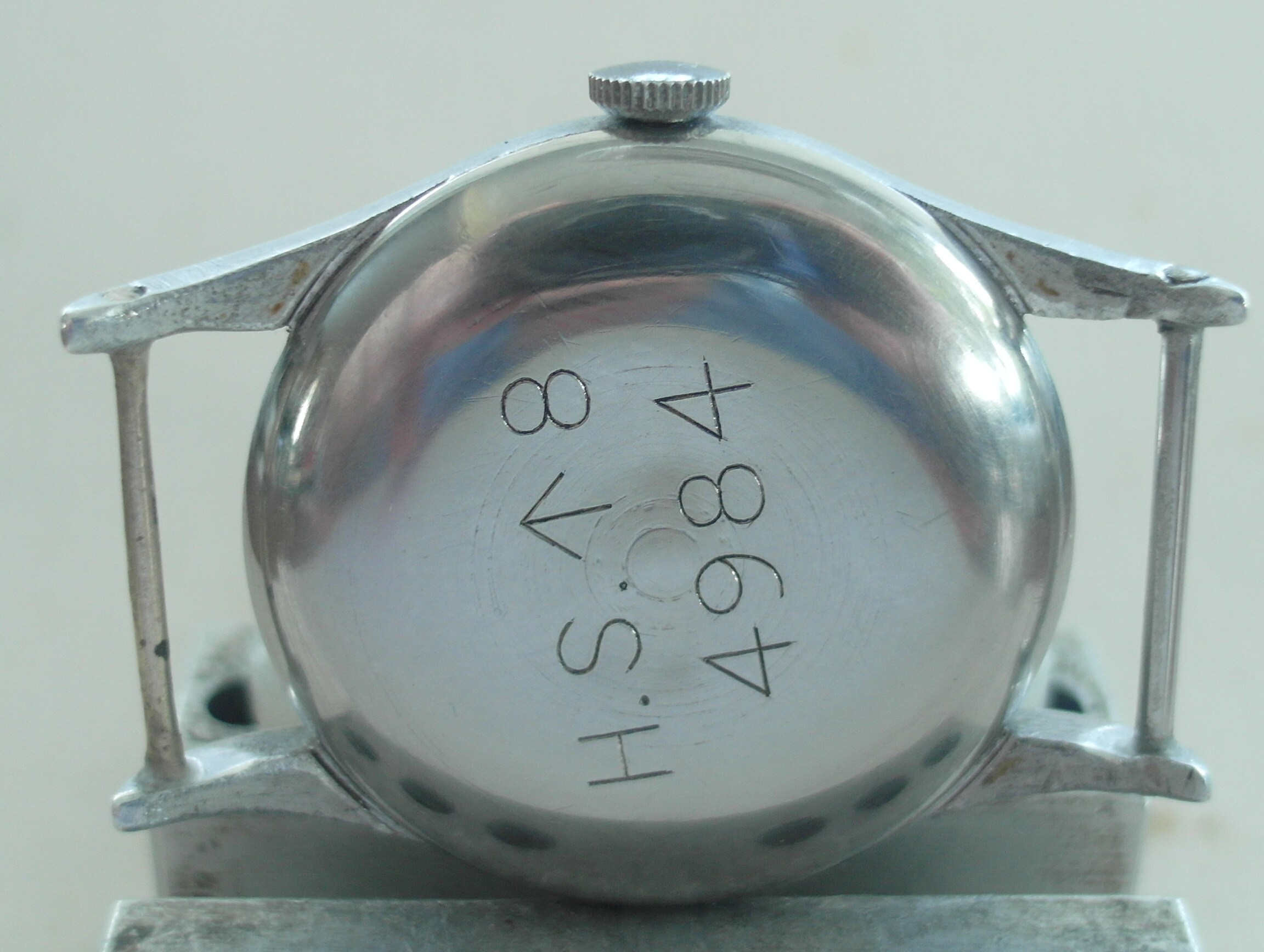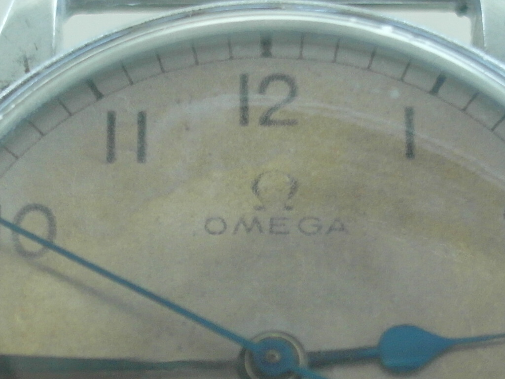 Here is the rarer HS ( Hydrographic survey ) version of Omega`s WW2 Pilots watch. 1942. Alloy Middle unmolested with the very long lugs; not damaged or shortened ! some battle scars, but nothing serious. fixed bars. the upper of the brass fixed bars was missing. we replaced it with a stainless steel bar. secured with a drop of glue to avoid another mishap.... the lower bar is the original brass one; a bit worn now. secured as well. easy to remove, if desired. the lug holes are perfect. therefore the lugs are perfect. which is quite rare with this model; most have lug issues.... original "Bubble" glas with scratches. original crown. original case. original dial; not repainted. the script is very fine and original, but faded with age. has morphed into a silver colour with some age areas. shown in the pictures. . only the center has the light whitish colour . blued hands. the center second hand looks replaced with a different tail partand slightly thicker. works well, but service history unknown. therefore sold as is. HS engraved back has some pressure marks in the middle from opening and closing, i guess. movement looks very clean; a replacement of the mainspring might the way to go at the next service. diameter without crown: 33 mm. with crown: 35 mm. lug to lug: 43 mm. thickness: 12 mm. Paypal payment not possible here. bankwire or Transfer Wise for best rates and quick service. we only ship via Post courier international,EMS for A$ 65. the Covid related travel times from Down under are too unpredictable otherwise. somewhere there is the Bonklip band as well; have not found that one..... will let you know, if i do. we ship and declare in a way, that you do not have to pay all fees entering europe.....we offer full value insurance for 1% of the value, without showing on the parcel. via a 3. party insurer. Asking US$ 2400.