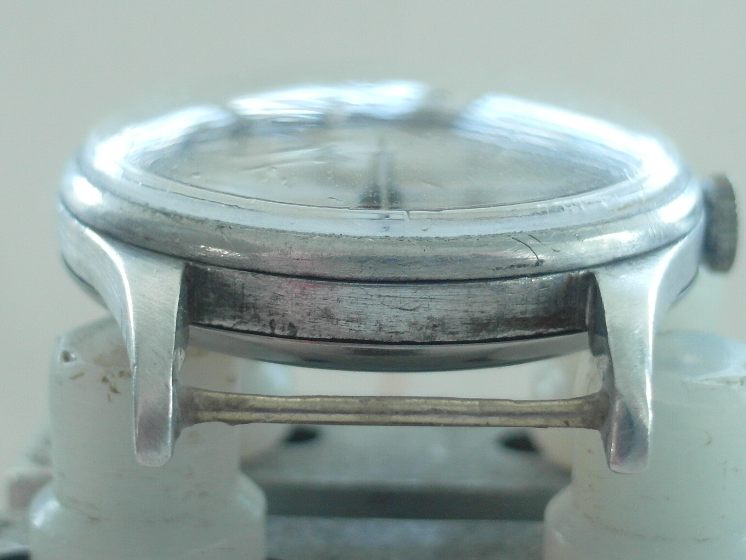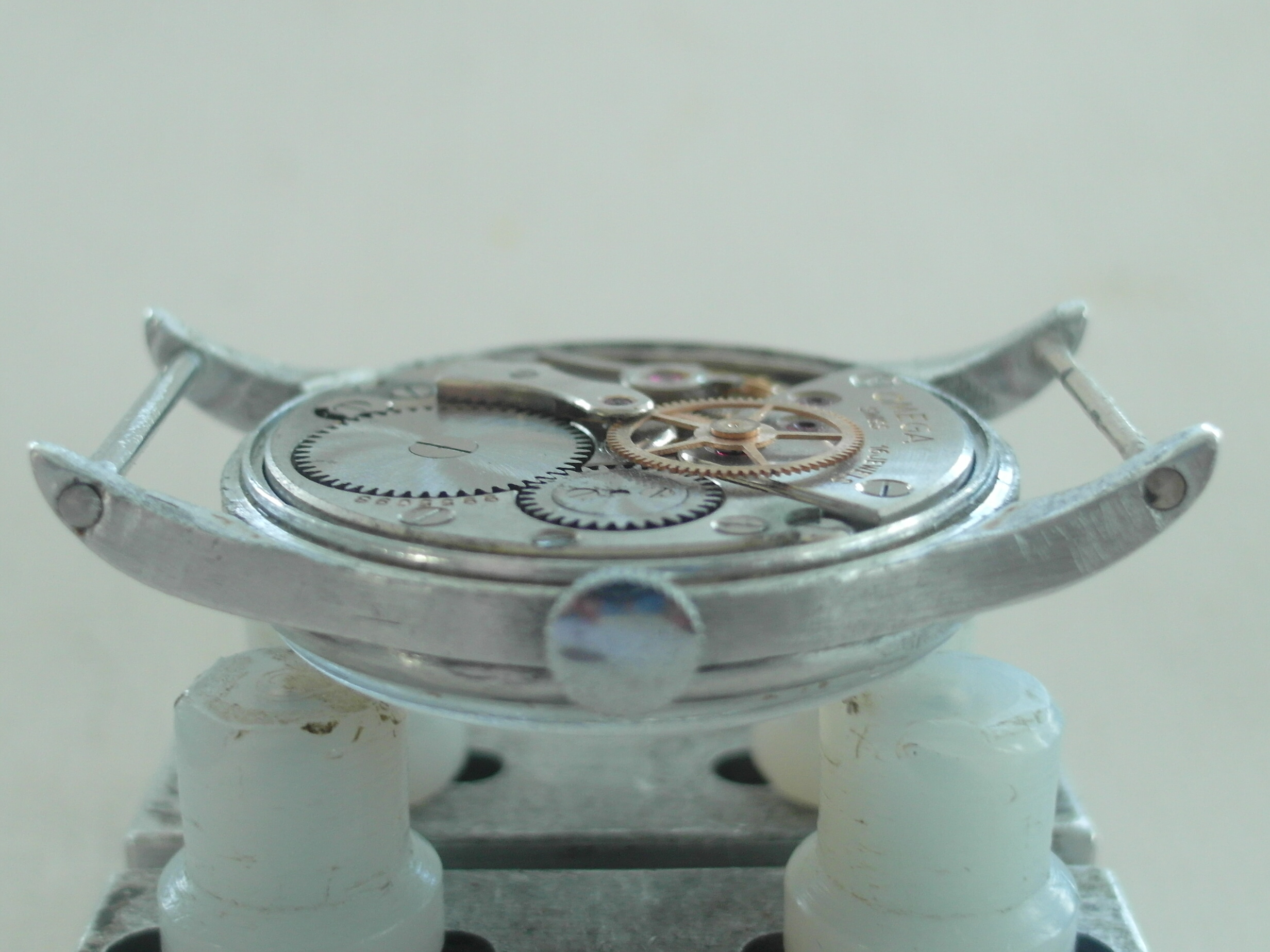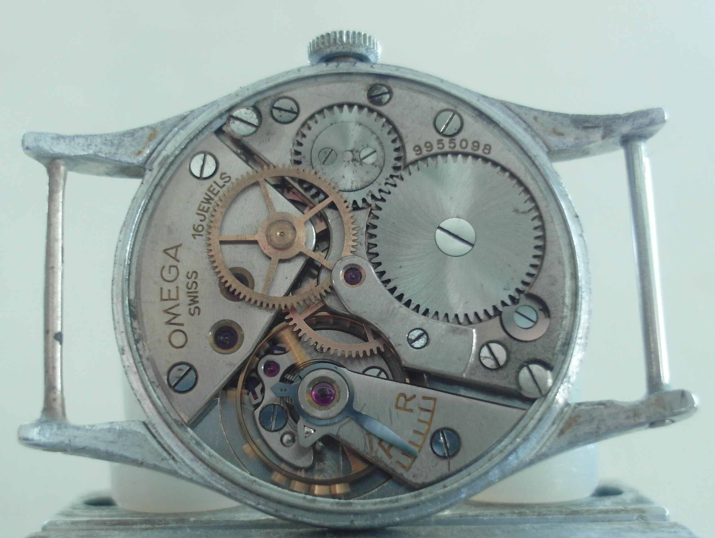 Here is the rarer HS ( Hydrographic survey ) version of Omega`s WW2 Pilots watch. 1942. Alloy Middle unmolested with the very long lugs; not damaged or shortened ! some battle scars, but nothing serious. fixed bars. the upper of the brass fixed bars was missing. we replaced it with a stainless steel bar. secured with a drop of glue to avoid another mishap.... the lower bar is the original brass one; a bit worn now. secured as well. easy to remove, if desired. the lug holes are perfect. therefore the lugs are perfect. which is quite rare with this model; most have lug issues.... original "Bubble" glas with scratches. original crown. original case. original dial; not repainted. the script is very fine and original, but faded with age. has morphed into a silver colour with some age areas. shown in the pictures. . only the center has the light whitish colour . blued hands. the center second hand looks replaced with a different tail partand slightly thicker. works well, but service history unknown. therefore sold as is. HS engraved back has some pressure marks in the middle from opening and closing, i guess. movement looks very clean; a replacement of the mainspring might the way to go at the next service. diameter without crown: 33 mm. with crown: 35 mm. lug to lug: 43 mm. thickness: 12 mm. Paypal payment not possible here. bankwire or Transfer Wise for best rates and quick service. we only ship via Post courier international,EMS for A$ 65. the Covid related travel times from Down under are too unpredictable otherwise. somewhere there is the Bonklip band as well; have not found that one..... will let you know, if i do. we ship and declare in a way, that you do not have to pay all fees entering europe.....we offer full value insurance for 1% of the value, without showing on the parcel. via a 3. party insurer. Asking US$ 2400.