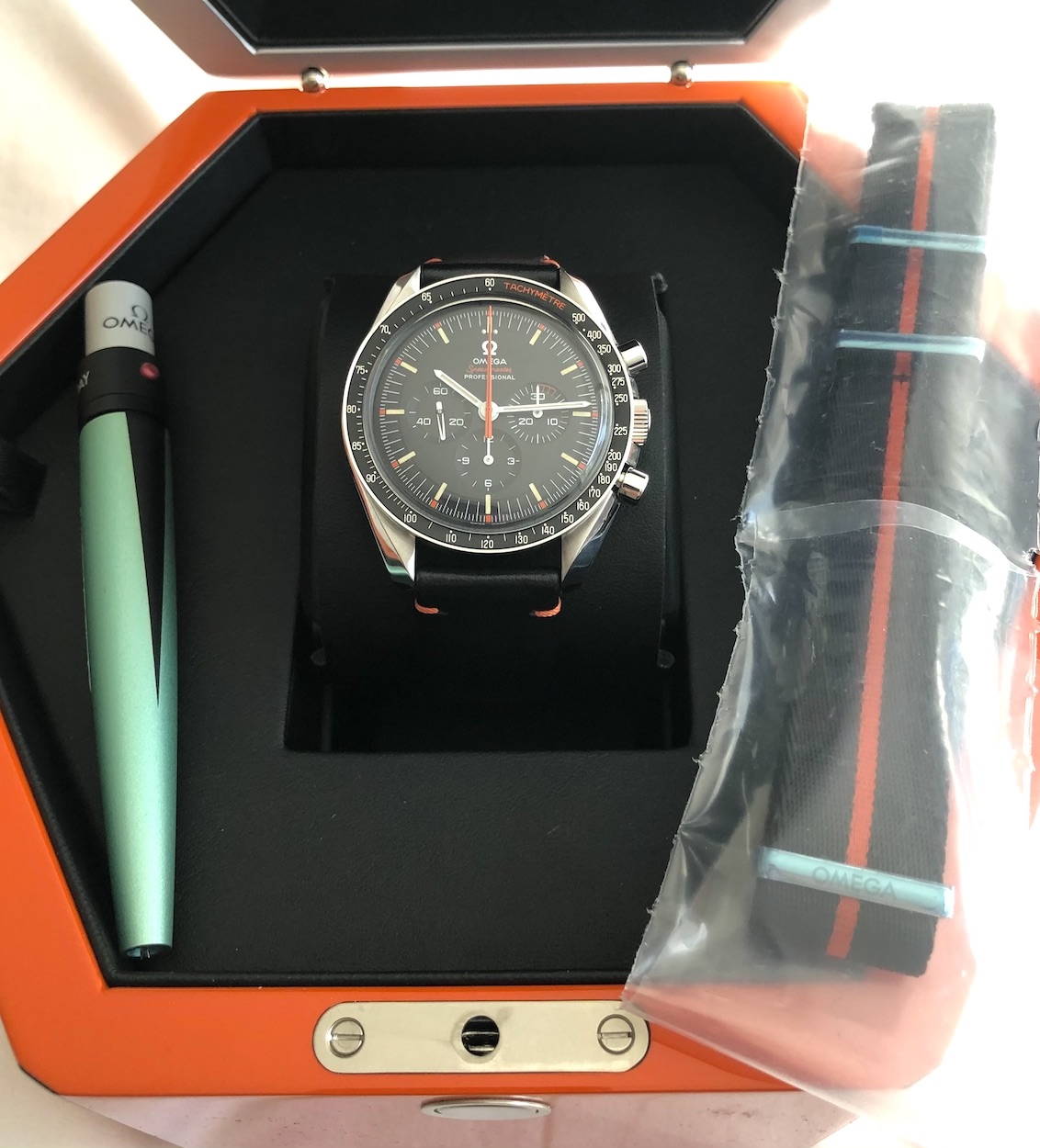 ·Selling my Omega Speedmaster Professional Limited Edition “Ultraman” (reference 311.12.42.30.01.001), full set in excellent/mint condition. Rarely worn. Mounted on the leather strap; Omega “Ultraman” NATO is still unworn, in original packaging. Comes with all original boxes, “Ultraman” and Omega manuals, UV flashlight, warranty cards, even the stickers that were removed. Maybe one or two tiny hairlines on case, but cosmetically near perfect. Watch also works perfectly, of course, and carries the remainder of 5-year Omega factory warranty. (Originally purchased from a U.S. Omega Boutique on 11/28/18.) Note that the exact number of the watch (out of 2012) and the serial number have been intentionally blurred in the photo of the case back.
