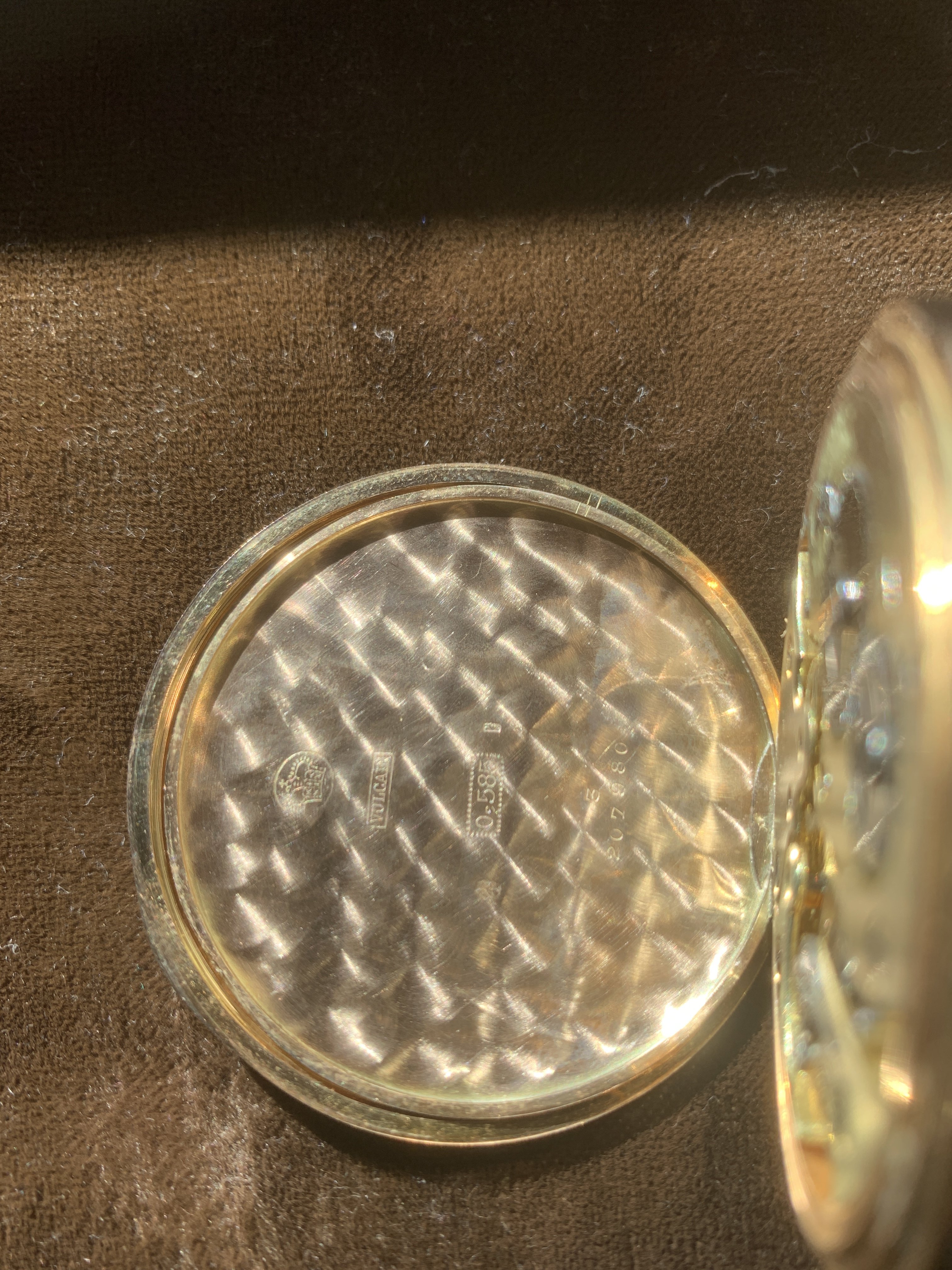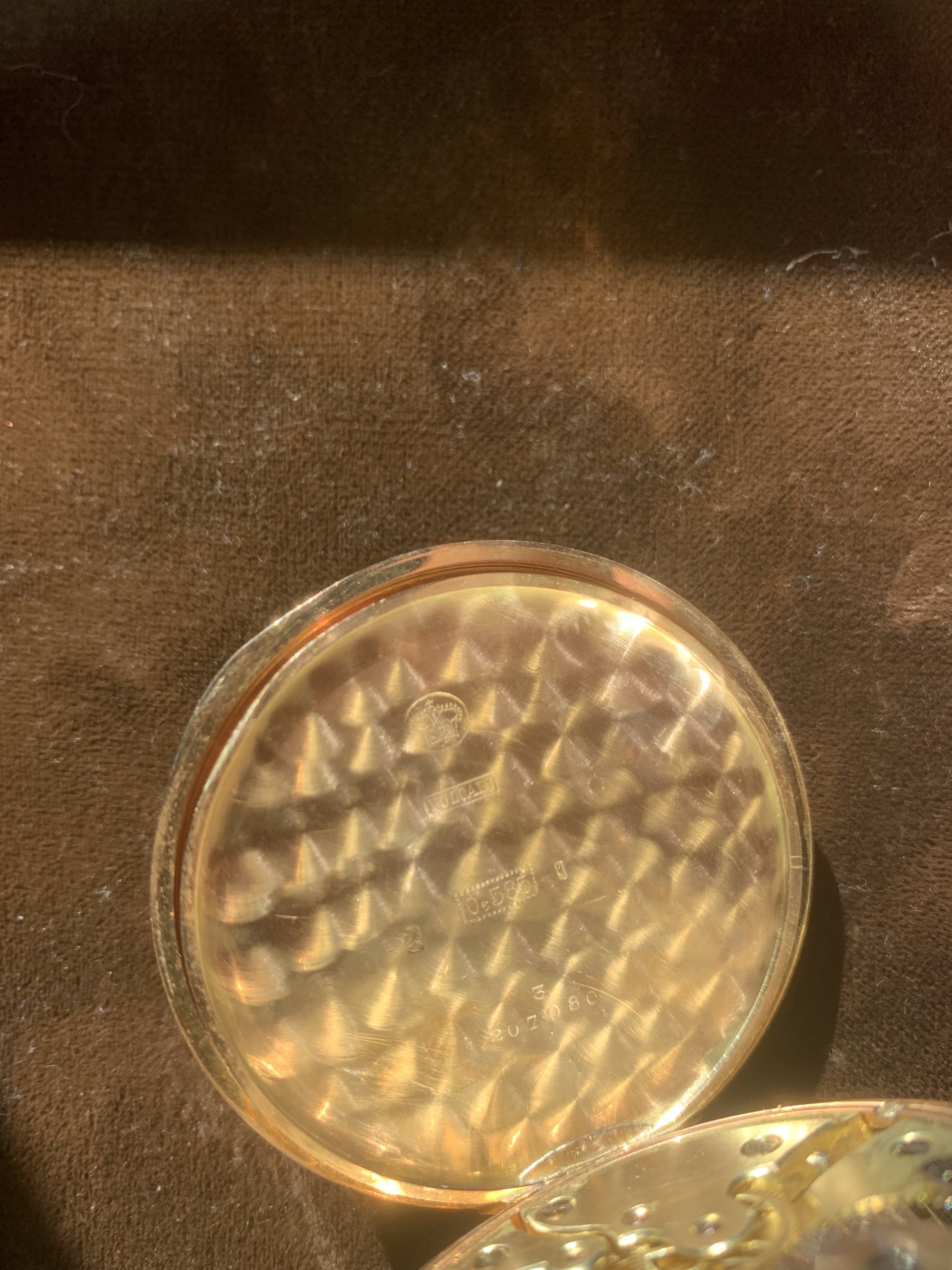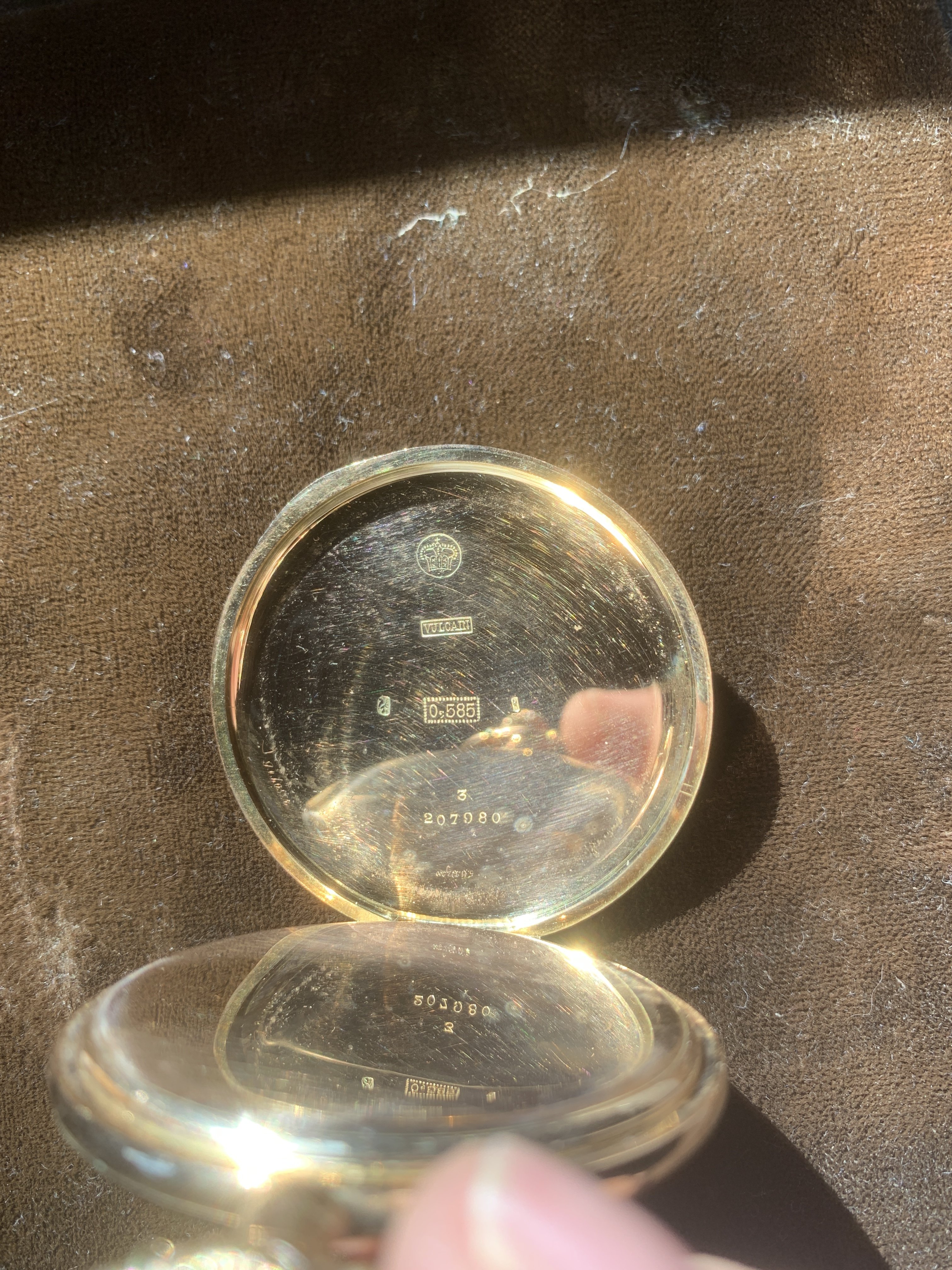 Case: 14k gold NR 207980, dust cover also 14k marked with the G=Geneva Swiss gold stamp for 585/100 (14k) from the period 1893-1934. Hinges are metal. German gold import stamp says "Vulcain"