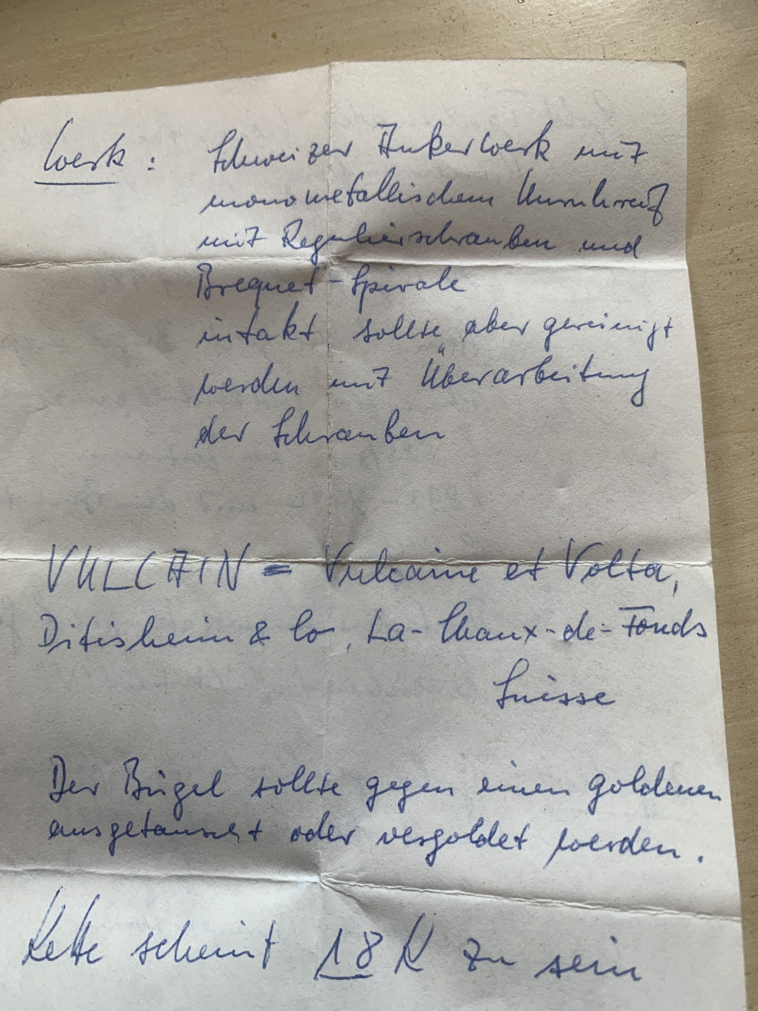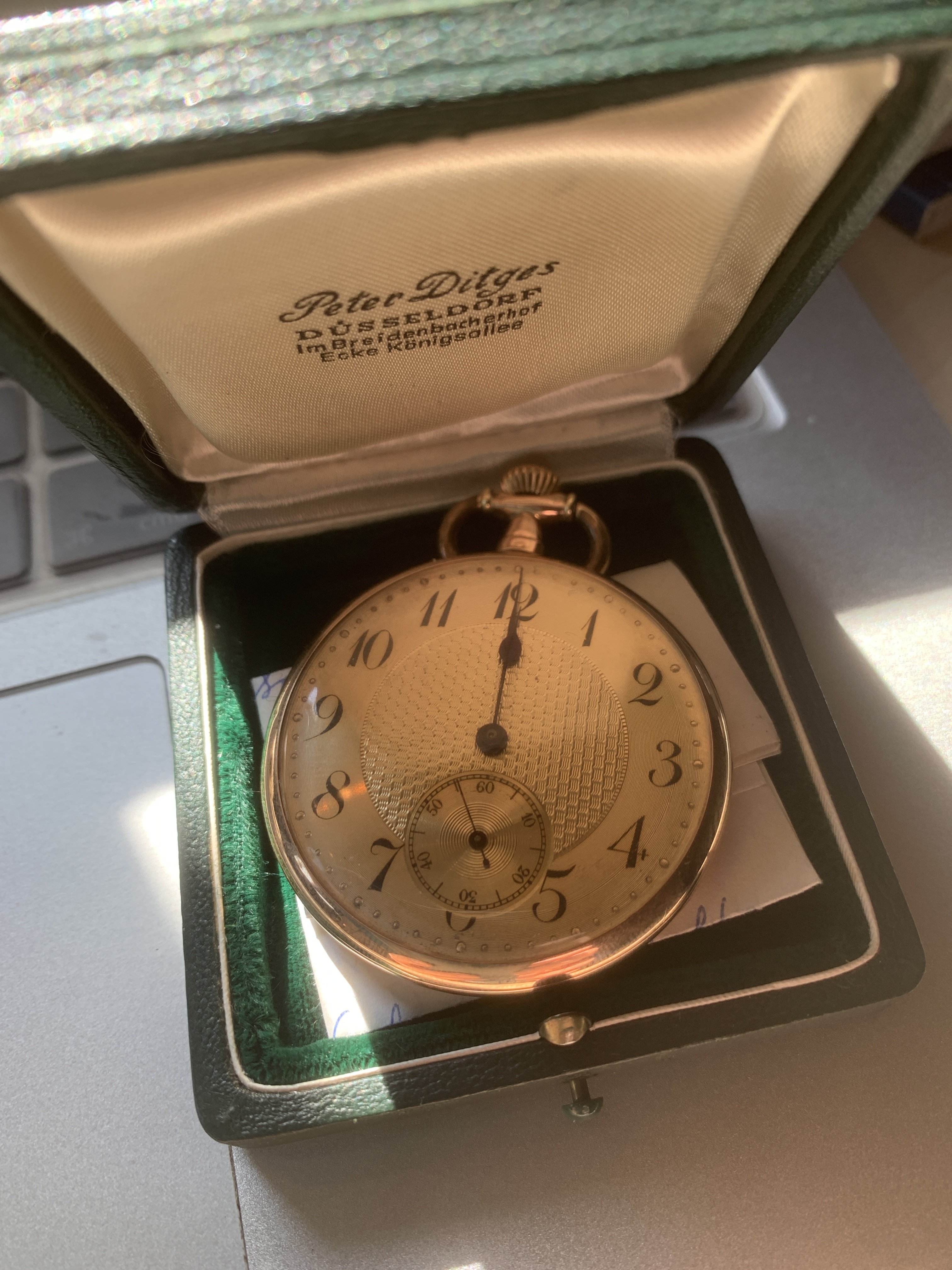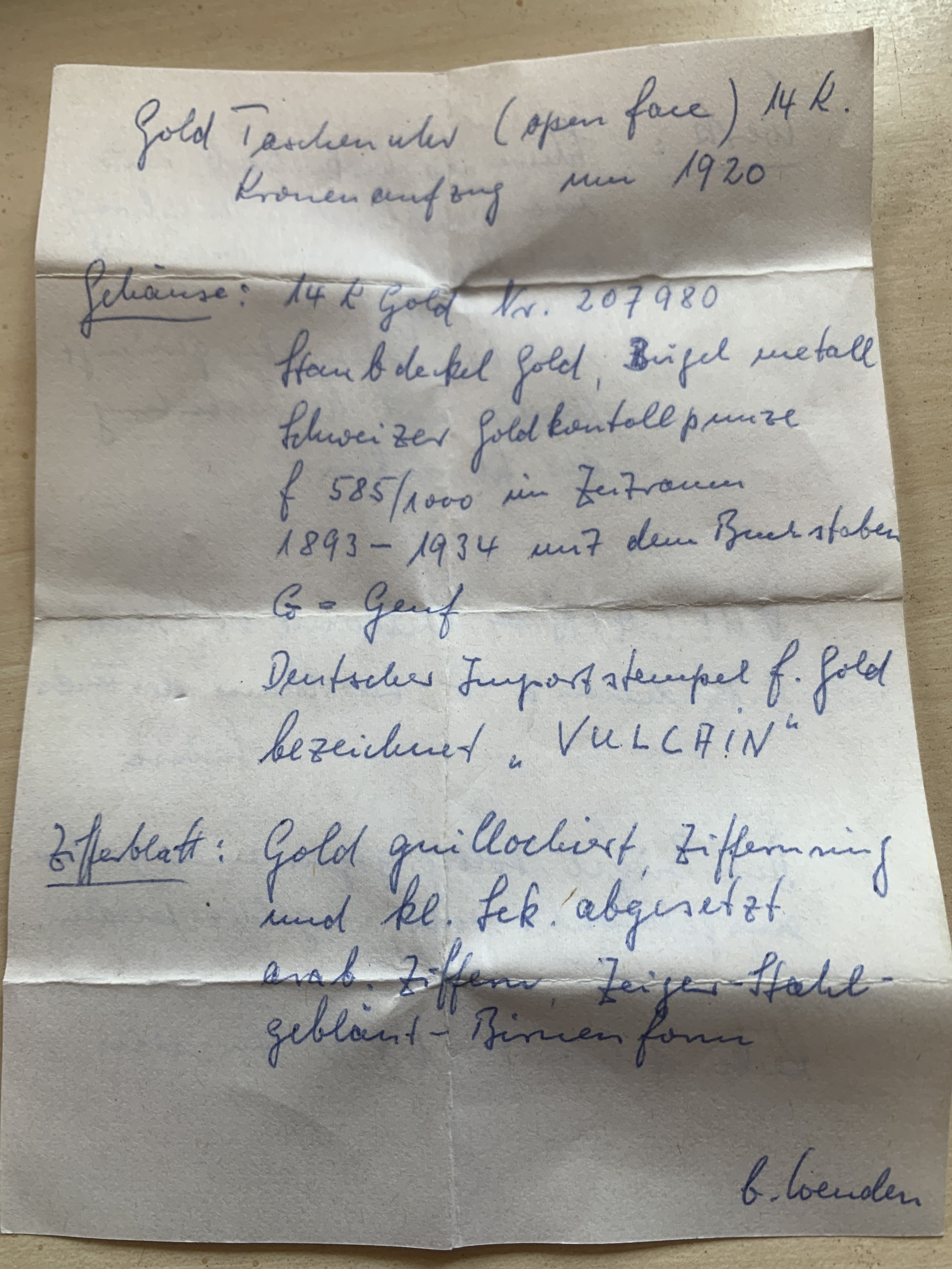 Emboldened by the successful sale of my first watch here I'd like to offer another one up for sale. This one came to me through my wife's family and I must confess I do not know much about it, or pocket watches in general for that matter. Along with the box, (from a jewellers in Düsseldorf which may or may not be original to the piece but certainly of that time period ) was a signed hand written appraisal in German which I will do my best to translate.