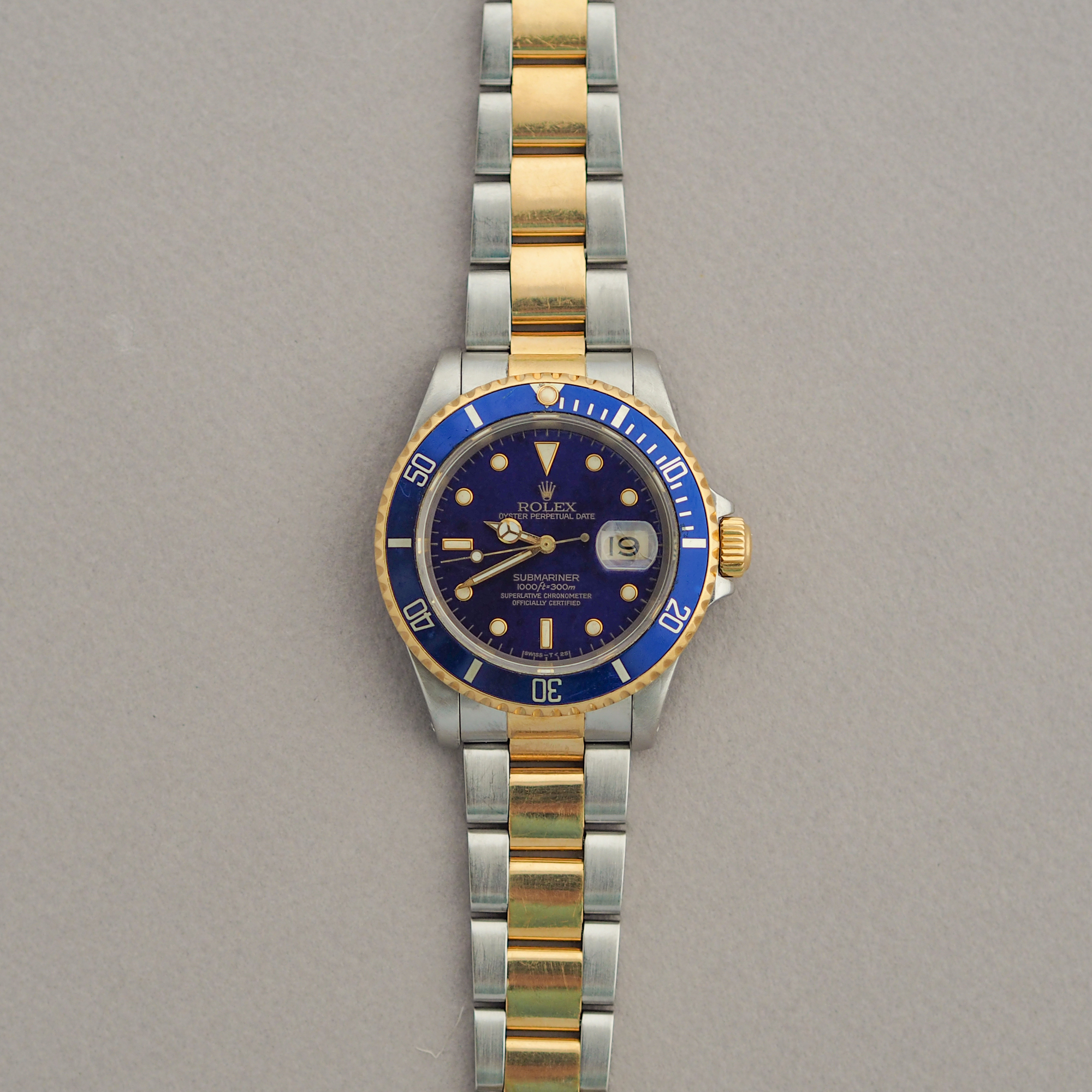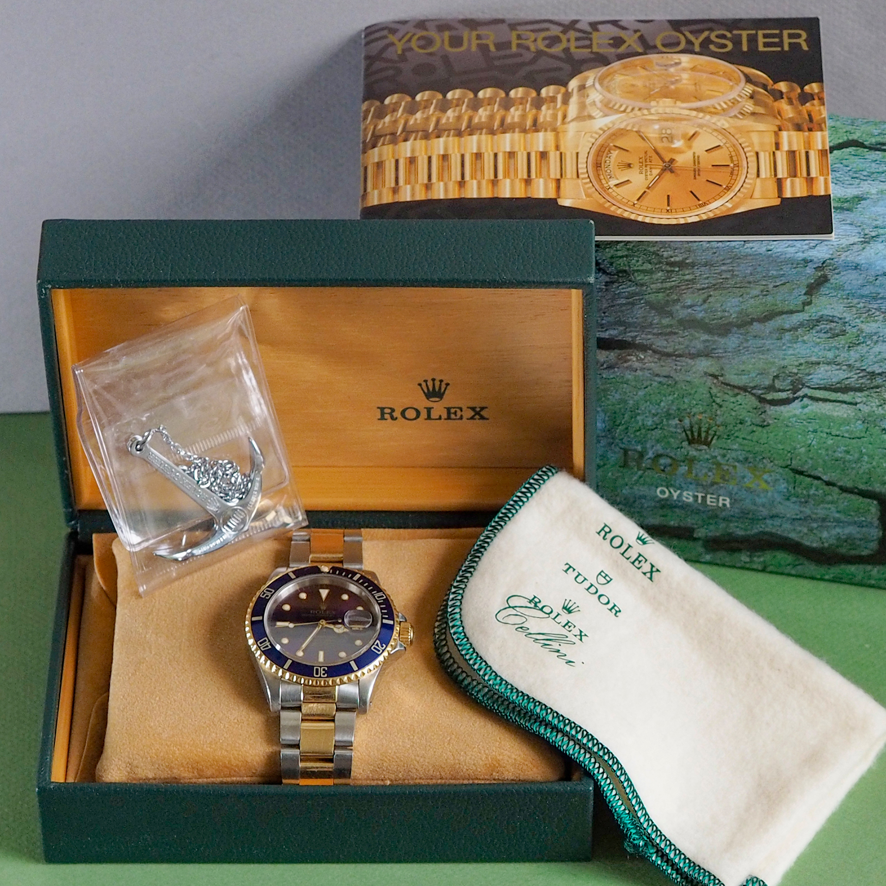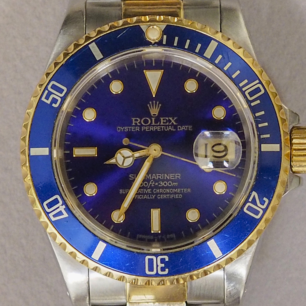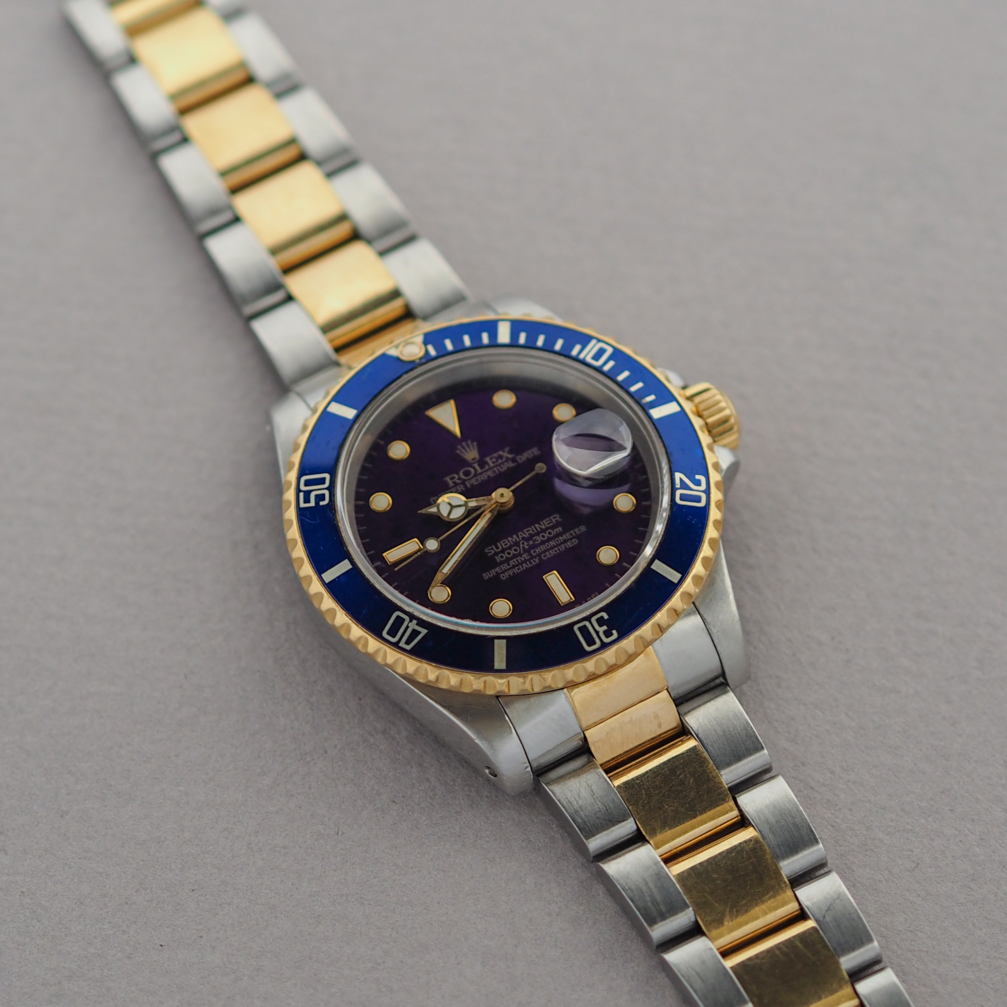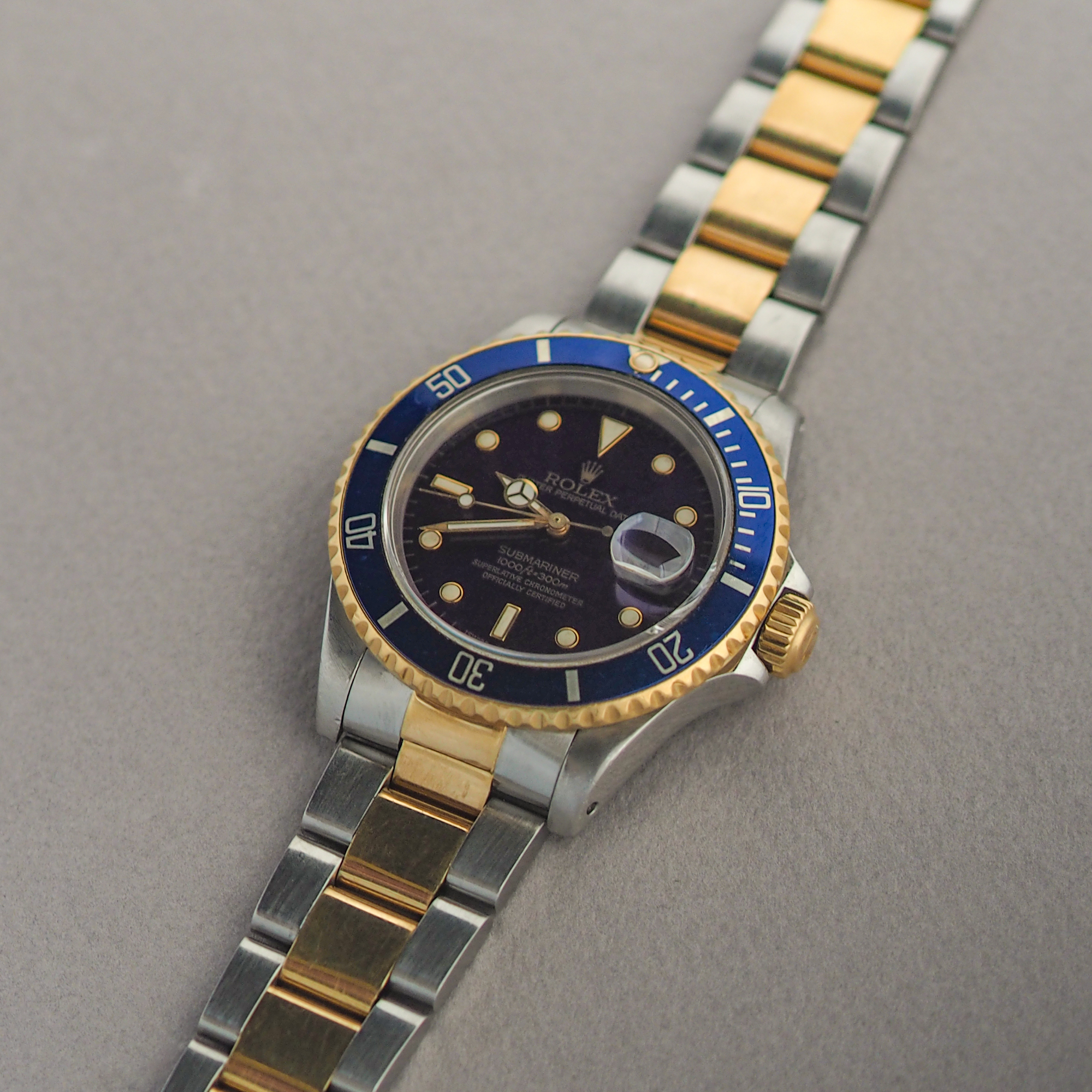 Dial: Gorgeous sunburst blue dial that transforms into an iridescent purple under certain light conditions. Many feel that the dial on the Ref. 16613, nicknamed the “Bluesy,” is one of the most beautiful examples Rolex ever made. Tritium inside the gold surrounds and handset is near perfect and totally free of discoloration.