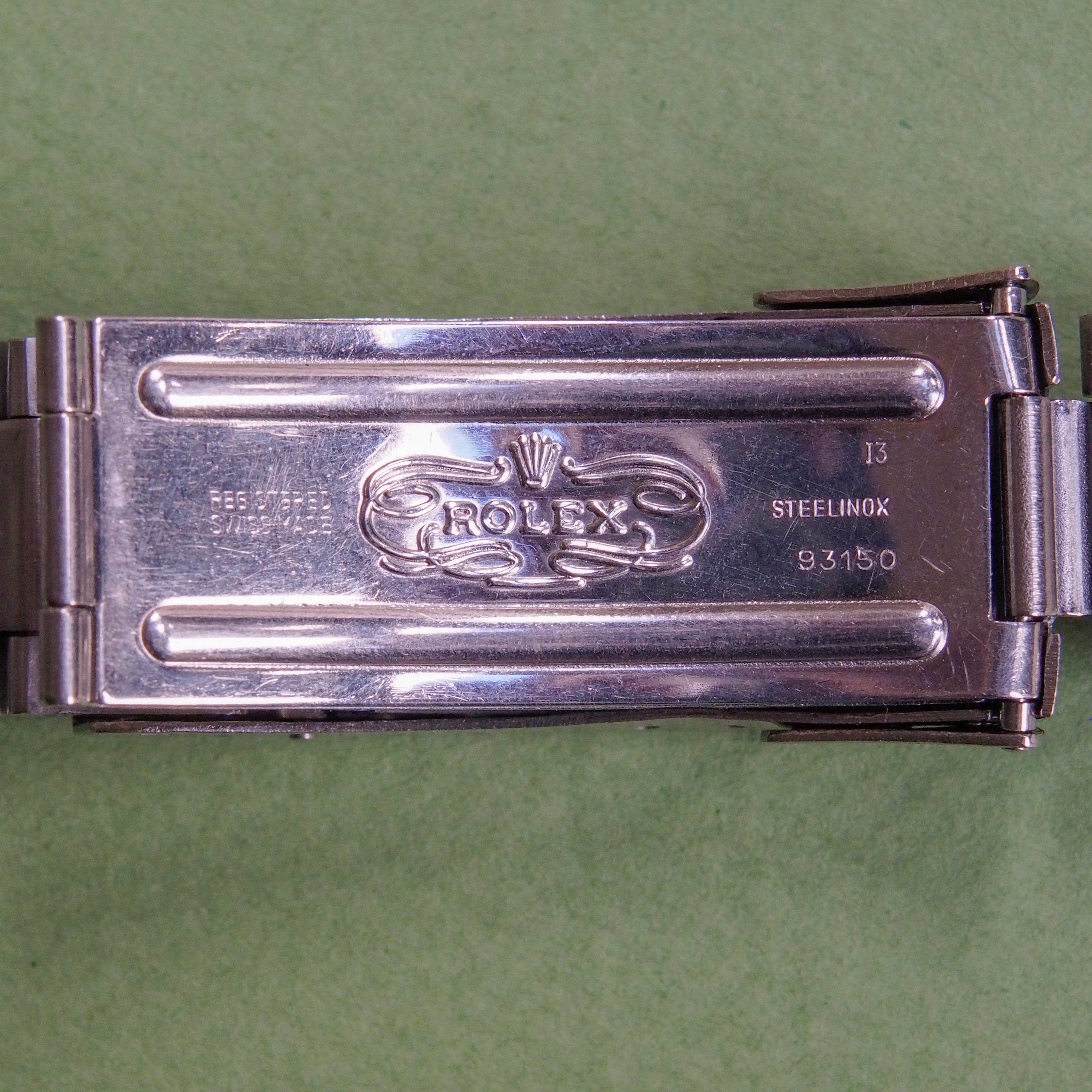 Bracelet: Original Rolex Oyster stainless steel 93150 bracelet with 593 endpieces and dive extension. Correct clasp code stamped I3. Bracelet is installed with 11 links with one extra included (never used).