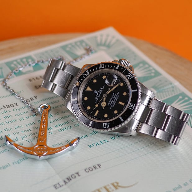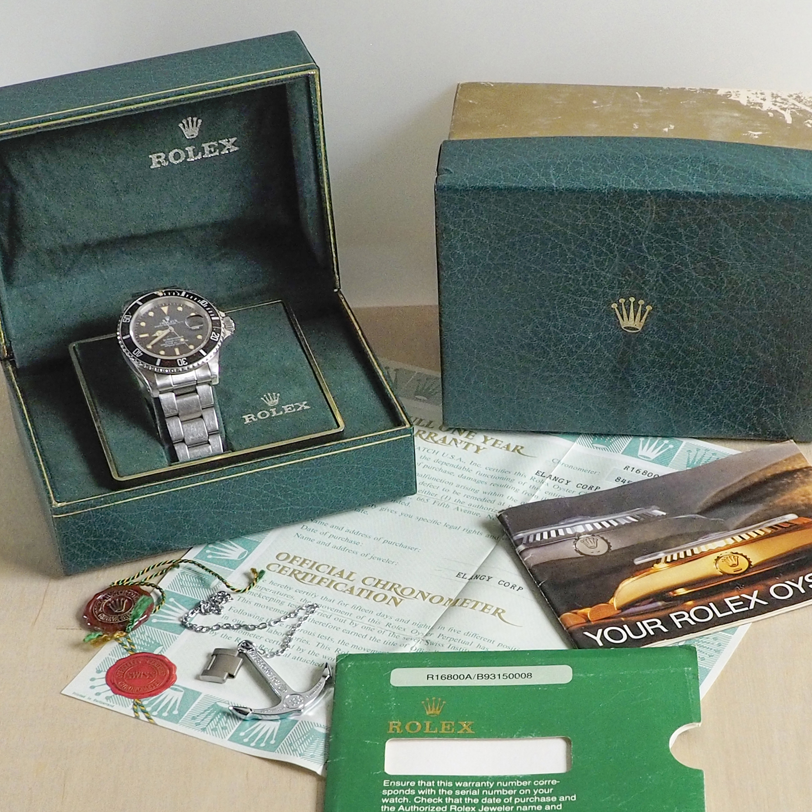 Accessories: Inner & outer boxes, warranty paper with correct Serial Number, Officially Certified Chronometer tag, Your Rolex Oyster booklet dated 1985, 1000 ft / 300 m anchor, Rolex cleaning cloth.