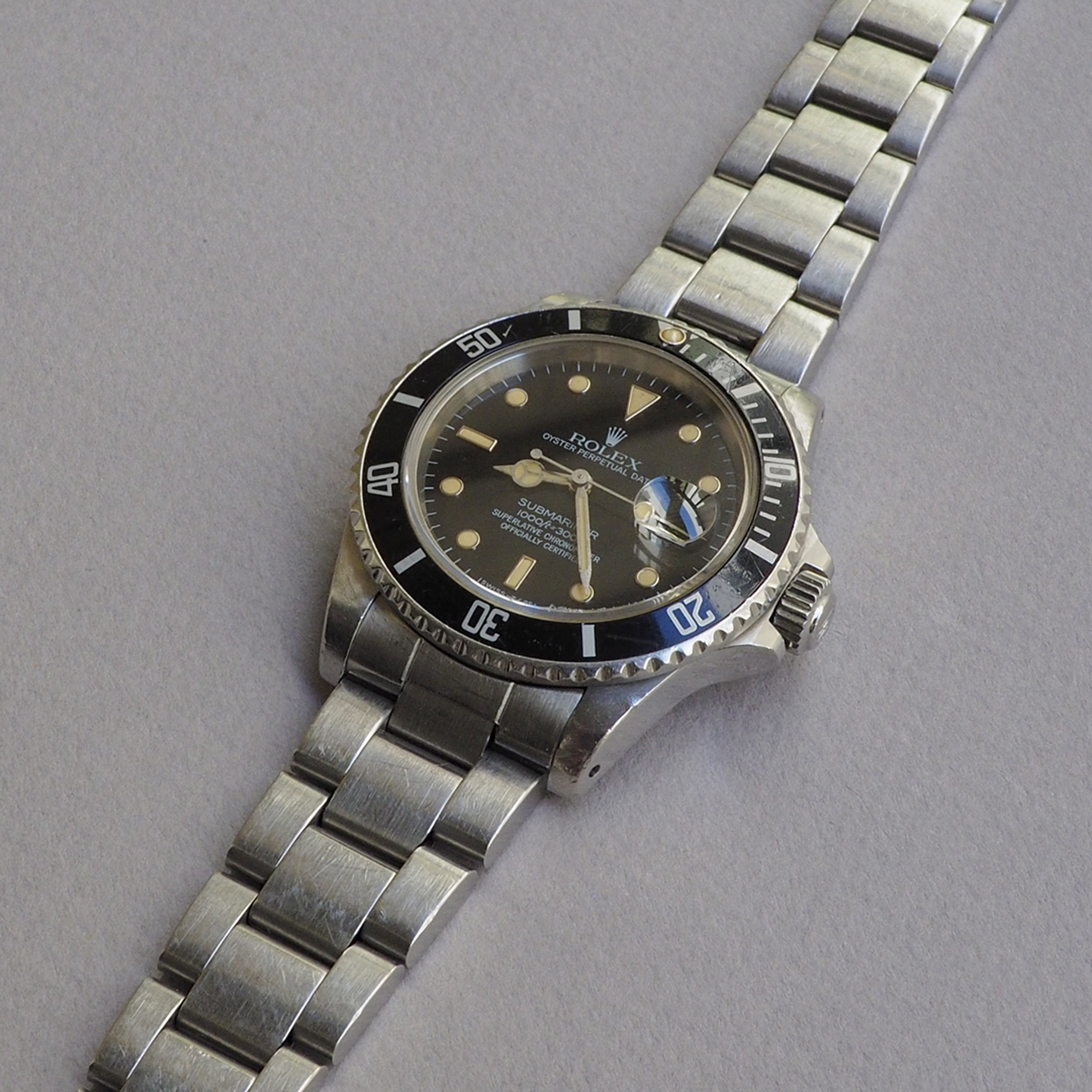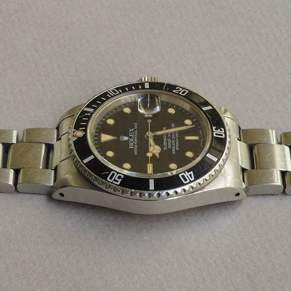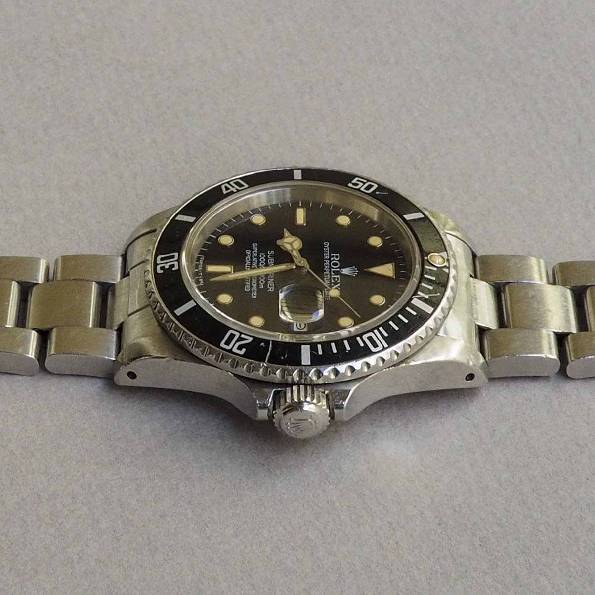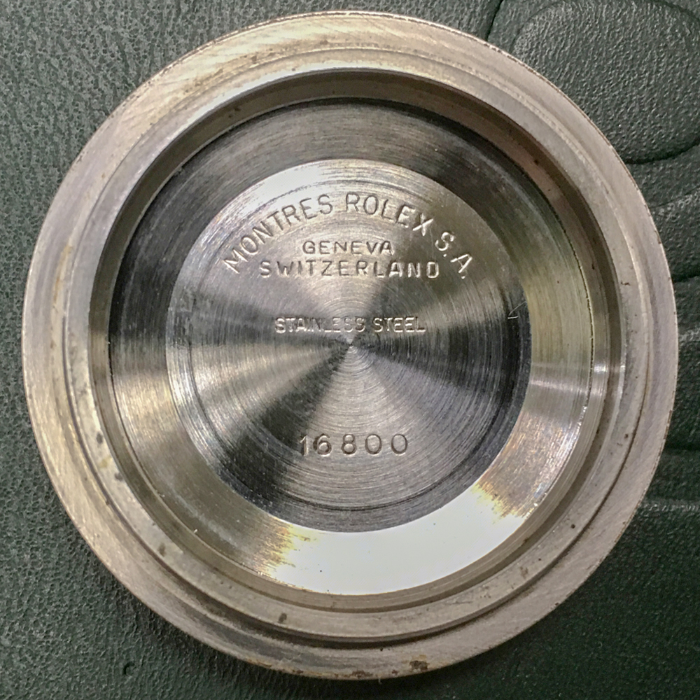 Condition / Comments: Overall condition is very good. Watch shows wear from use but it’s been taken care of, that’s plain to see. This is a beautiful 16800 with a drop dead gorgeous dial. To the naked eye one sees a mid-80s glossy black dial, but when examined under a loupe with directed light, the transformation and imperfections of the dial can be viewed. The dial is in the process of becoming matte, most noticeably at the upper half of the dial and around a few of the WG surrounds, a faint line is etched above the handset/stem, another faint line can be seen on the minute track between the 2:00 marker and the cyclops. [Refer to the high-magnification photo to see this Submariner’s unique Wabi-Sabi]. A one owner watch prior to my acquisition, this 16800 (like all the other 5-digit Rolex sports watches) is increasingly sought after. Factor in that it’s a full set and it’s been recently serviced and this one ticks all the boxes.