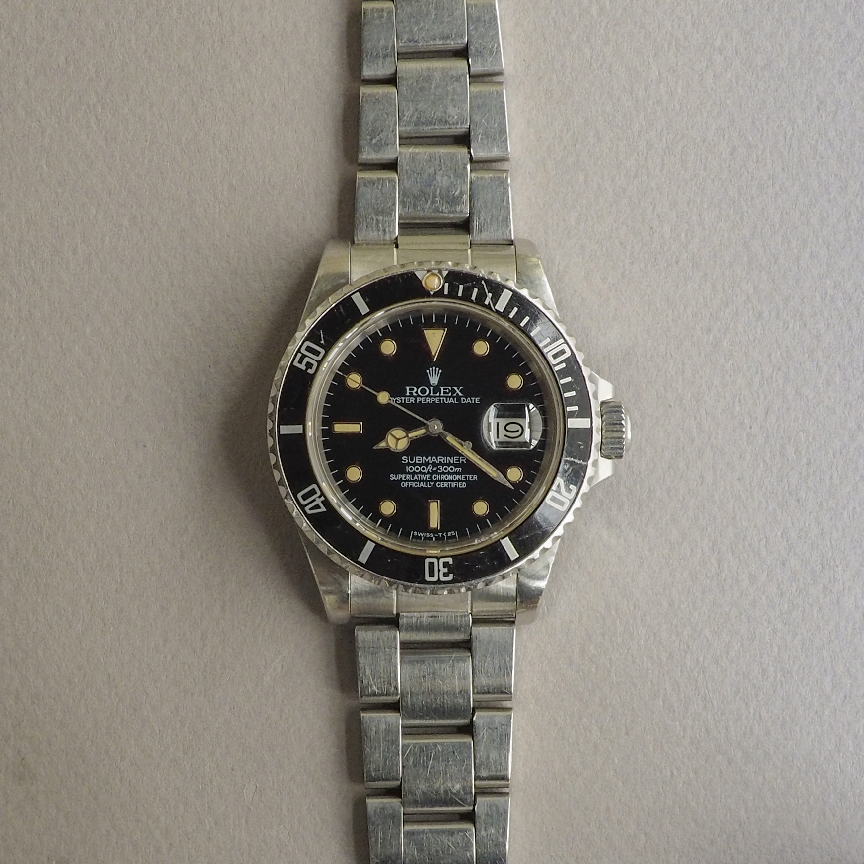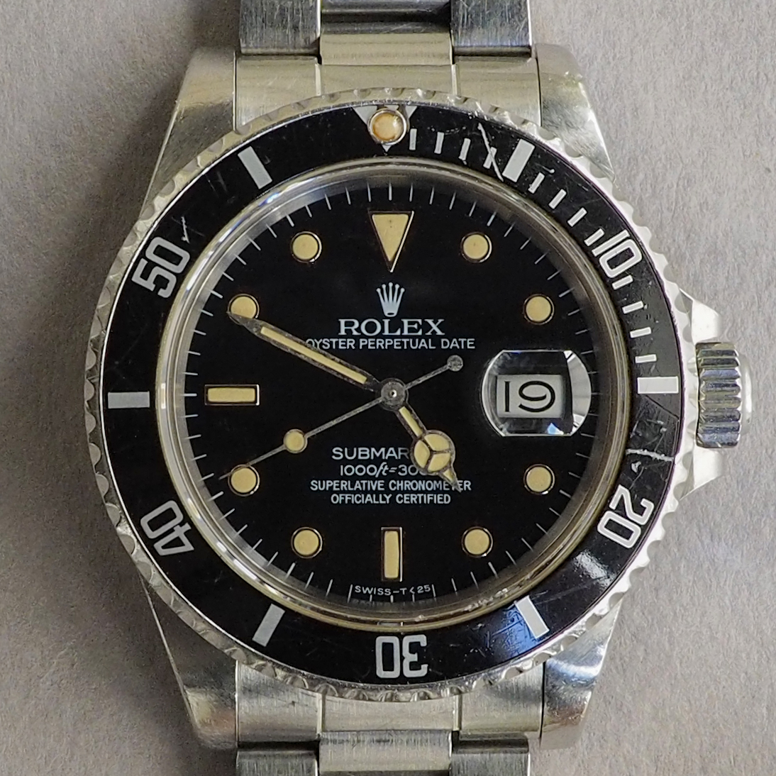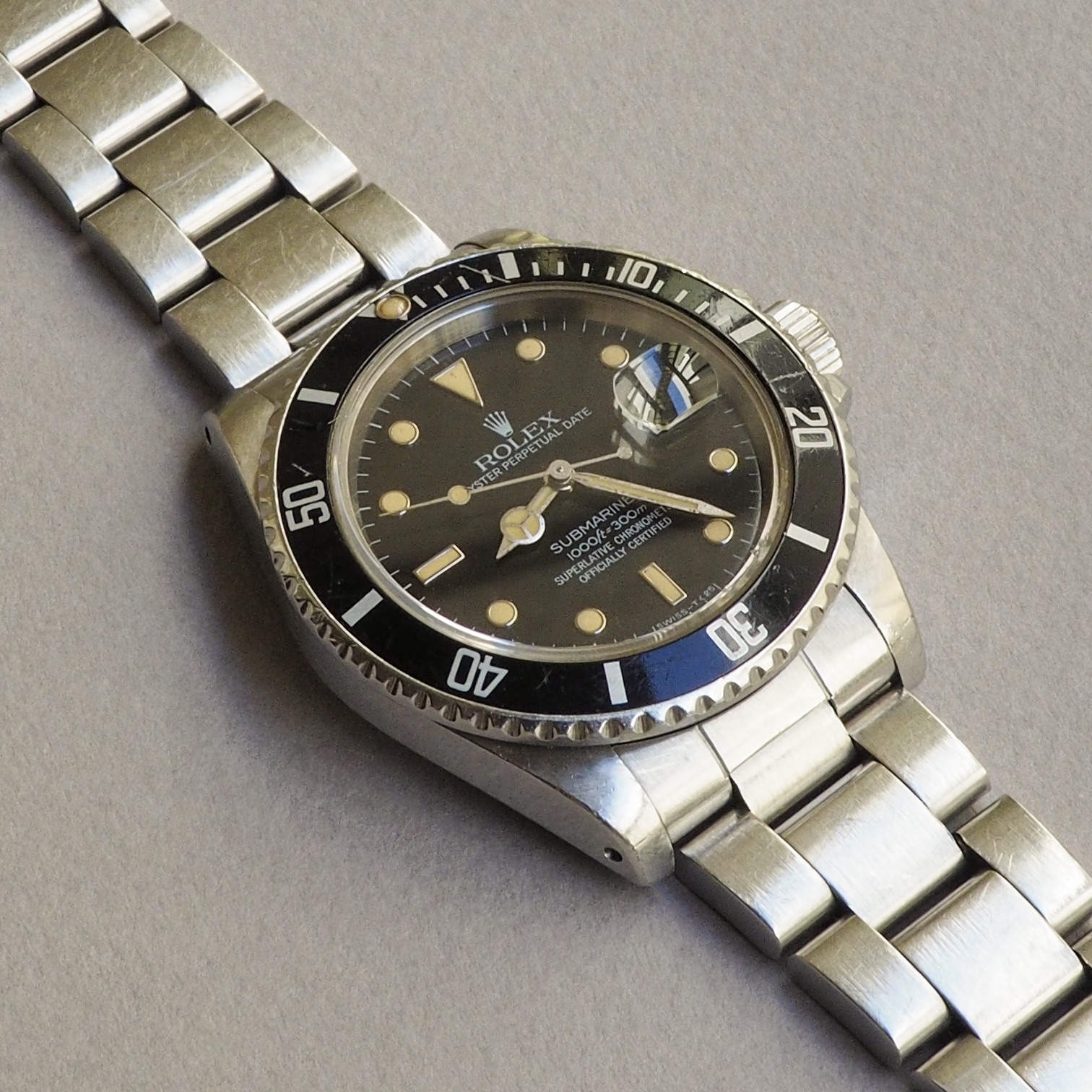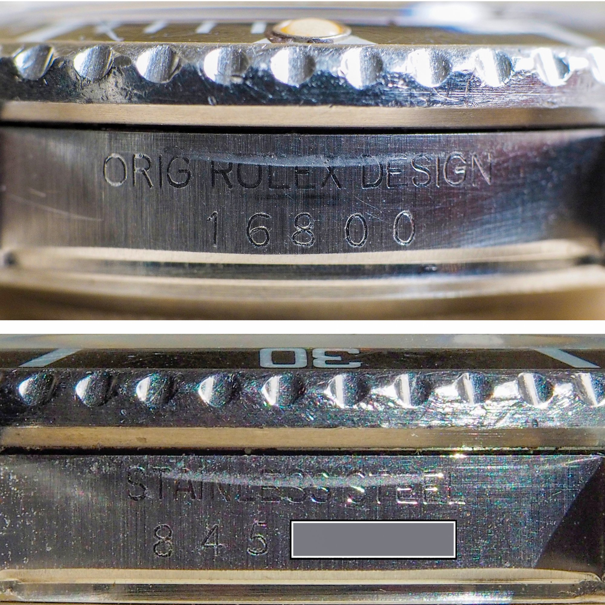 Condition / Comments: Overall condition is very good. Watch shows wear from use but it’s been taken care of, that’s plain to see. This is a beautiful 16800 with a drop dead gorgeous dial. To the naked eye one sees a mid-80s glossy black dial, but when examined under a loupe with directed light, the transformation and imperfections of the dial can be viewed. The dial is in the process of becoming matte, most noticeably at the upper half of the dial and around a few of the WG surrounds, a faint line is etched above the handset/stem, another faint line can be seen on the minute track between the 2:00 marker and the cyclops. [Refer to the high-magnification photo to see this Submariner’s unique Wabi-Sabi]. A one owner watch prior to my acquisition, this 16800 (like all the other 5-digit Rolex sports watches) is increasingly sought after. Factor in that it’s a full set and it’s been recently serviced and this one ticks all the boxes.