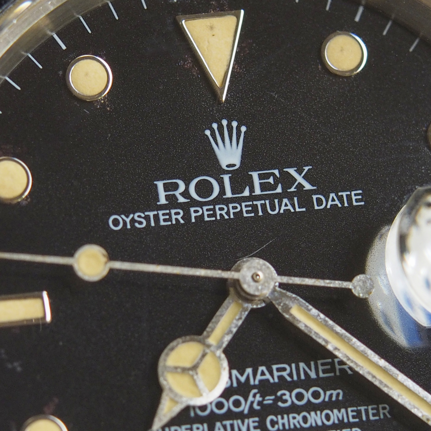 Dial: Original, untouched glossy black dial with white gold surrounds. Tritium lume is displaying a beautiful creamy patina. Open 6 / 9 date wheel.