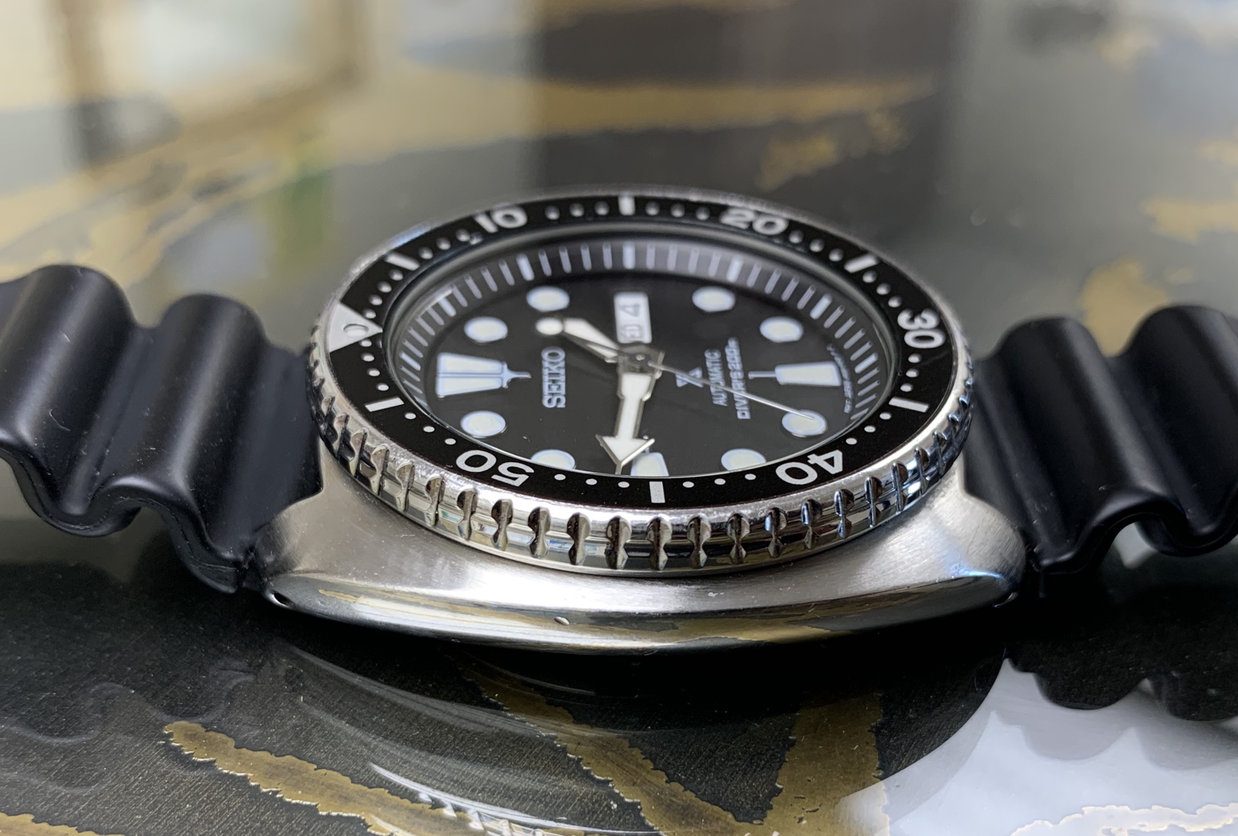 Case: Stainless steel 45mm (excluding crown). Retains original factory finish and has signs of wear as seen in photos. Unidirectional black bezel functions as designed.