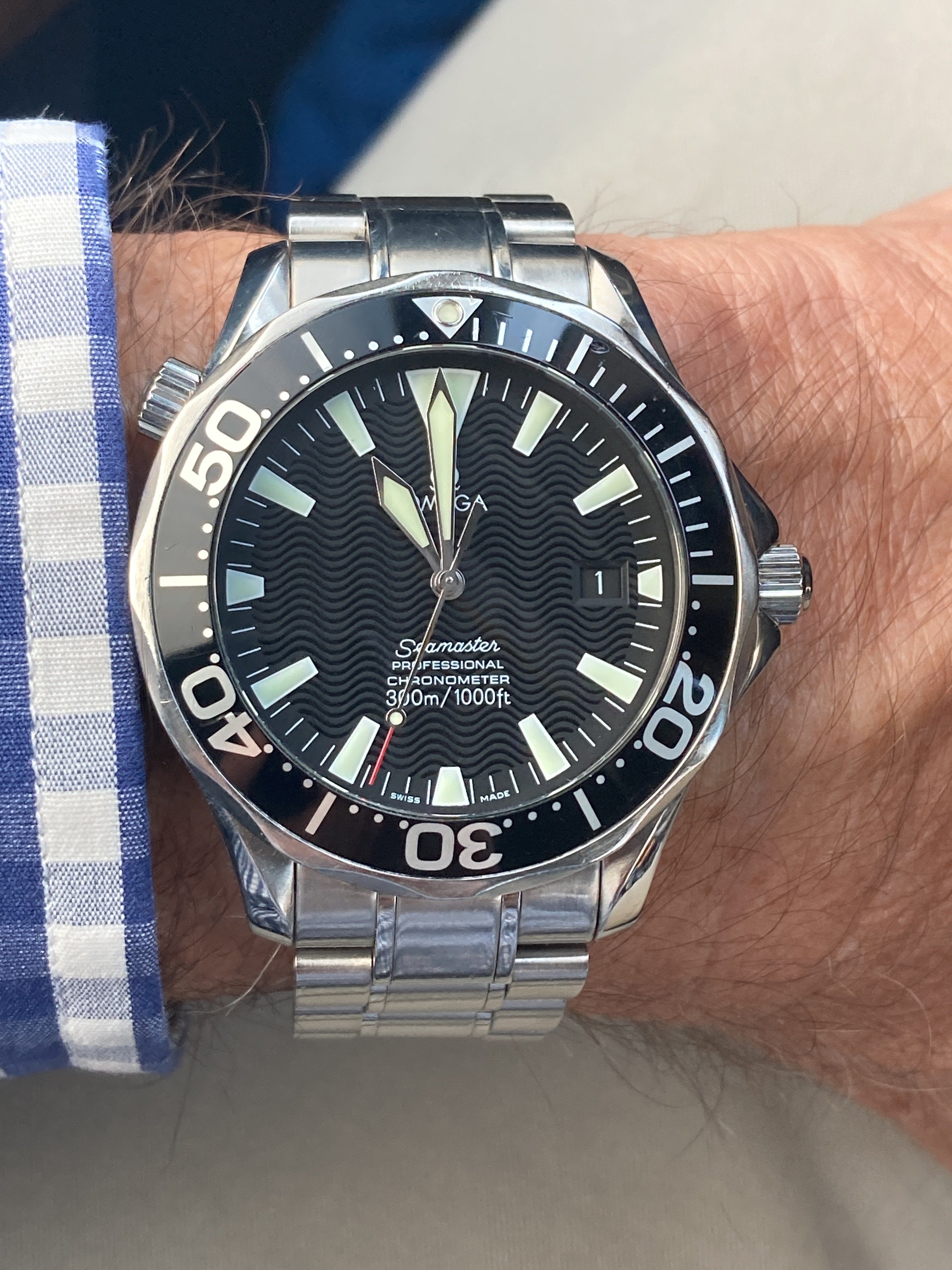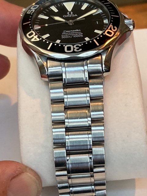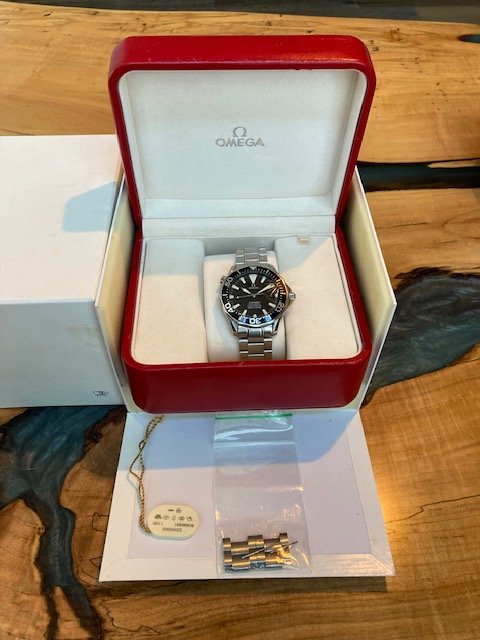 Up for sale is my 2006 Omega Seamaster 300M automatic full size 41mm case on SS bracelet with all links but fitted for 7.25. Keeping good time and all functions working as they should. Sapphire crystal is clean Bezel shows blemishe At 1 o’clock Great Lume! Comes with box and papers and hang tag!! Please ask any questions you may have. Im asking $2350.00 USD via PayPal shipping included! Check my feedback!!