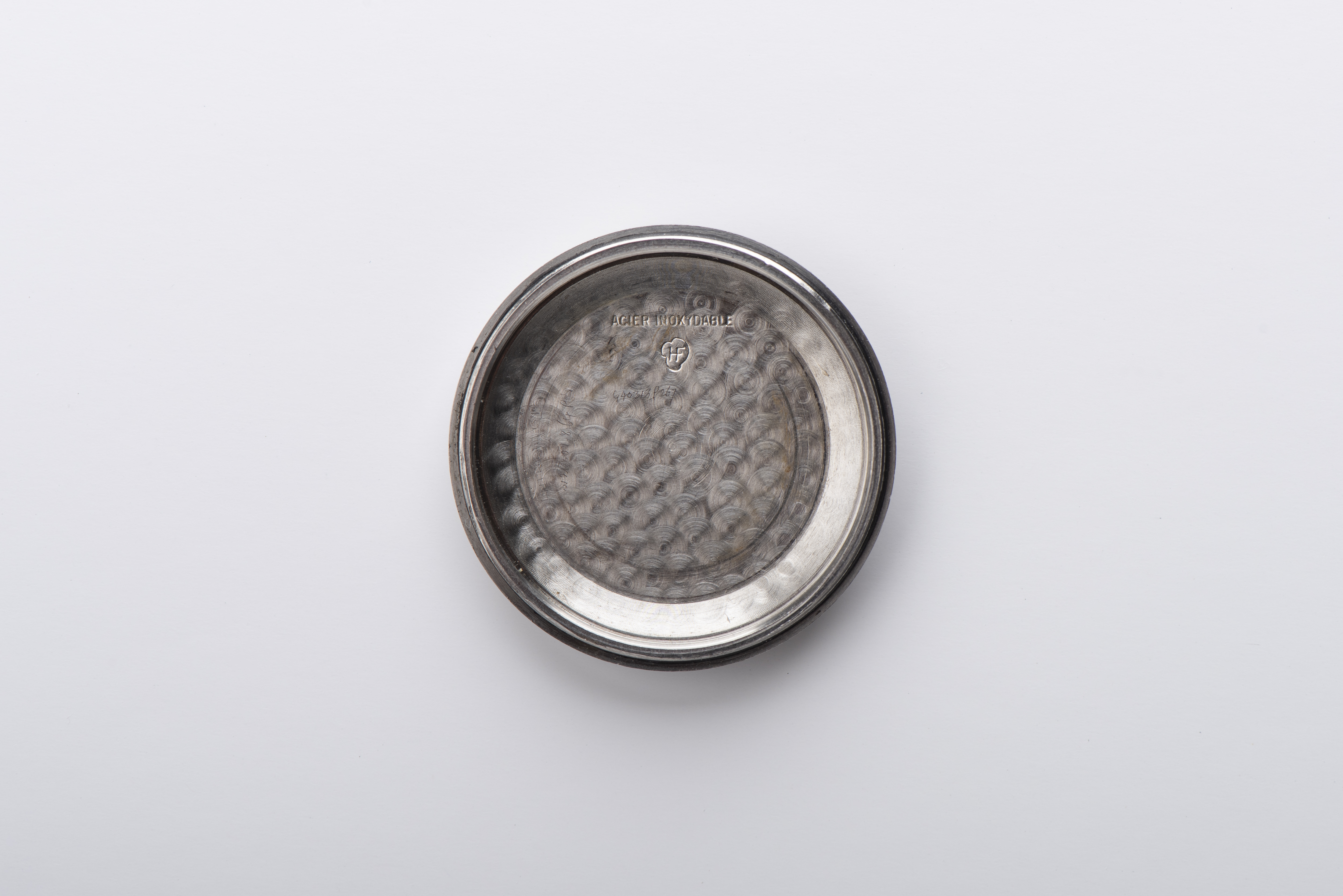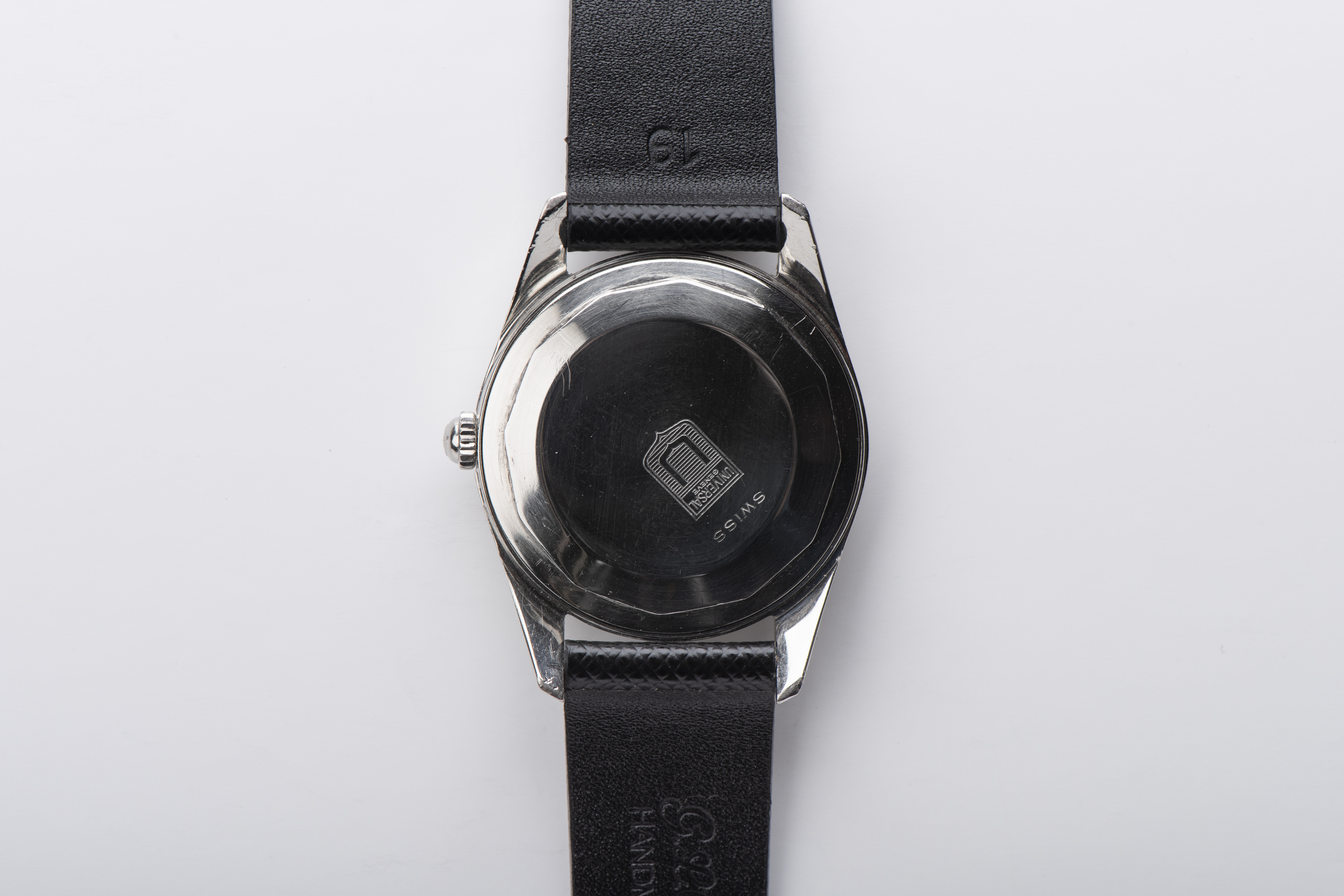 Case: 35.5mm. Huguenin Freres ‘HF’ stainless steel case. Bombe lugs. 19mm lug width. Signed crown. Case back with engraved logo and case reference and serial numbers.