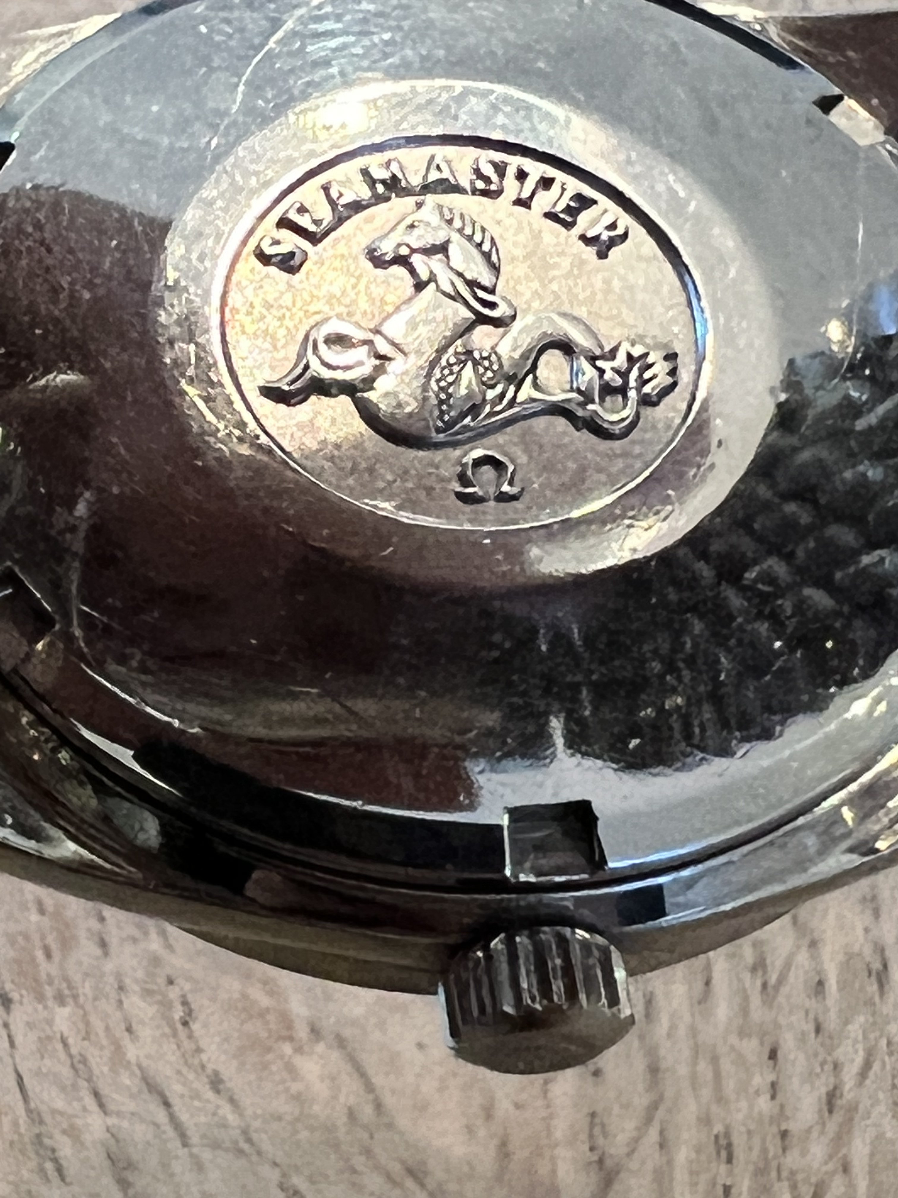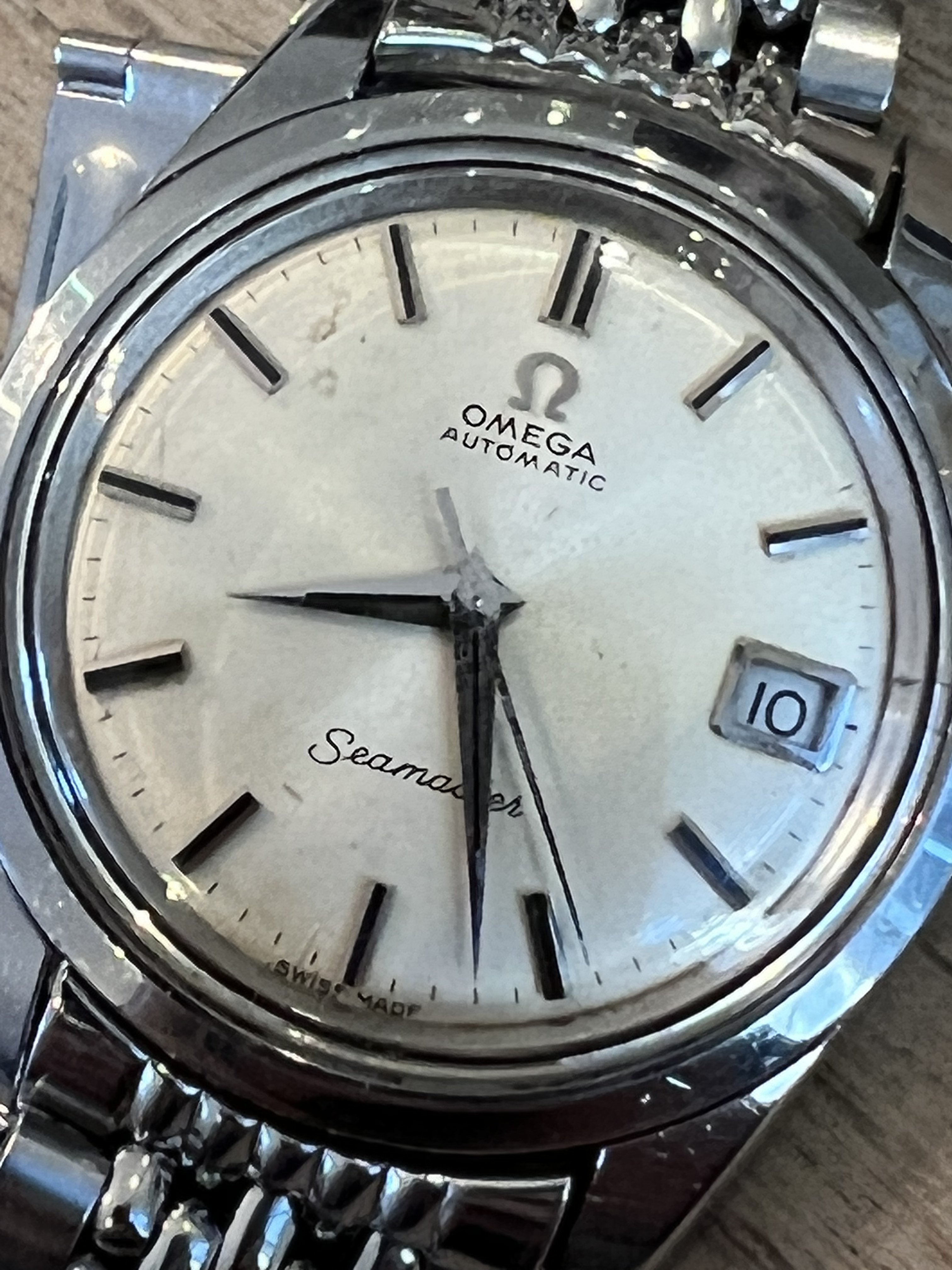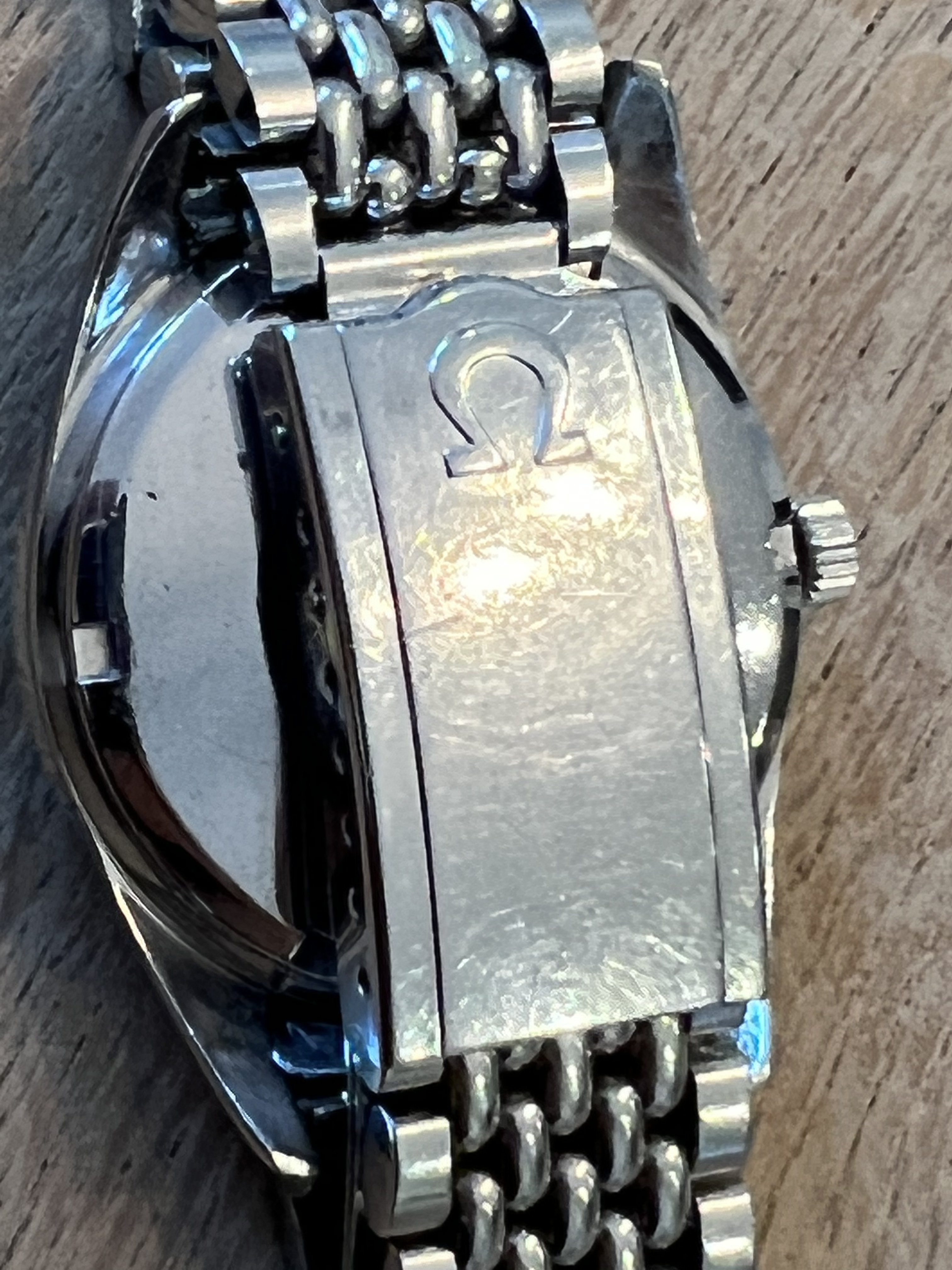 The case and lugs are very thick, the crystal and bracelet are original (crystal has hard to see Omega logo etched in the center). Dial has some patina.