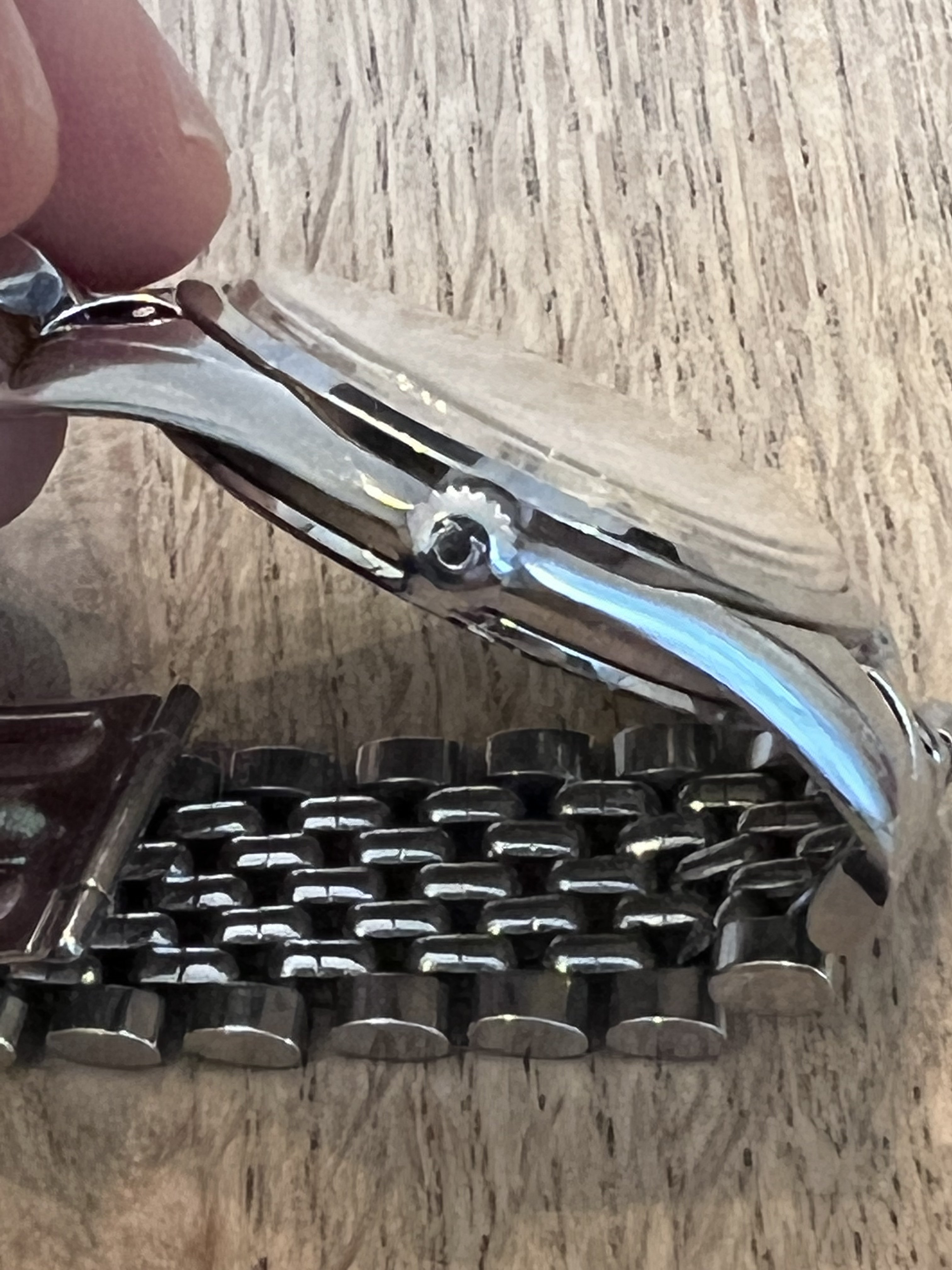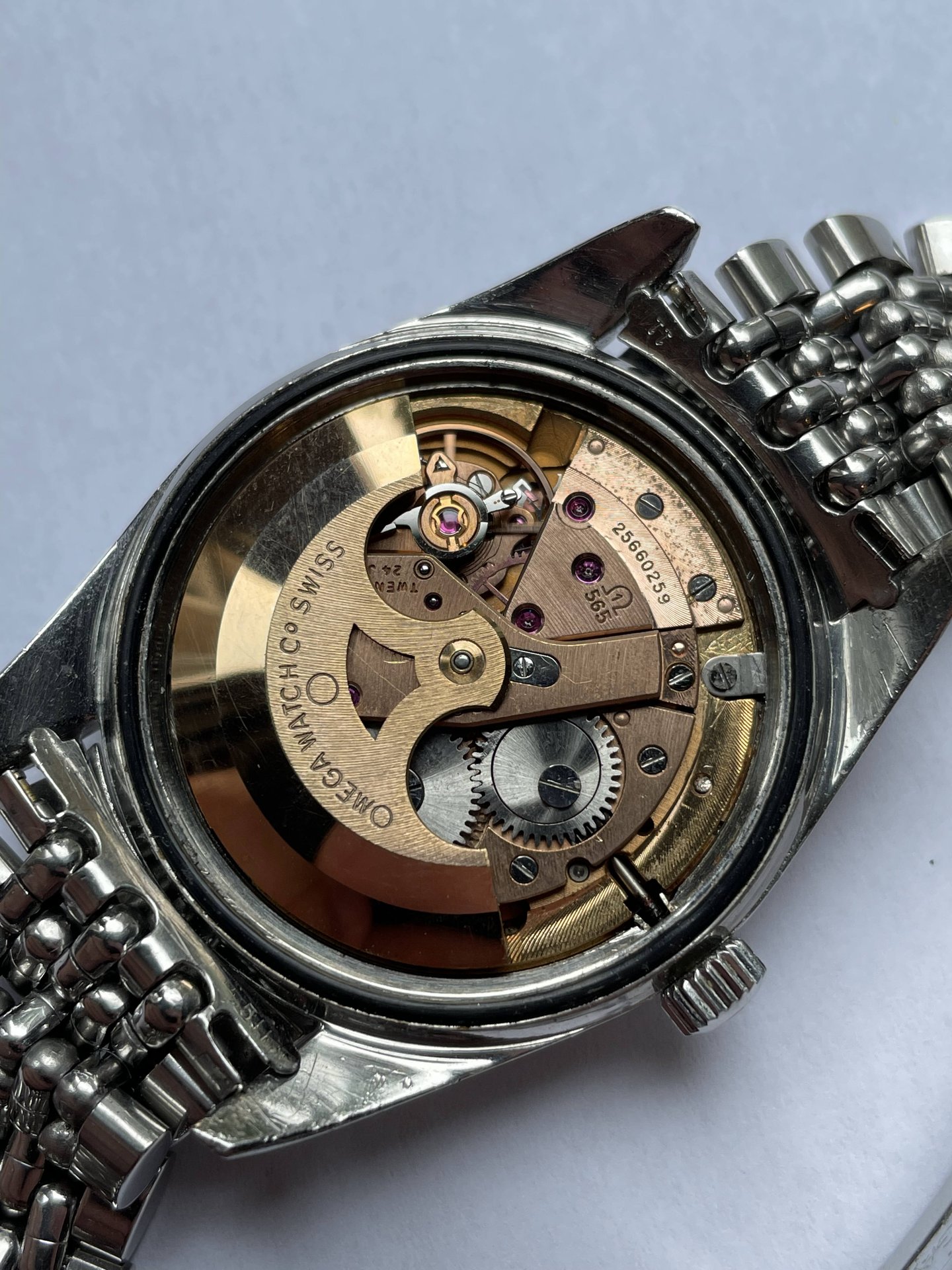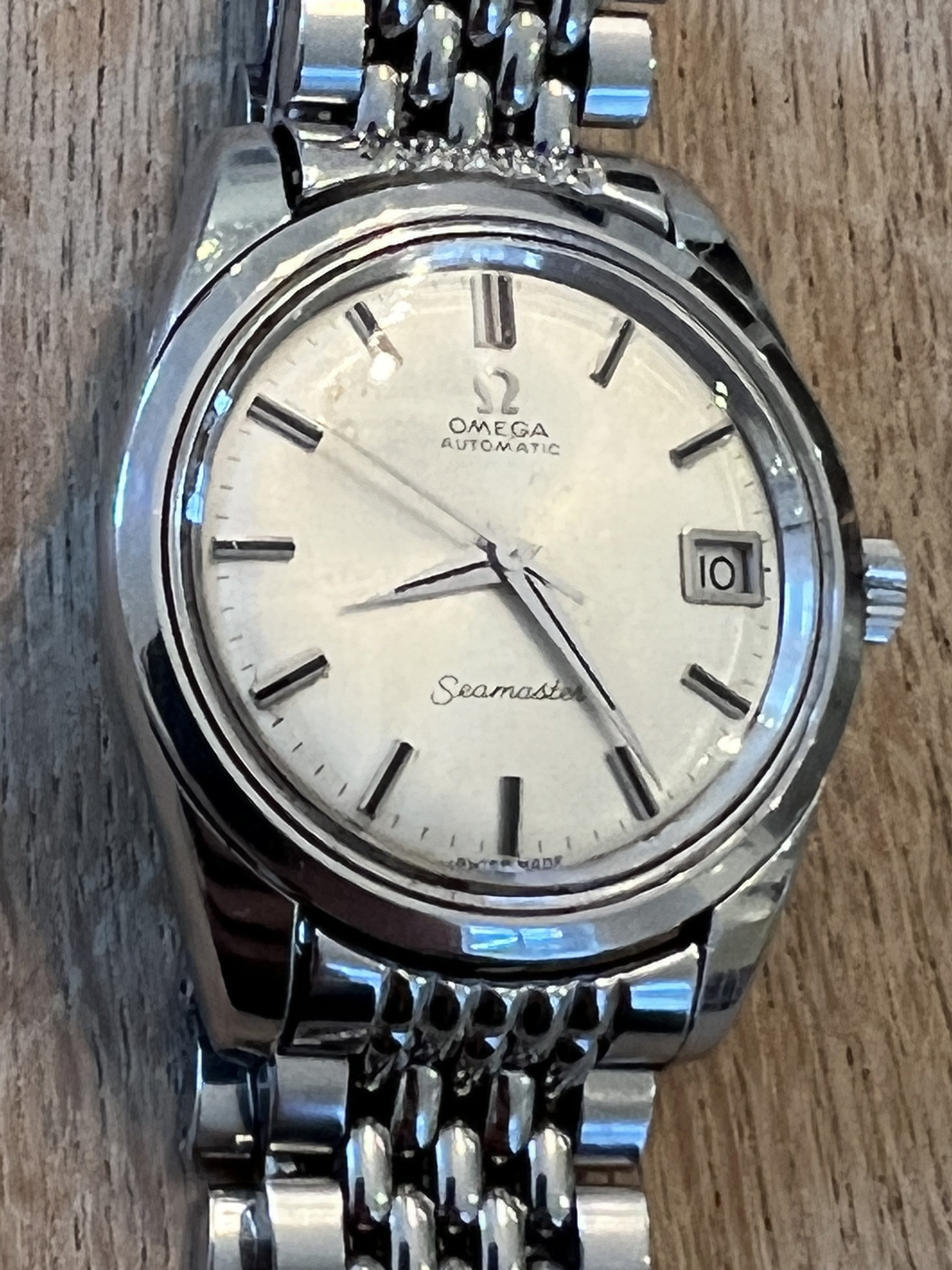 The case and lugs are very thick, the crystal and bracelet are original (crystal has hard to see Omega logo etched in the center). Dial has some patina.