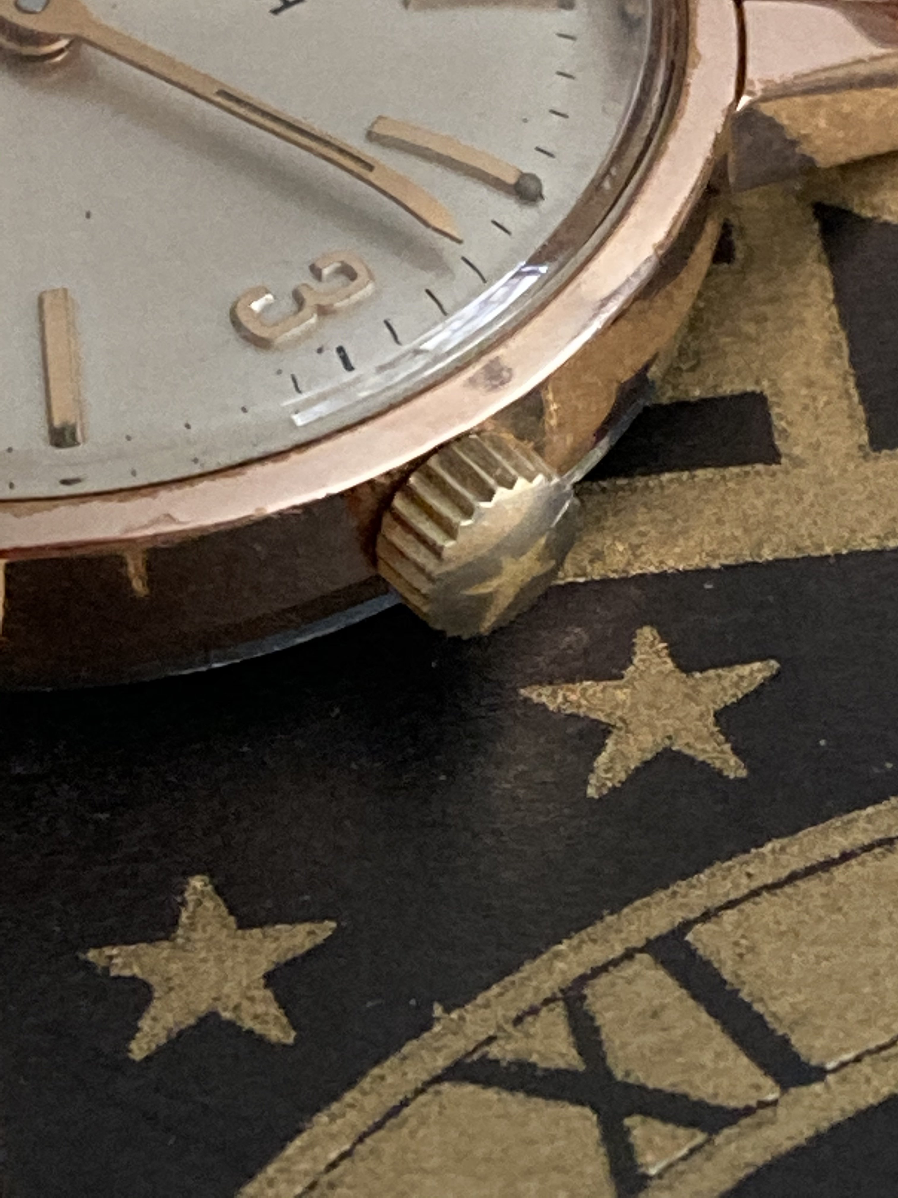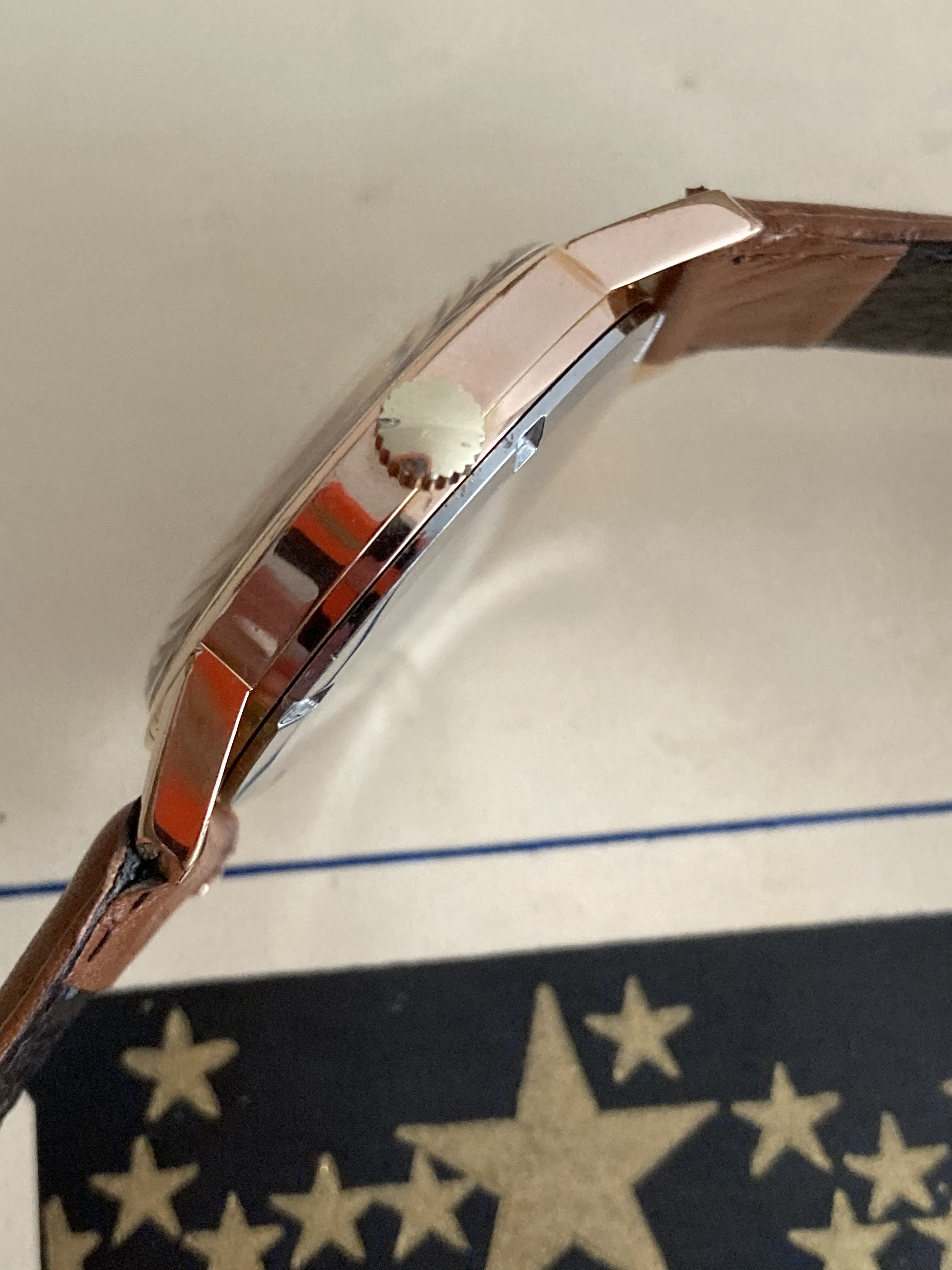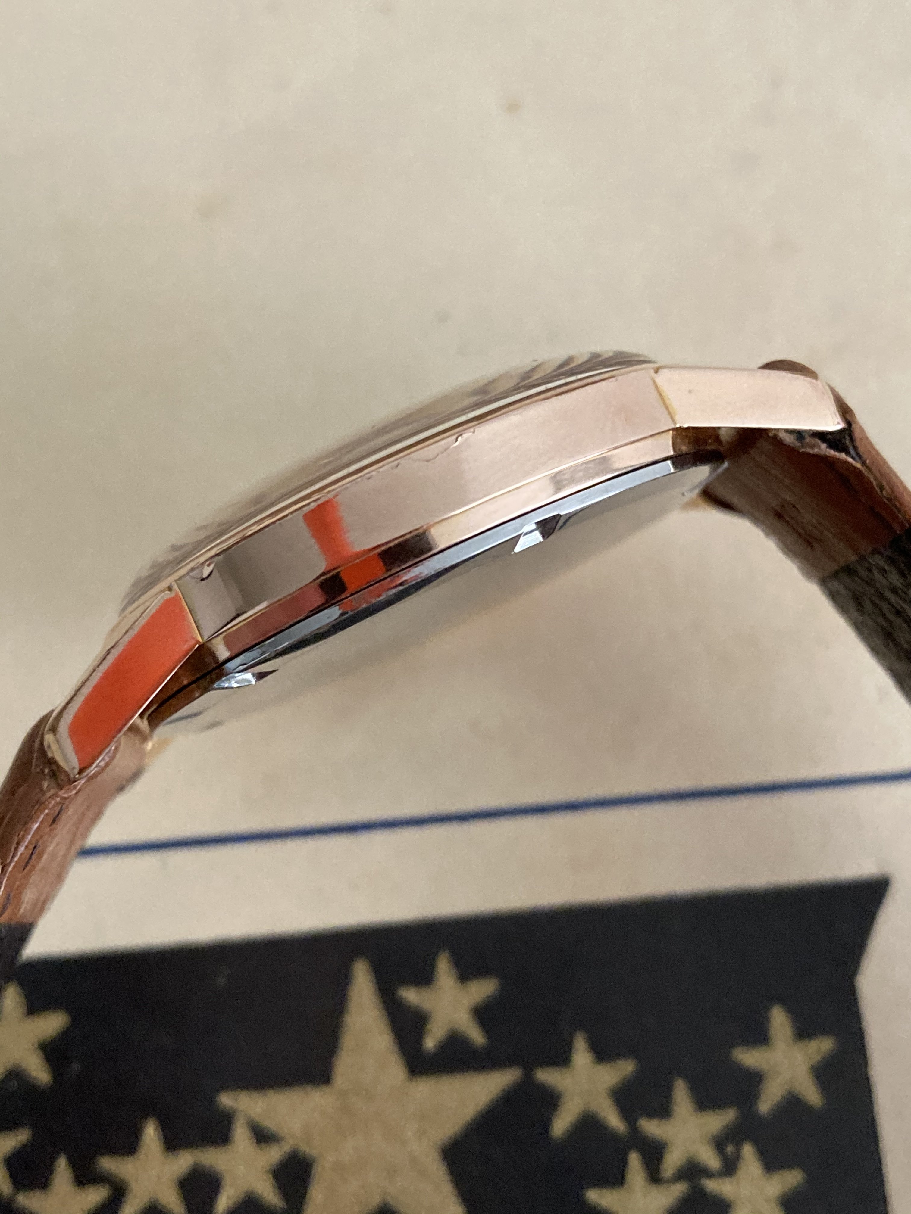 ·A nice early to mid 60s Rose gold plated Cal 2531 in very good condition with only a hint of gold loss. 33mm Case with nice defined edges. Very clean movement. Unsigned crown and buckle and generic strap. There’s still a faint glow from the lume on the hands which may be more visible to someone with better eyes. Now I know why my parents hated driving at night. Would like this to stay here in the OF family. $225 shipped in the US. Anywhere else will be the buyers expense.