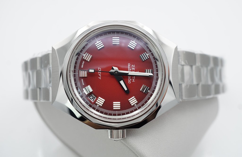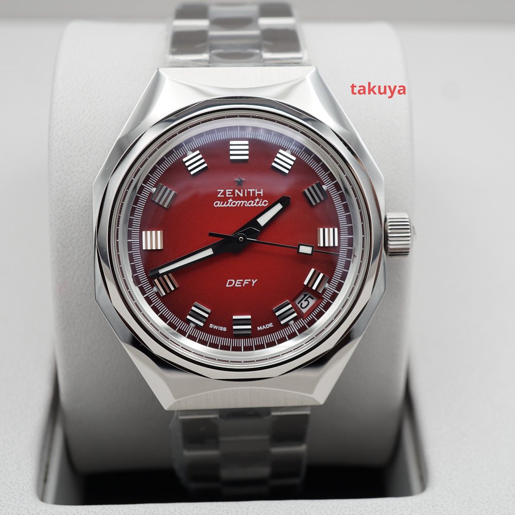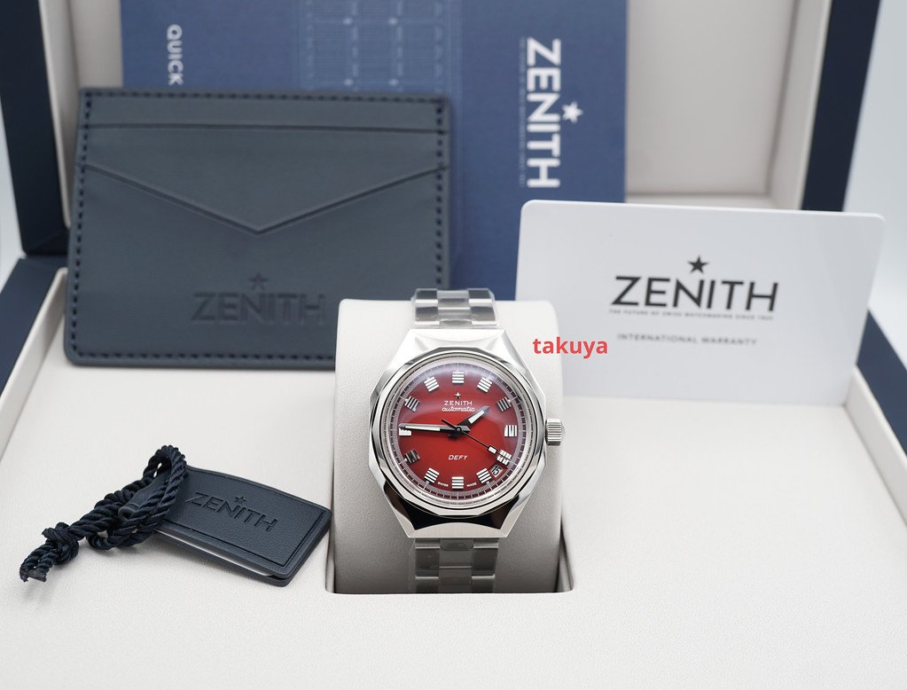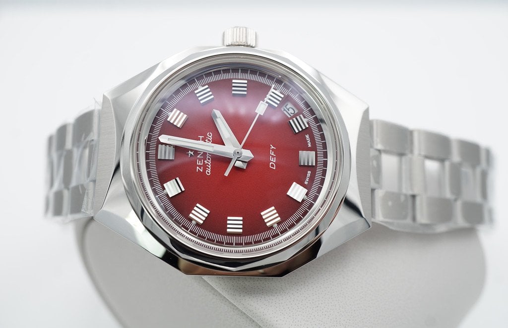 A Brand New in Box & Beautiful 37mm Zenith Defy Revival A3691 Automatic with Deep Red gradient-effect Dial. Stainless Steel with Ladder Bracelett. Purchased from Zenith Authorized Dealer in 04.2023. Never Worn & Never Sized with Stickers Intact. Full Set & 3 Years Factory Warranty.