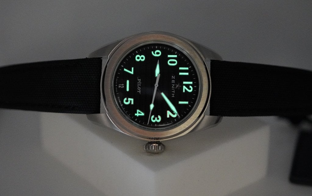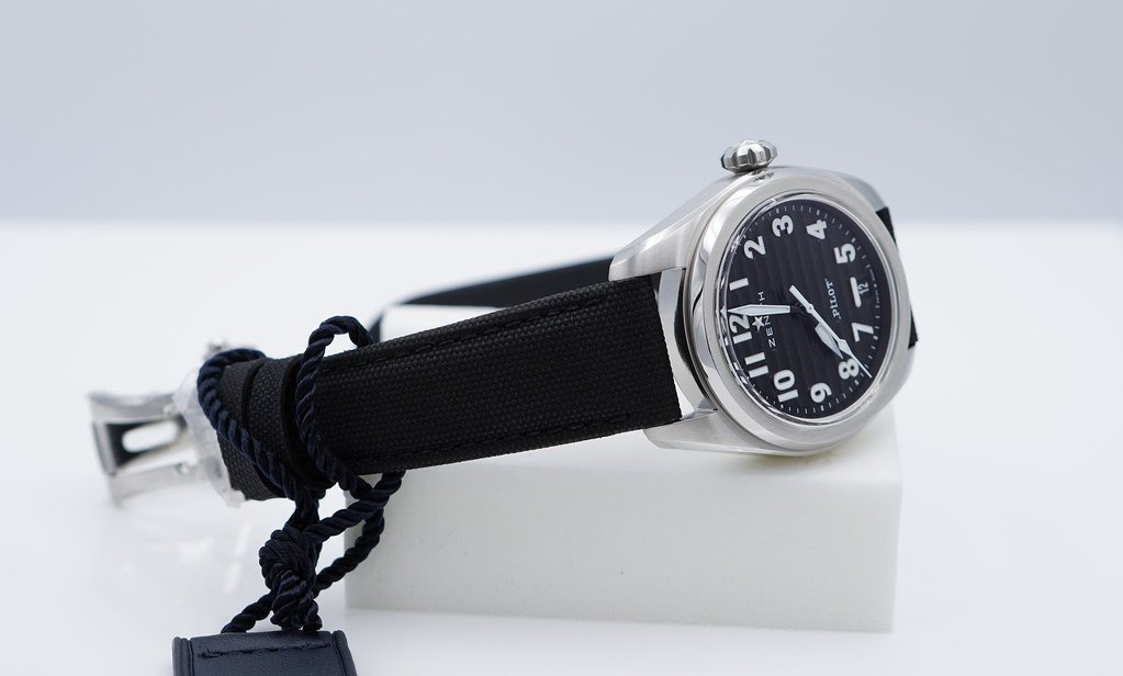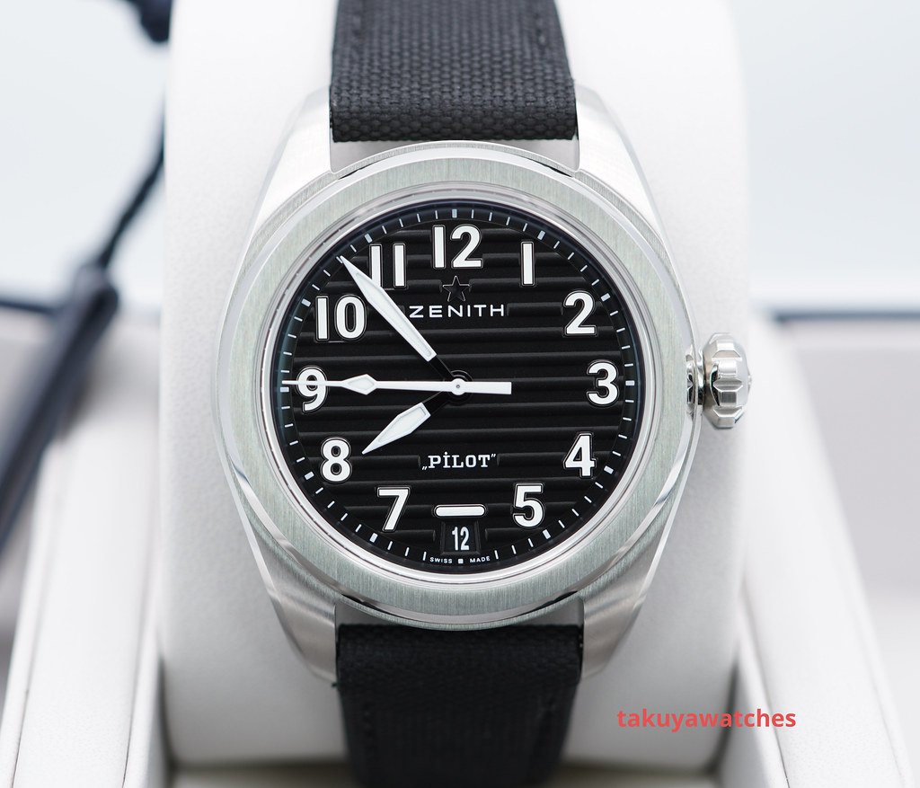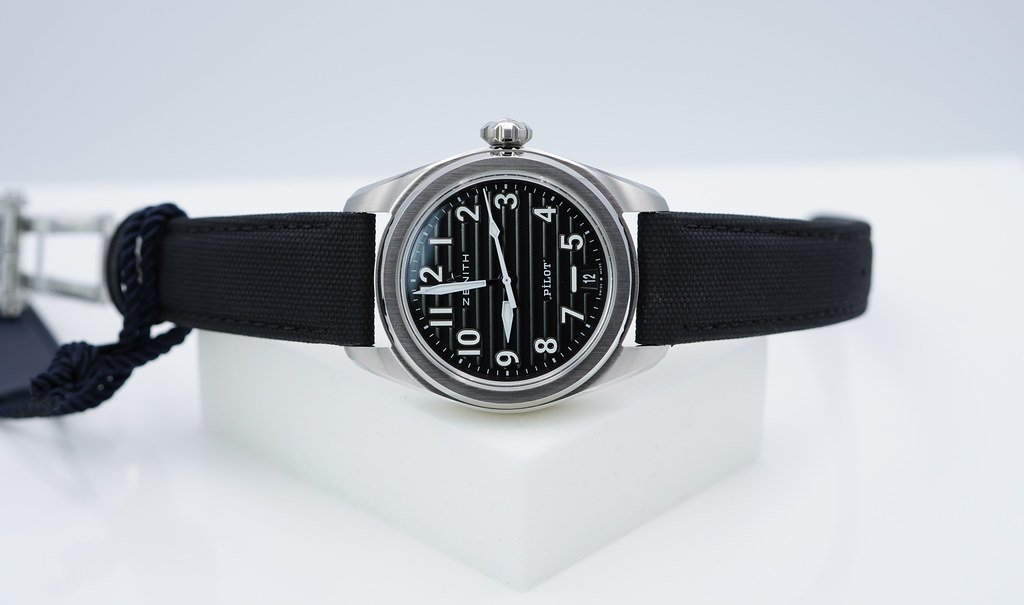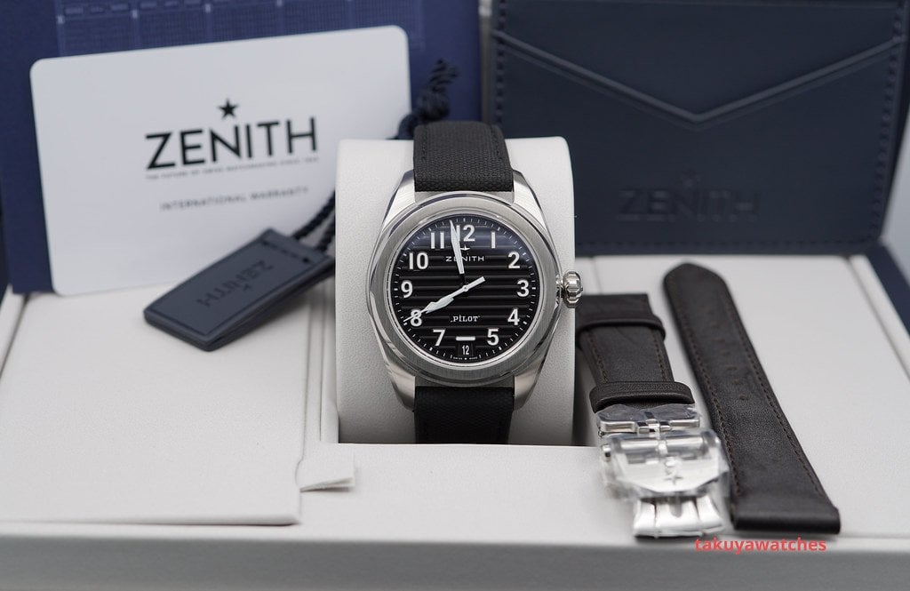 A Brand New In Box & Very Beautiful 40mm Zenith Pilot Automatic Stainless Steel with Black Dial. Zenith Calibre El Primero 3620 Automatic Movement. It comes with interchangeable black cordura-effect rubber strap and brown calfskin leather strap. Purchased from Zenith Authorized Dealer in 02.2024. Unworn. Full Set & 3 Years Factory Warranty.