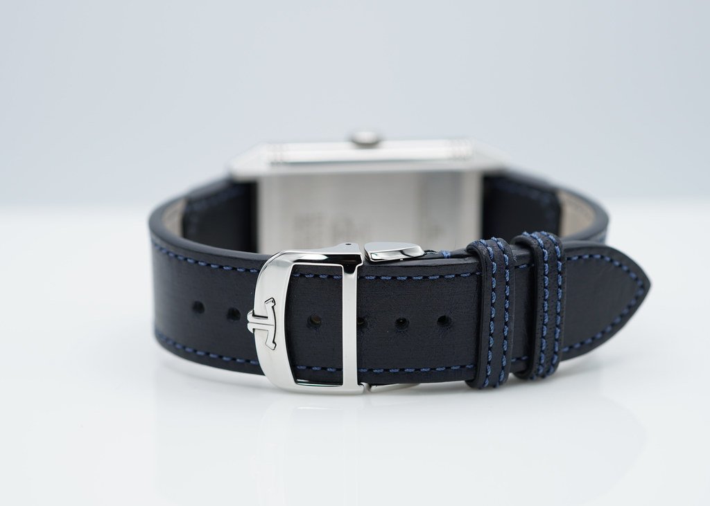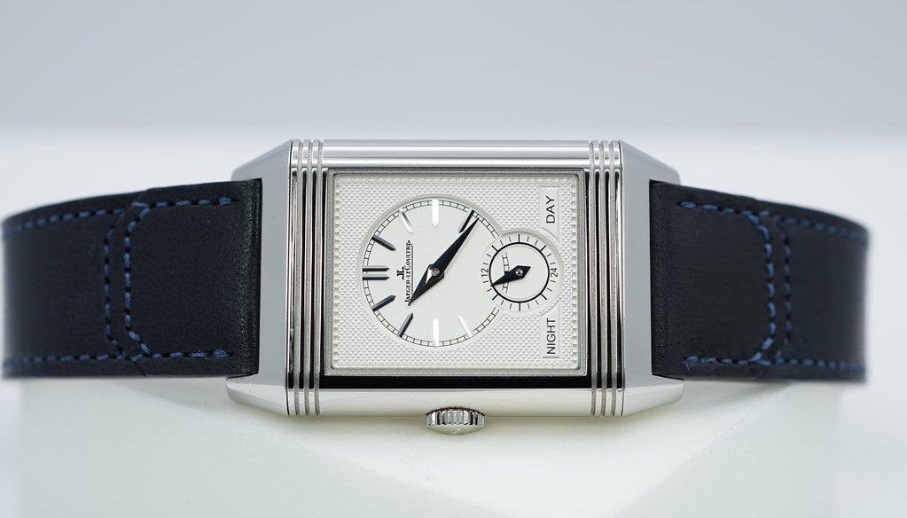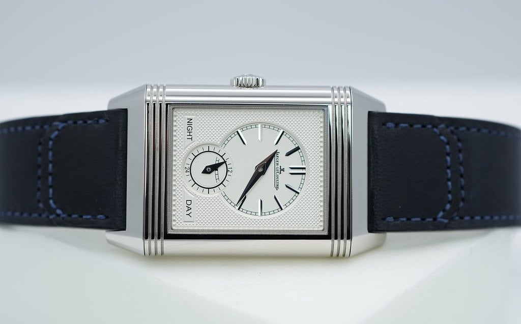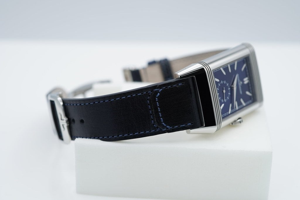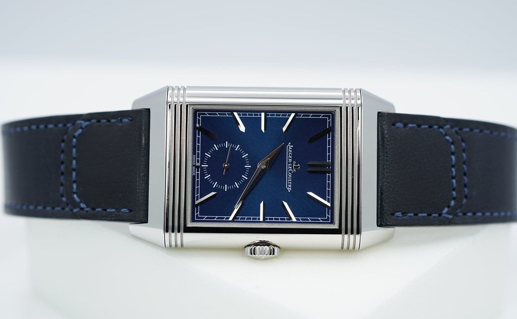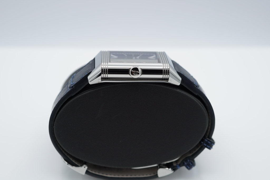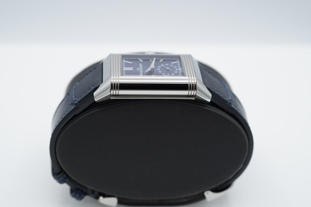 An Excellent, Unpolished Condition & Very Beautiful 47mm x 28.3mm Jaeger LeCoultre 3988482 Reverso Tribute Duoface with Blue Sunburst Front Dial & Slivered Grey Back Dial, Manual Winding Movement, Stainless Steel Case on Dark Blue Leather Strap with Stainless Steel Buckle. Purchased from JLC Authorized Dealer in 11.2021. Watch running perfect with Non Issues. Full Set & Under 8 Years Factory.