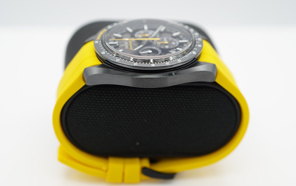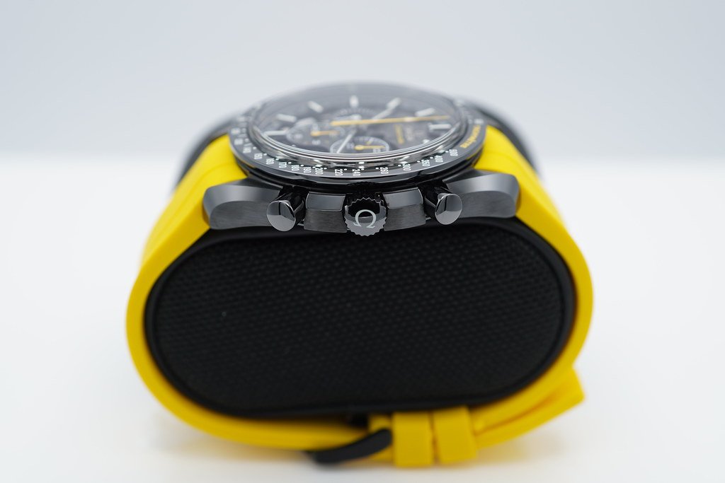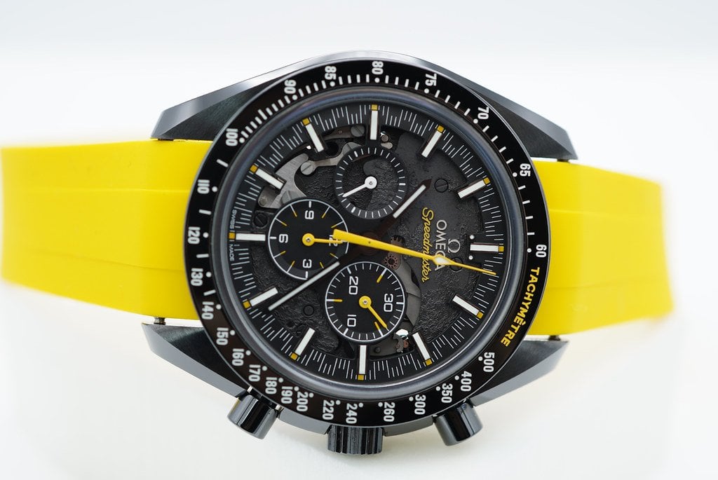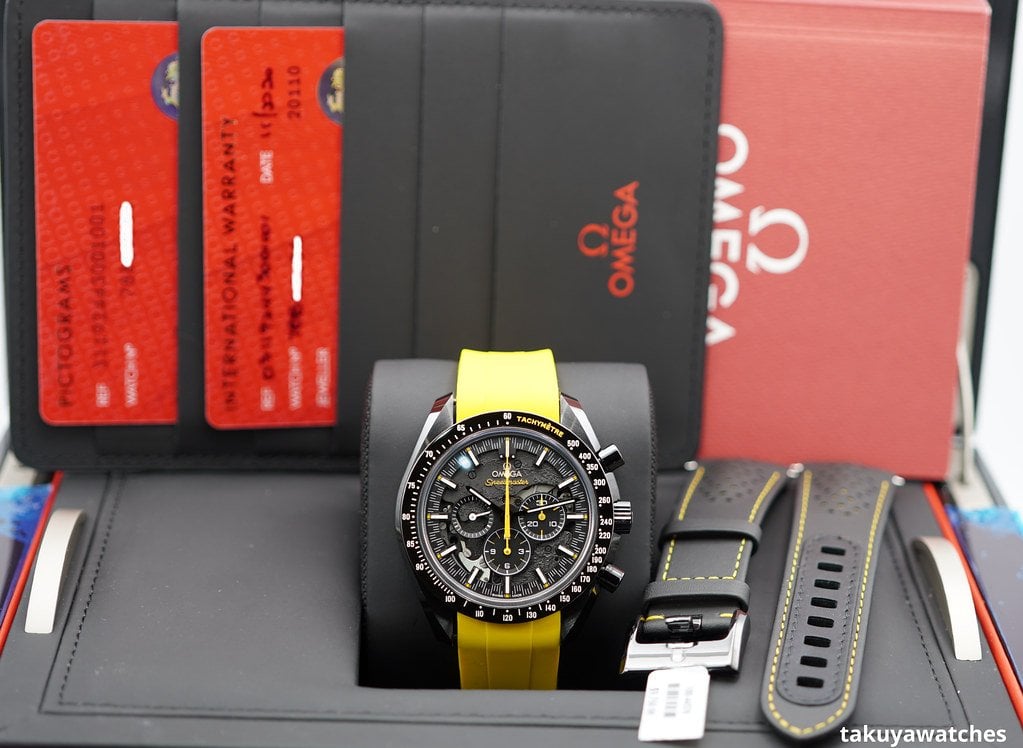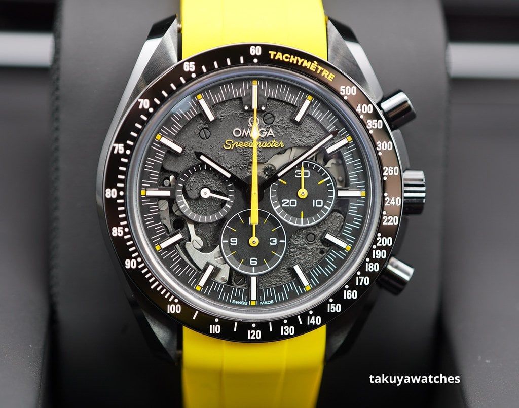 A Mint Condition & Very Cool 44.25mm Omega Speedmaster Moonwatch Chronograph Dark Side Of The Moon Apollo 8. Black Ceramic Case on Leather Strap with Tang Buckle. Purchased from Omega USA Authorized Dealer in 11.2020. Watch running perfect with Non Issues. Full Set & Under 5 Years Factory Warranty. Additional: Horus Yellow Rubber Strap with Tang Buckle.