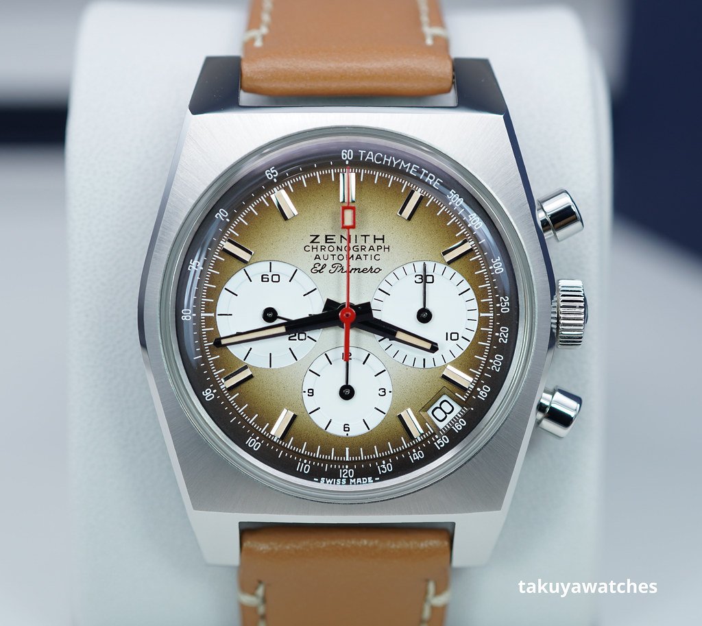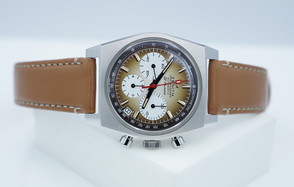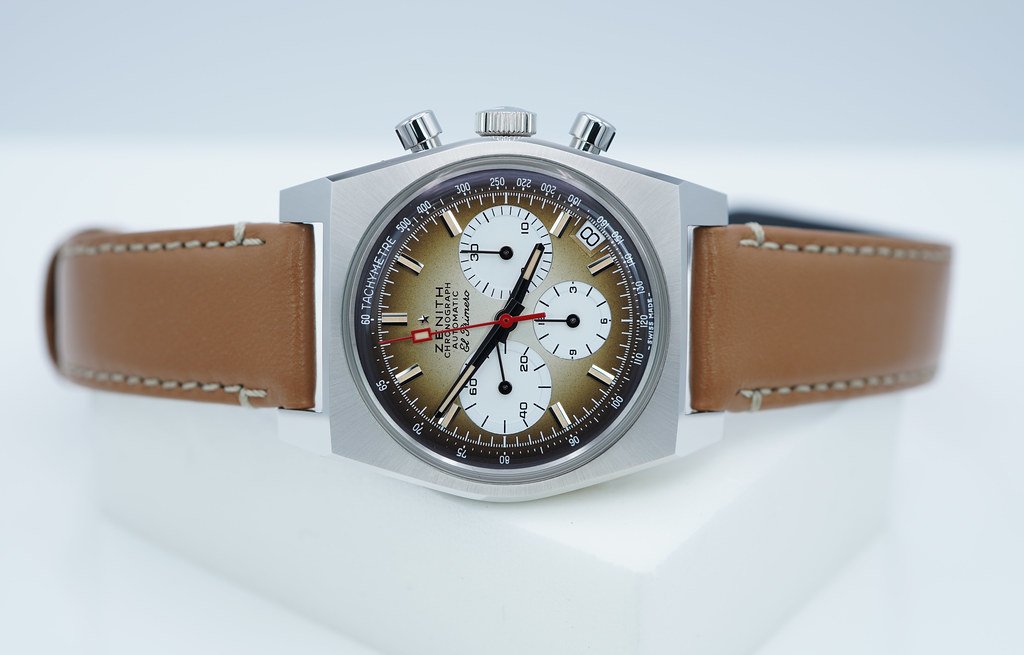 A New In Box & Very Beautiful 37mm Zenith Chronomaster El Primero A385 Revival Stainless Steel with Brown Gradient Dial, Zenith Calibre El Primero 400 Automatic Chronograph Movement. Its on Light Brown Strap with Steel Tang Buckle. Purchased from Zenith Authorized Dealer in 12.2023. Unworn. Full Set & 3 Years Factory Warranty.