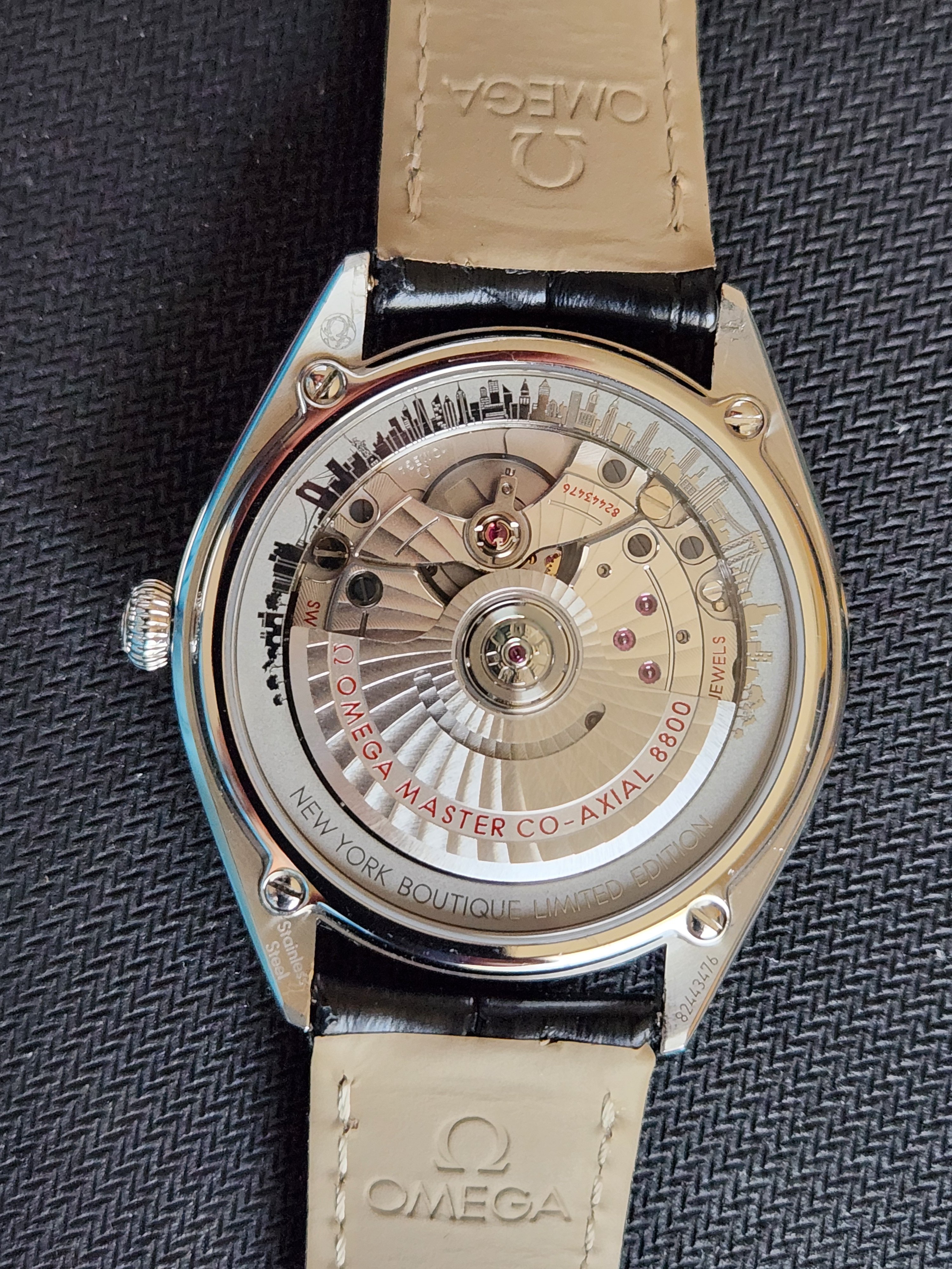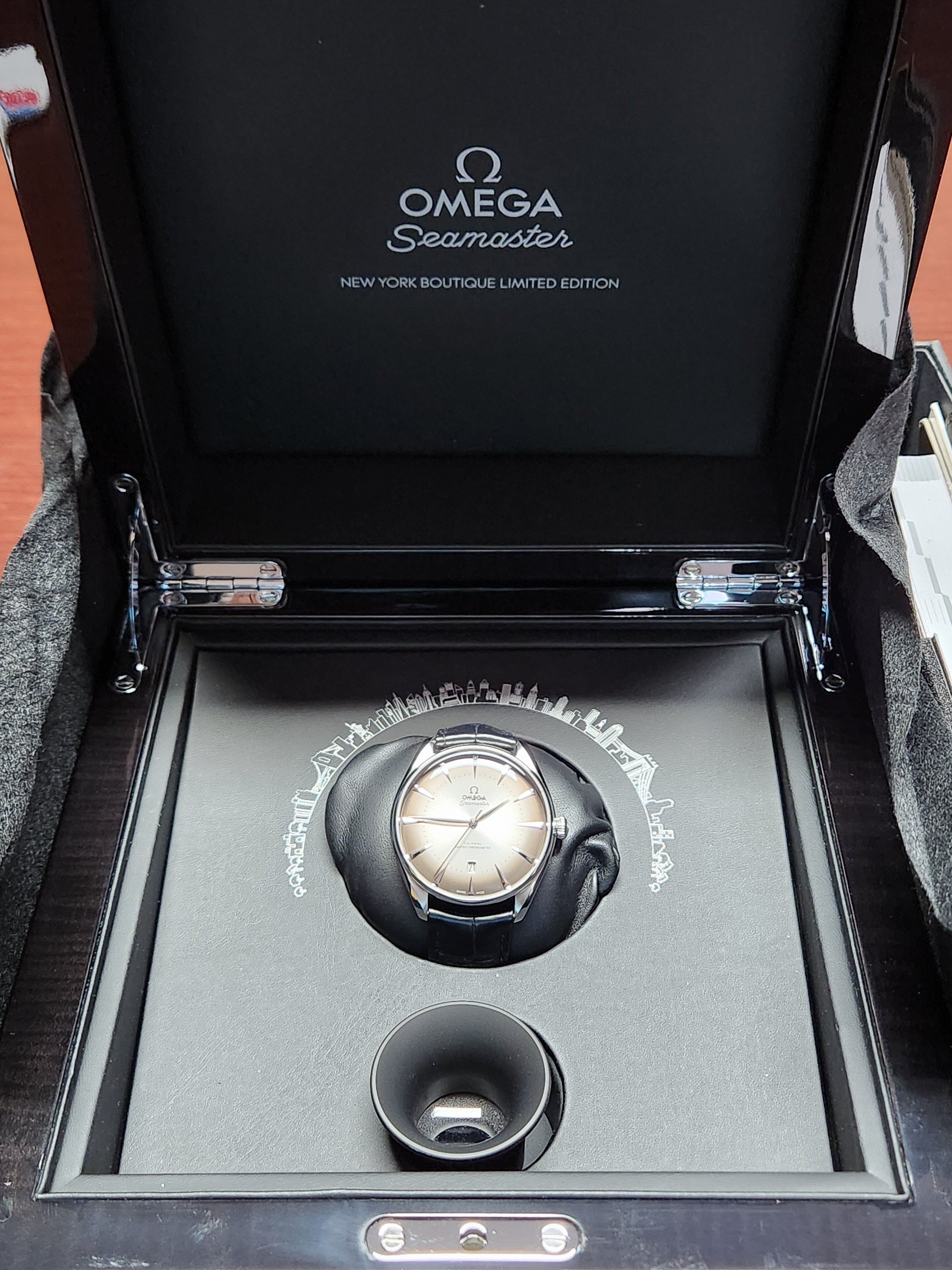路Up for sale or trade is my Seamaster Boutiques Editions NYC Edition. This is a limited edition reference of only 399 pieces. Caseback has engraving of the New York city skyline and these were originally available only in NYC boutiques. Case is engraved with the watch number out of the 399 made. It is numbered near the mid-300's.