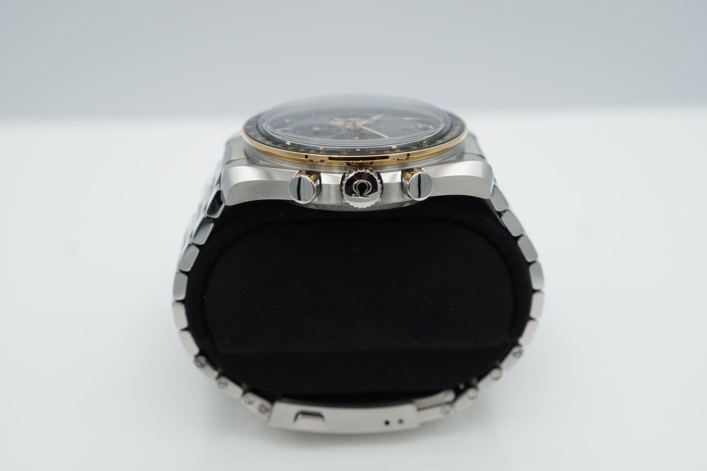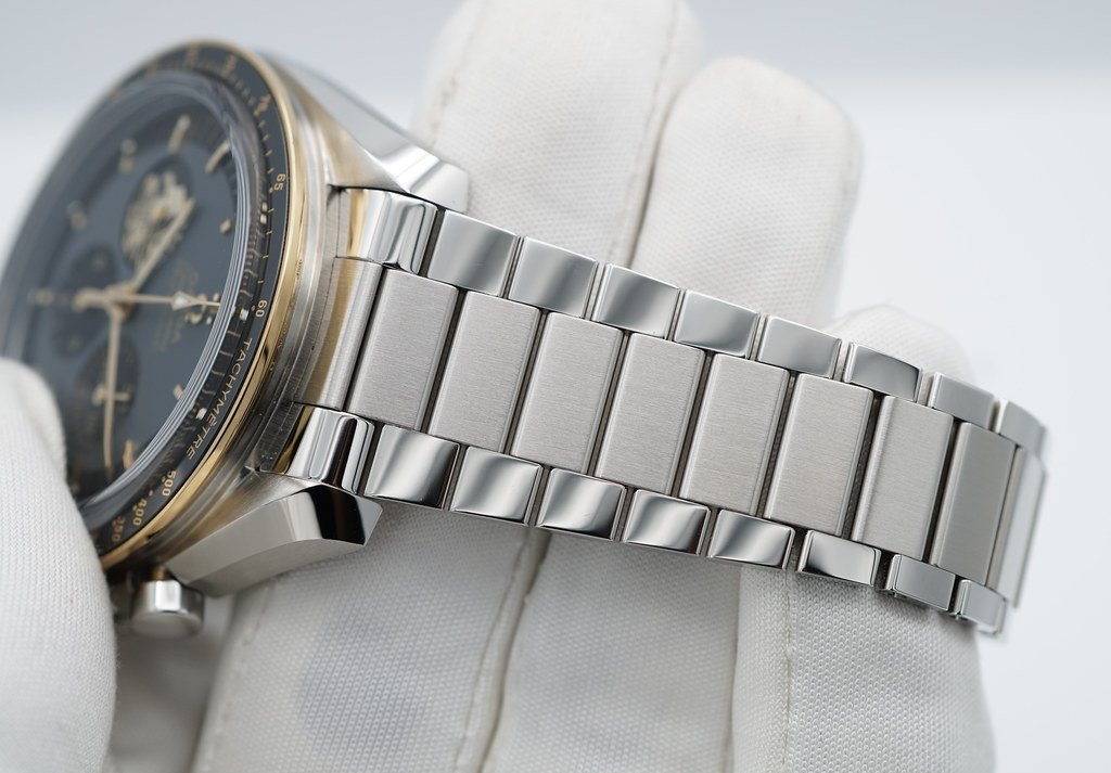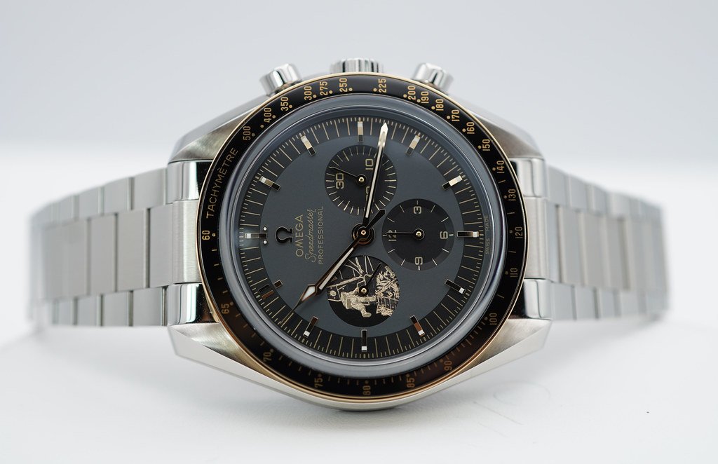 A Like New, Unpolished & Very Beautiful Limited Edition of 6969 Pieces 42mm Omega Speedmaster Moonwatch Chronograph 50th Anniversary Apollo 11. Stainless Steel with 18K Yellow Gold/Black Ceramic Bezel. It’s on a polished-brushed metallic bracelet & comes with an additional Velcro strap with black-coated cork. Purchased from Omega Authorized Dealer in 06.2021. Watch Running Perfect with Non Issues. Full Links. Full Set & Under 5 Years Factory Warranty.