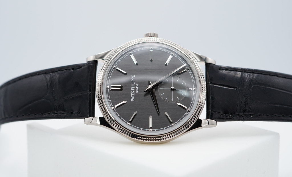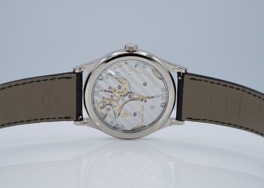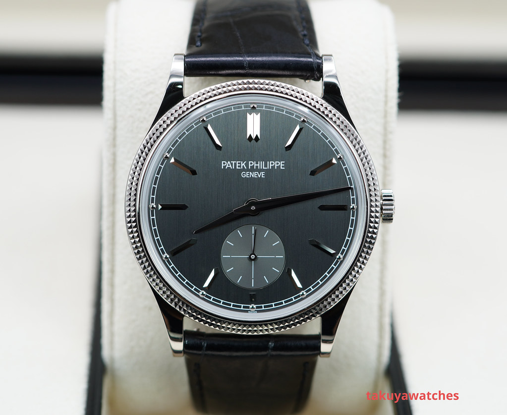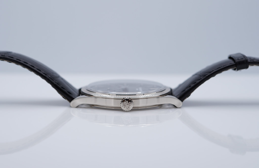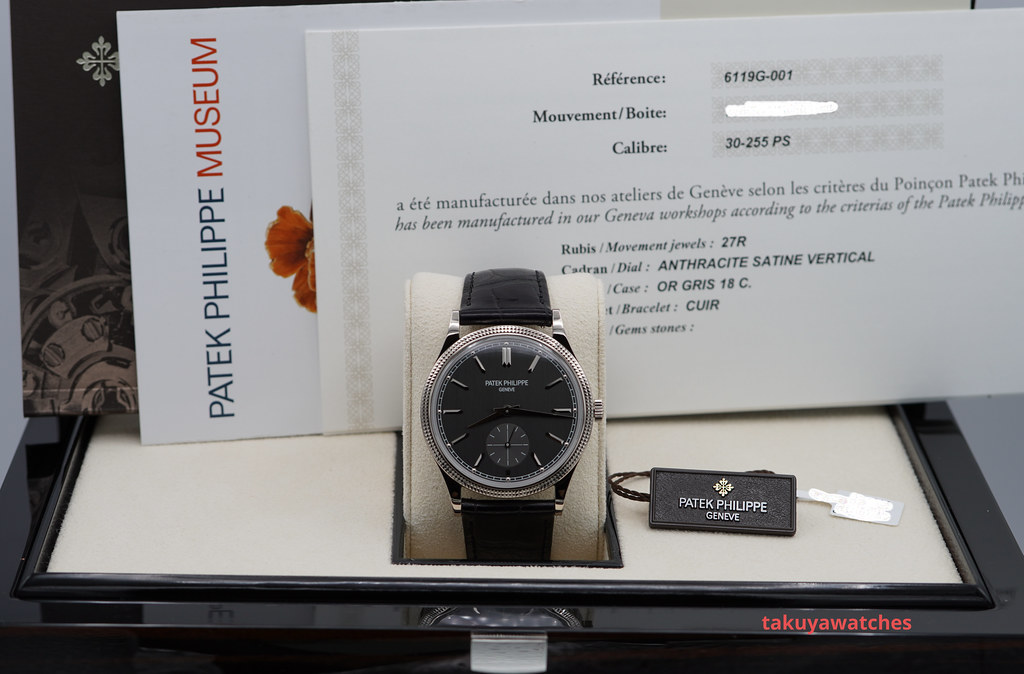 An Excellent, Unpolished Condition & Very Beautiful 2024 39mm Patek Philippe 6119 Calatrava White Gold Manual Winding Movement with Charcoal Gray Vertical Satin Finish Dial. Its on Black Leather Strap with Patek Tang Buckle. Purchased from Patek Philippe USA Authorized Dealer in 03.2024.