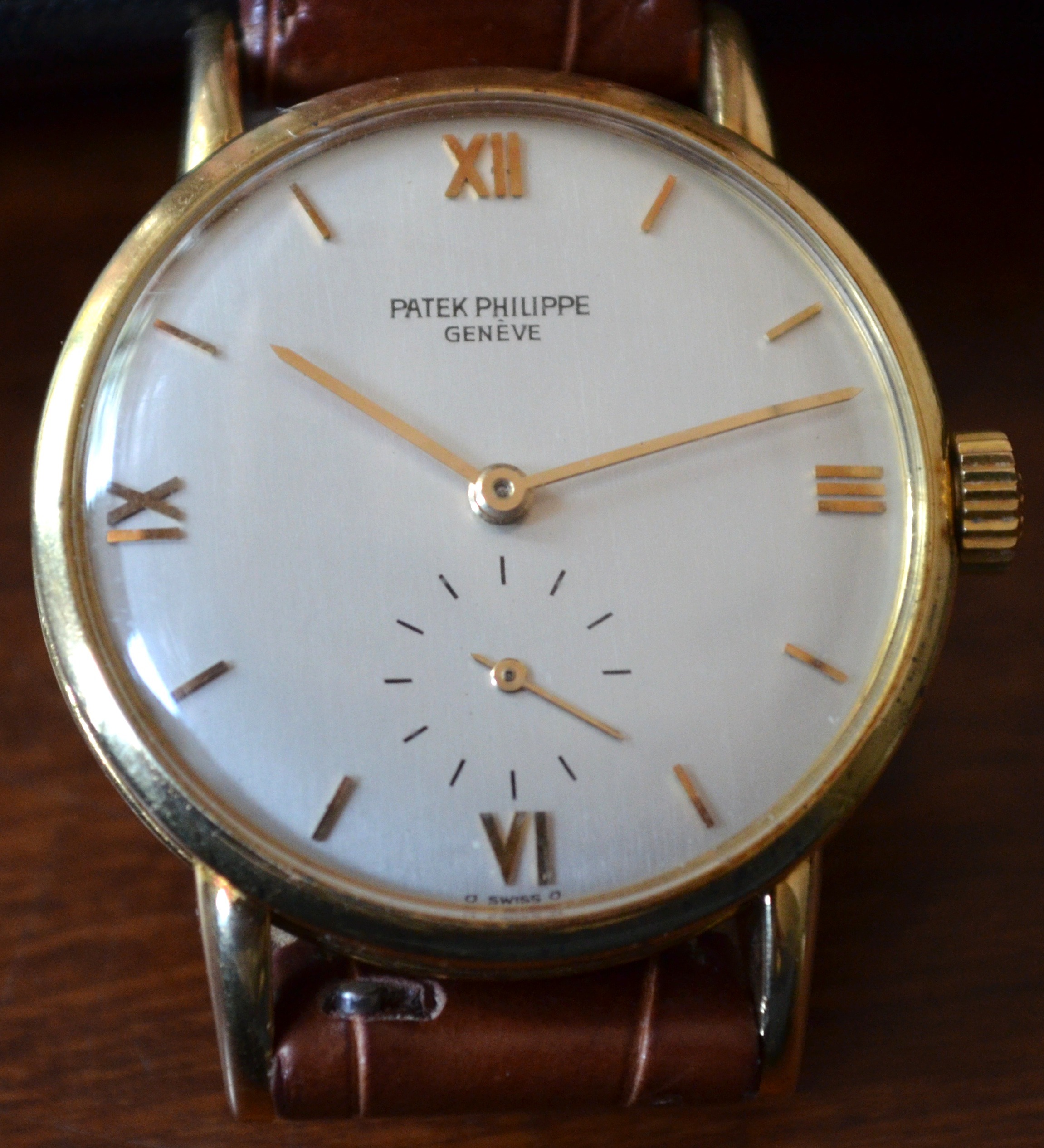 ·Patek Philippe Reference 1471. One owner watch in excellent condition purchased from AD from the '50s. 33 mm case (has some minor oxidation around the bezel and case). I could have had it polished, but I wanted it as original as possible. Dial is in pristine condition with no signs of age. Acrylic crystal could be polished if you prefer, but there are no major scuffs or scratches. Manual wind movement keeping great time. Comes with original black Patek Philippe box. After market brown croc strap with after market buckle.