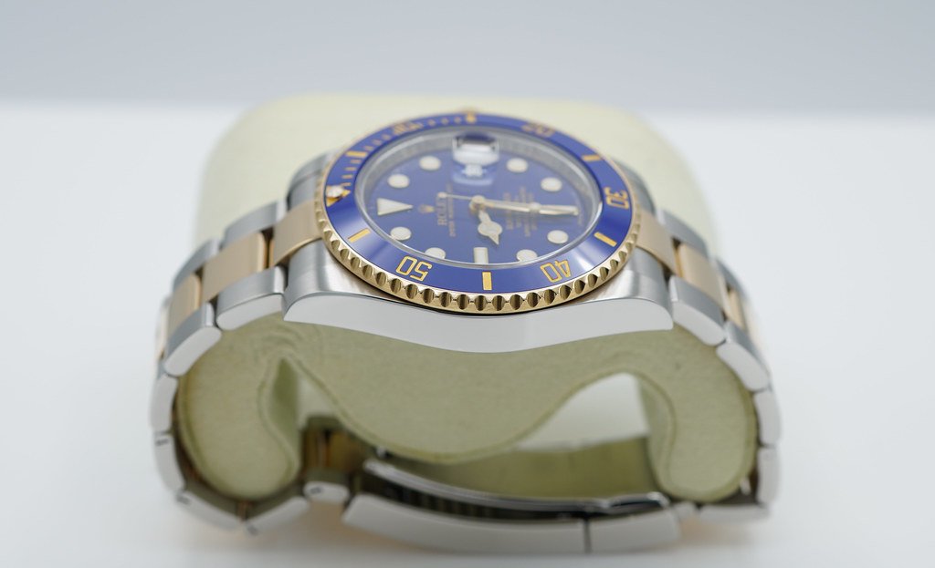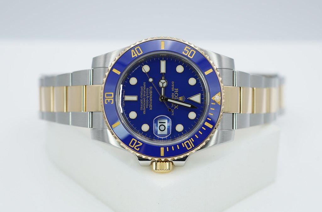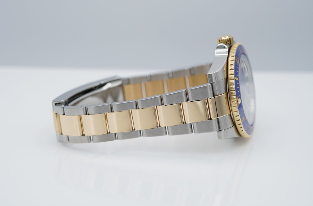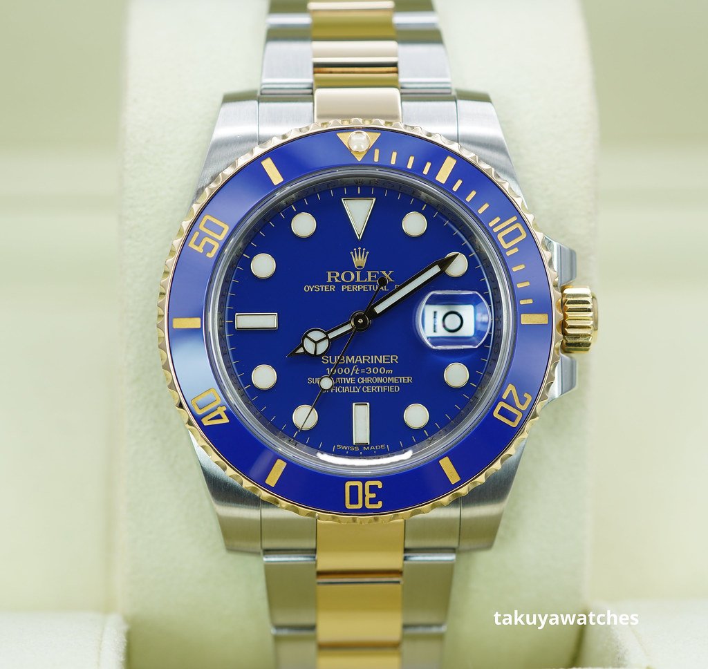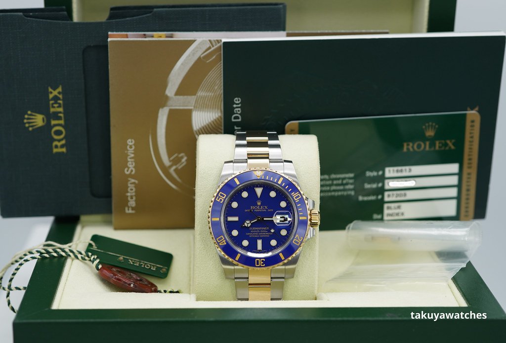 An Excellent Condition & Very Beautiful Discontinued 40mm Rolex 116613lb Submariner 18K Yellow Gold & Stainless Steel, Ceramic Blue Bezel with Rare Original Flat Blue Dial. Purchased from Rolex Authorized Dealer in 04.2012. Watch Running Perfect with Non Issues. Full Links & Full Set.