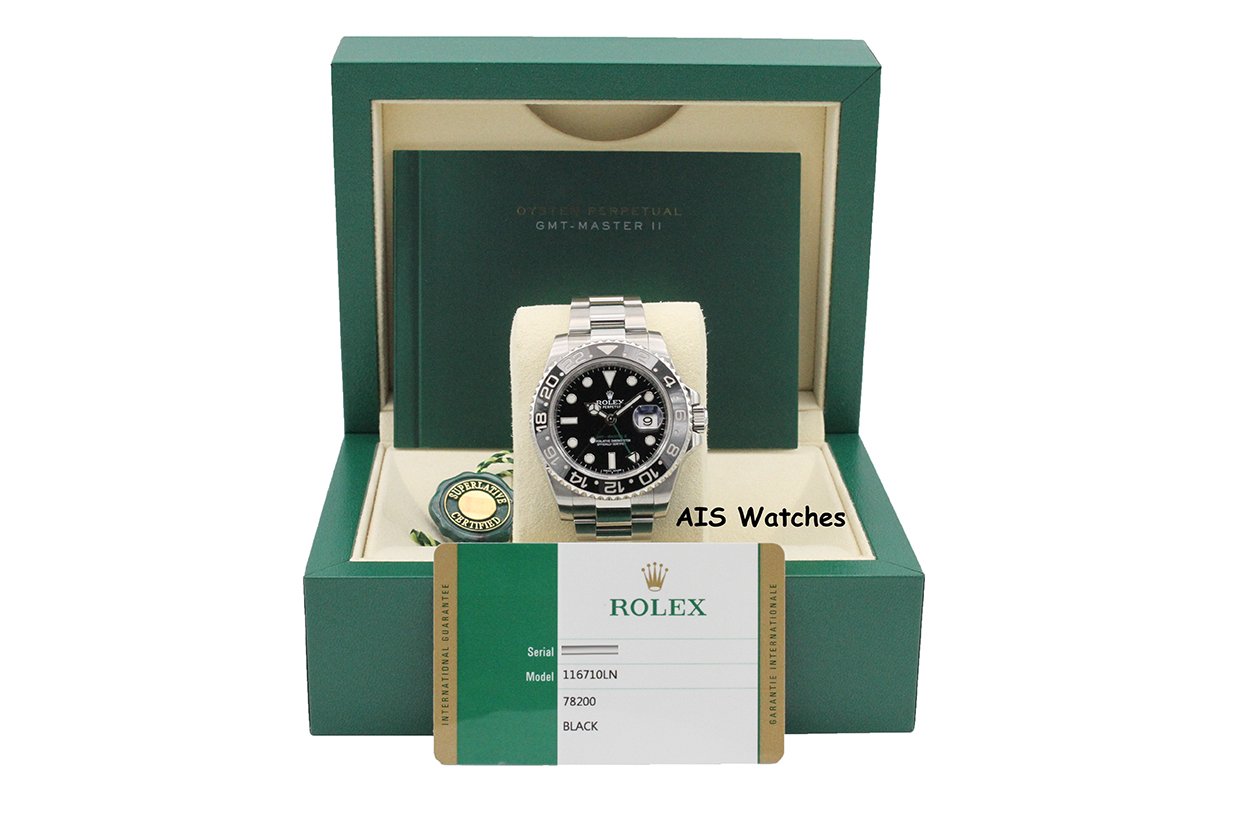 Up for sale is a Discontinued Rolex 116710 LN GMT Master II Black Ceramic Insert Box & Papers. The timepiece is in excellent condition.