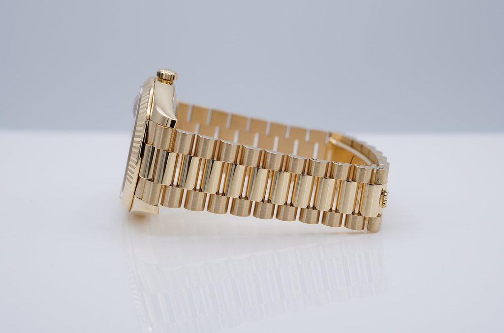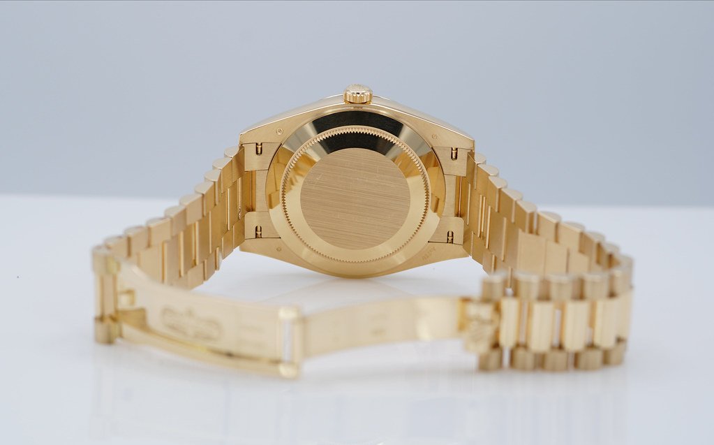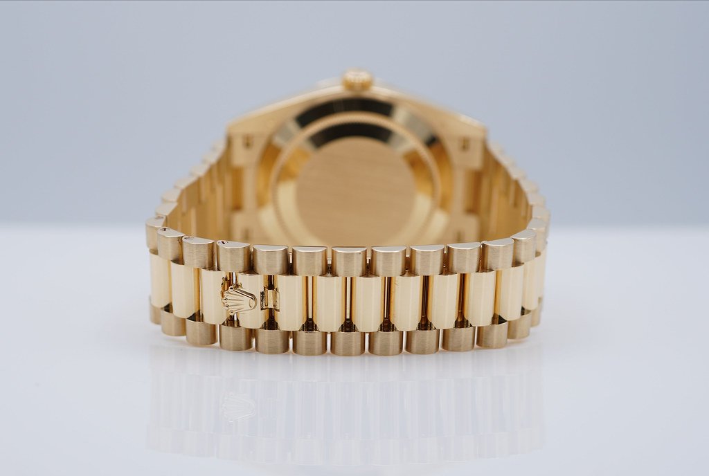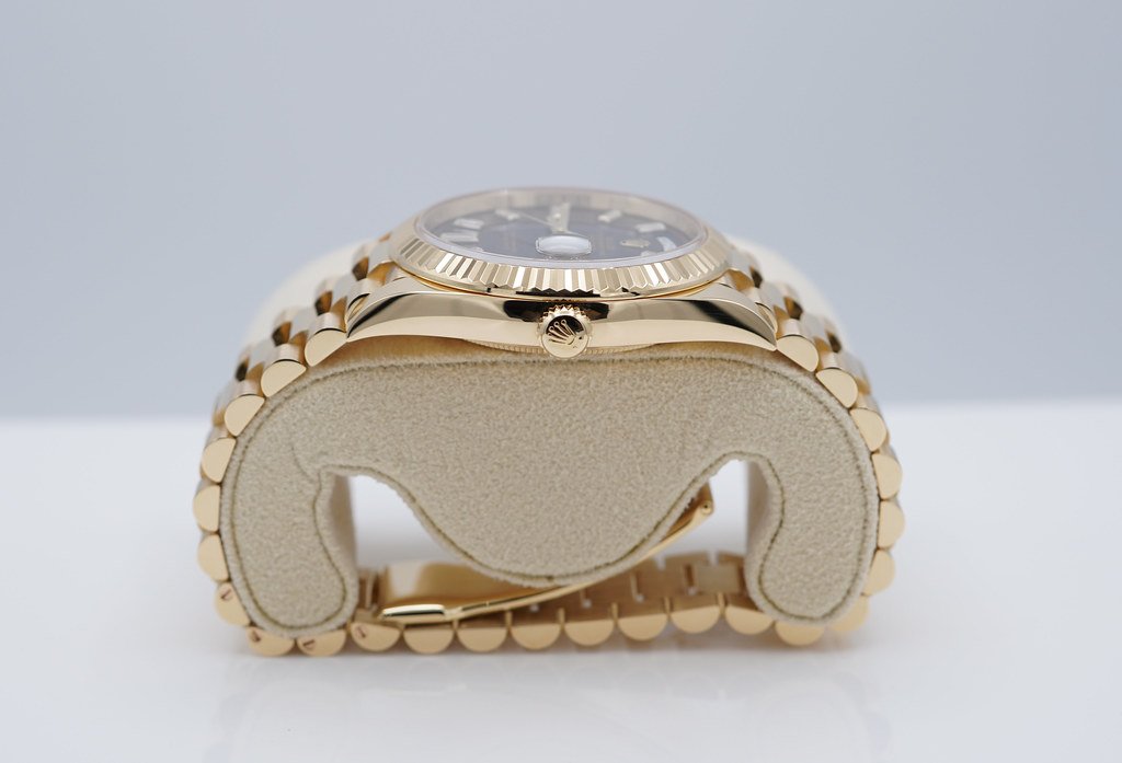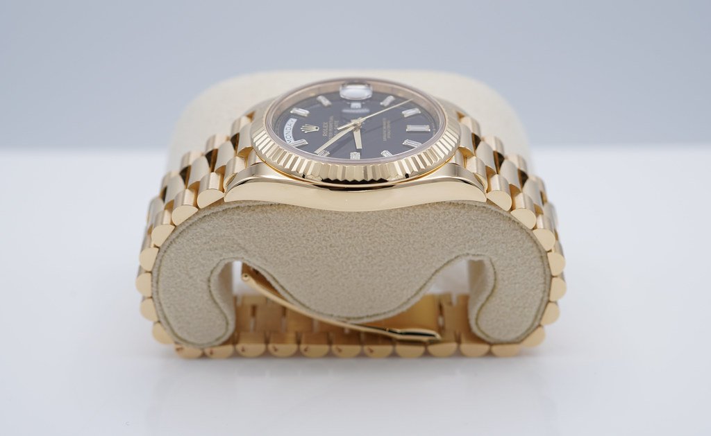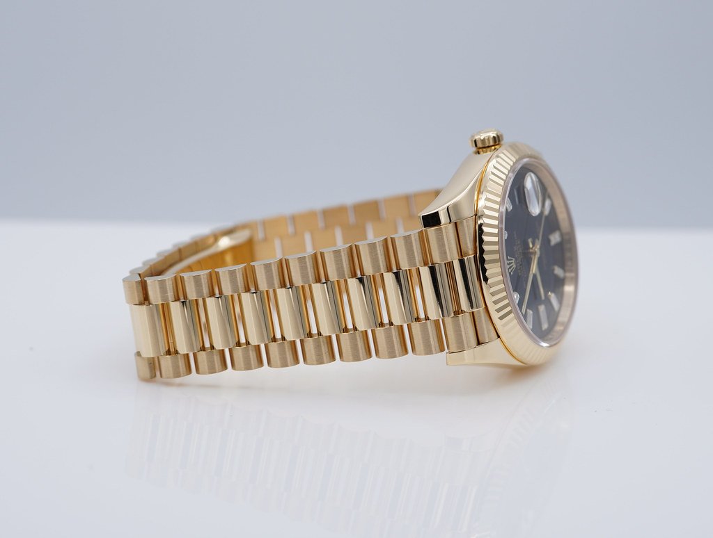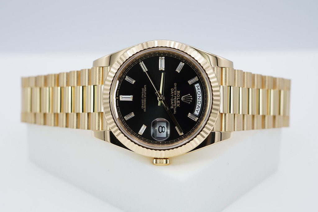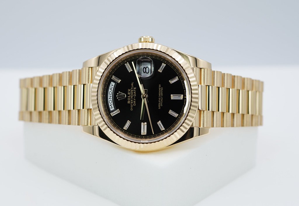 An Excellent Condition & Very Beautiful 2023 40mm Rolex 228238 18K Yellow Gold Day-Date President with Bright Black Baguette Diamonds Dial. Purchased from Rolex Authorized Dealer in 08.2023. Watch Running Perfect with Non Issues. Full Links. Full Set & Under 5 Years Factory Warranty.