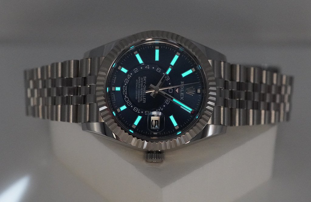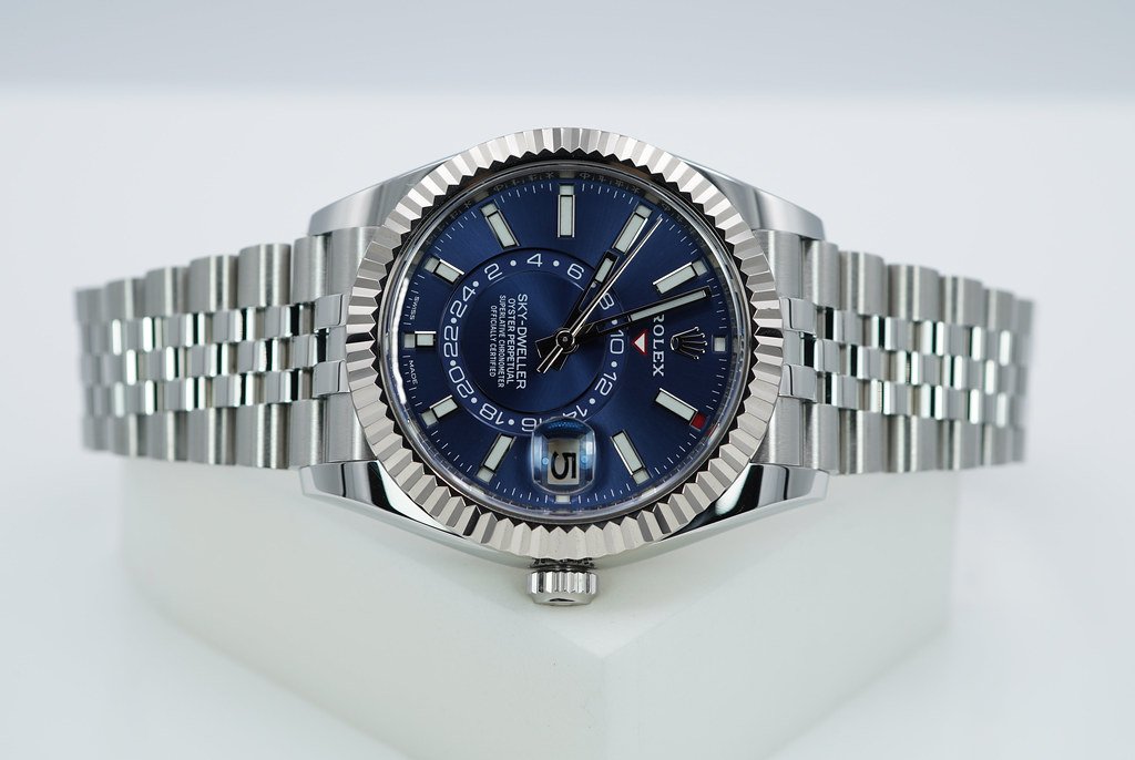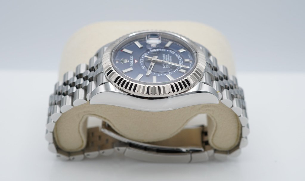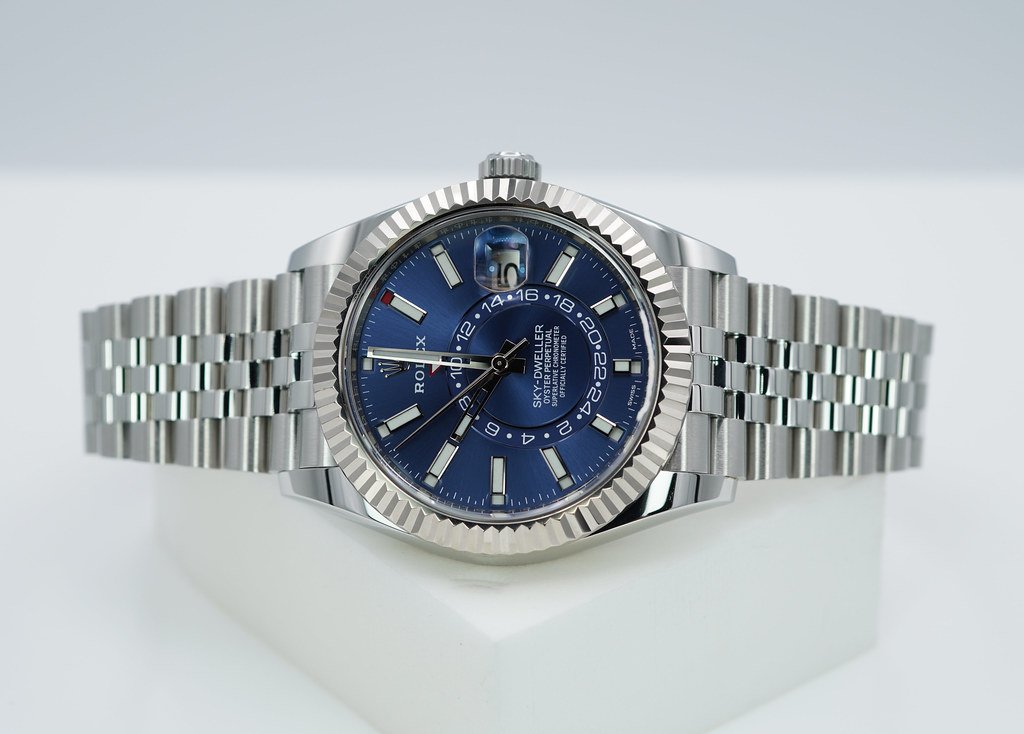 An Excellent Condition & Very Beautiful 2022 42mm Rolex Annual Calendar 326934 Skydweller Stainless Steel with 18K White Gold Fluted Bezel & Blue Dial. Its on Jubilee Bracelet. Purchased from Rolex Authorized Dealer in 02.2022. Watch Running Perfect with Non Issues. Full Links. Full Set & Under 5 Years Factory Warranty.