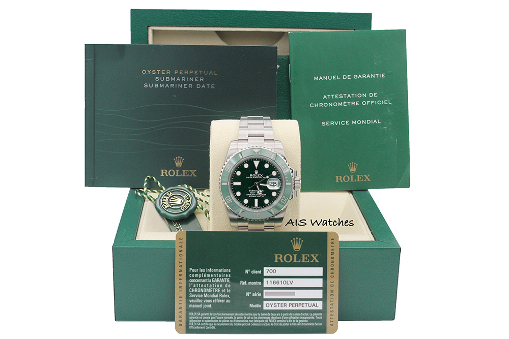 Up for sale is a Rolex Submariner 116610LV Green Ceramic Hulk Box & Papers. The timepiece is in clean condition and under warranty.