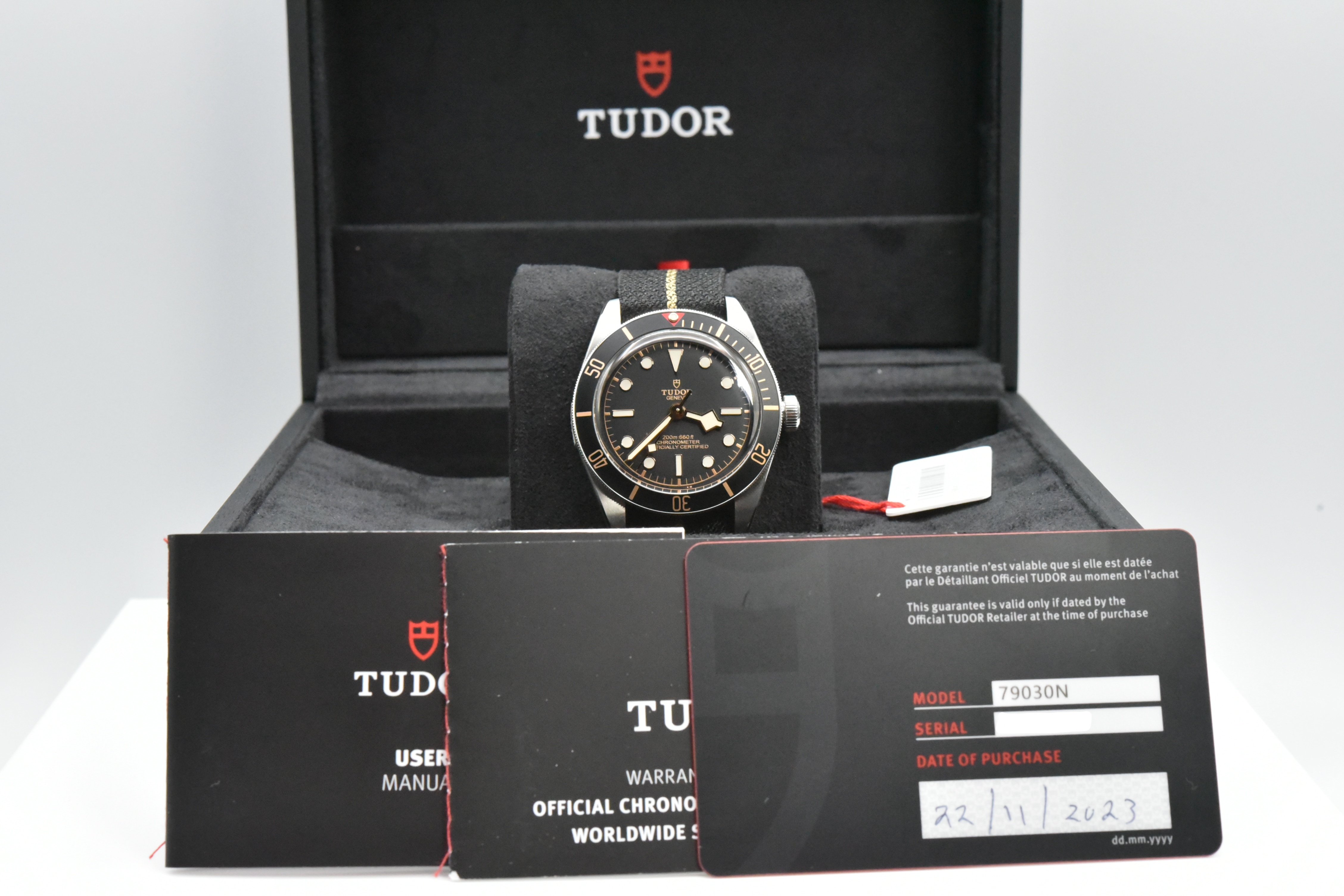 Complete Packages/Set (double boxes, hangtag), & Complete Manuals/Papers with Warranty Card dated 11.2023. The Watch is still has Plenty of Factory Warranty and is in Excellent Unpolished Condition! All of our watches are inspected by our Certified Watch Maker to ensure the watch is in the best possible condition and meets COSC specifications. New Old Stock, Nato Strap fits 7 inch wrist at max.