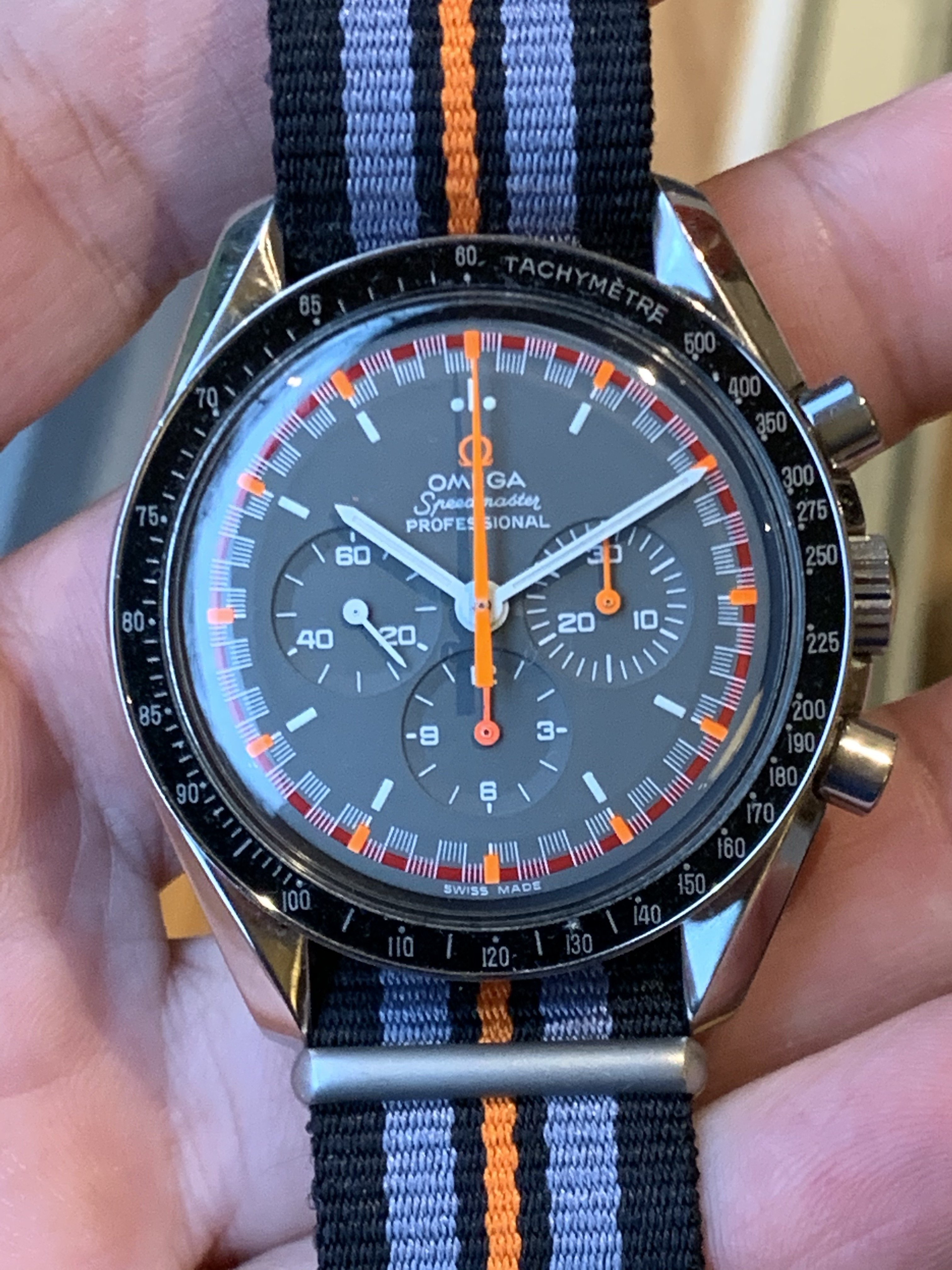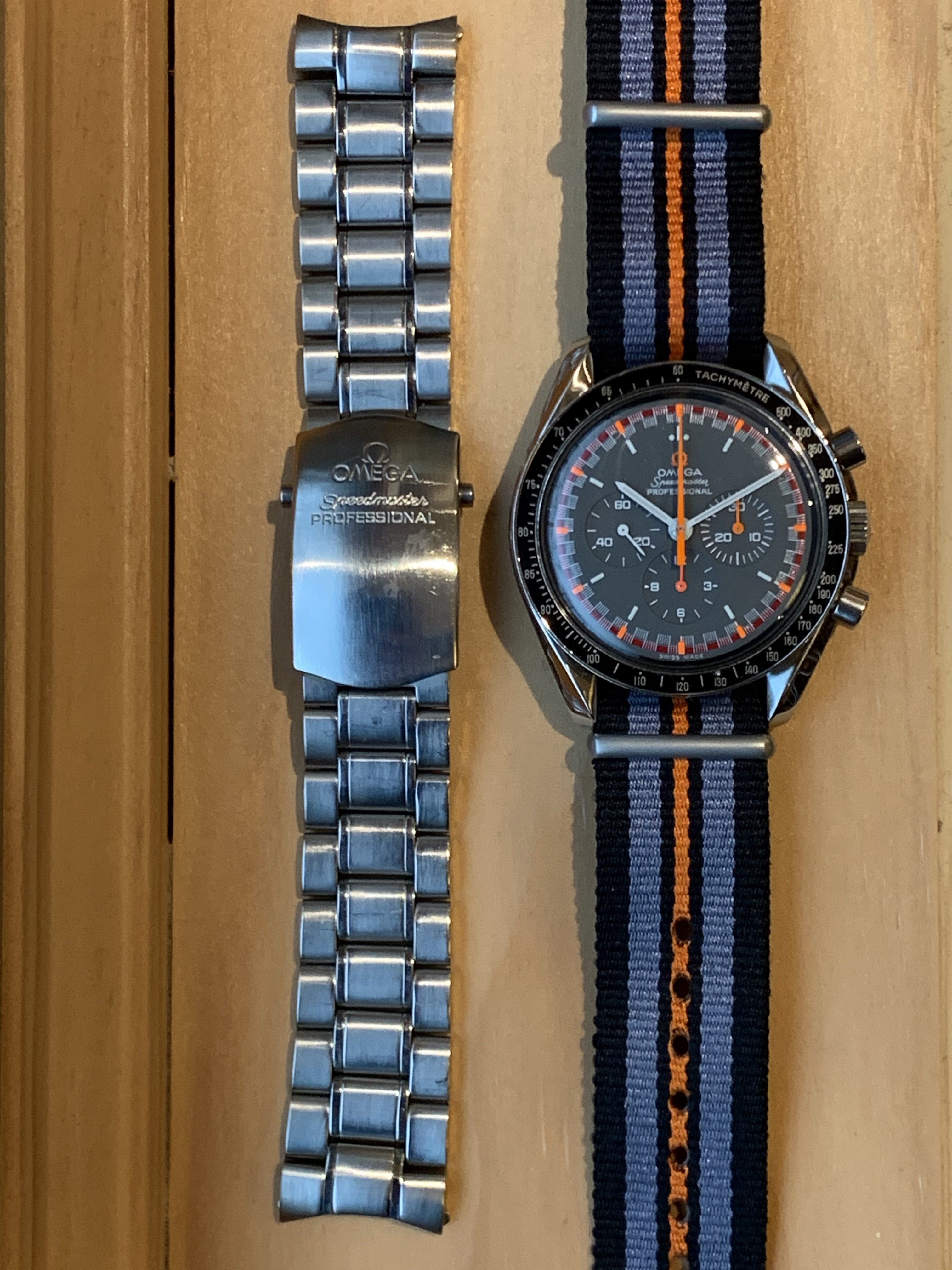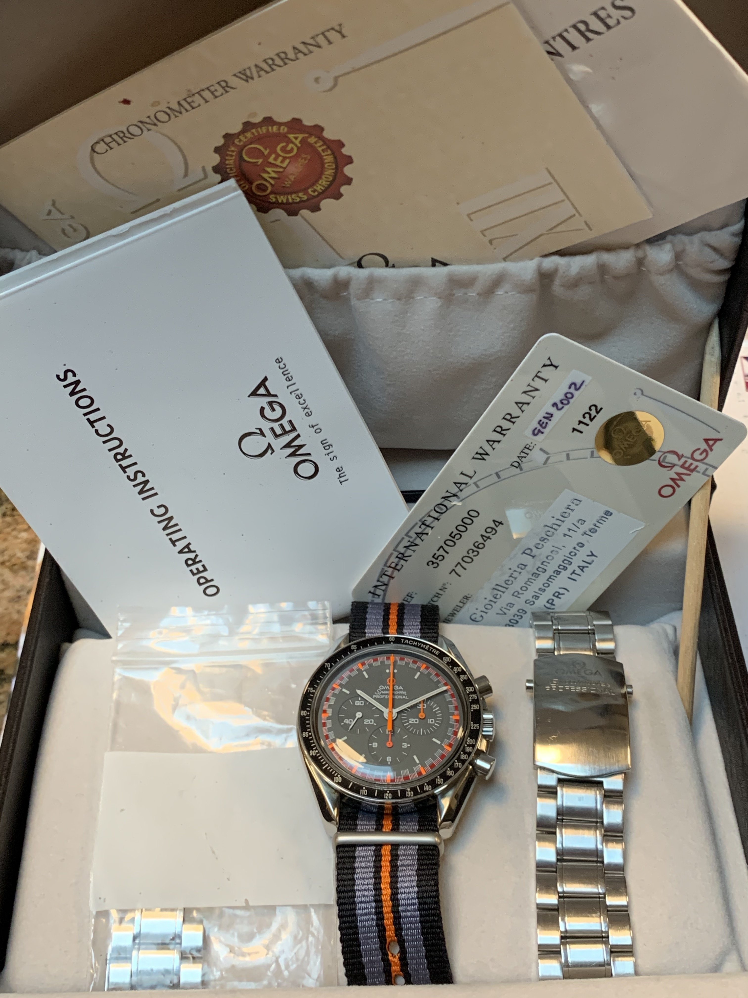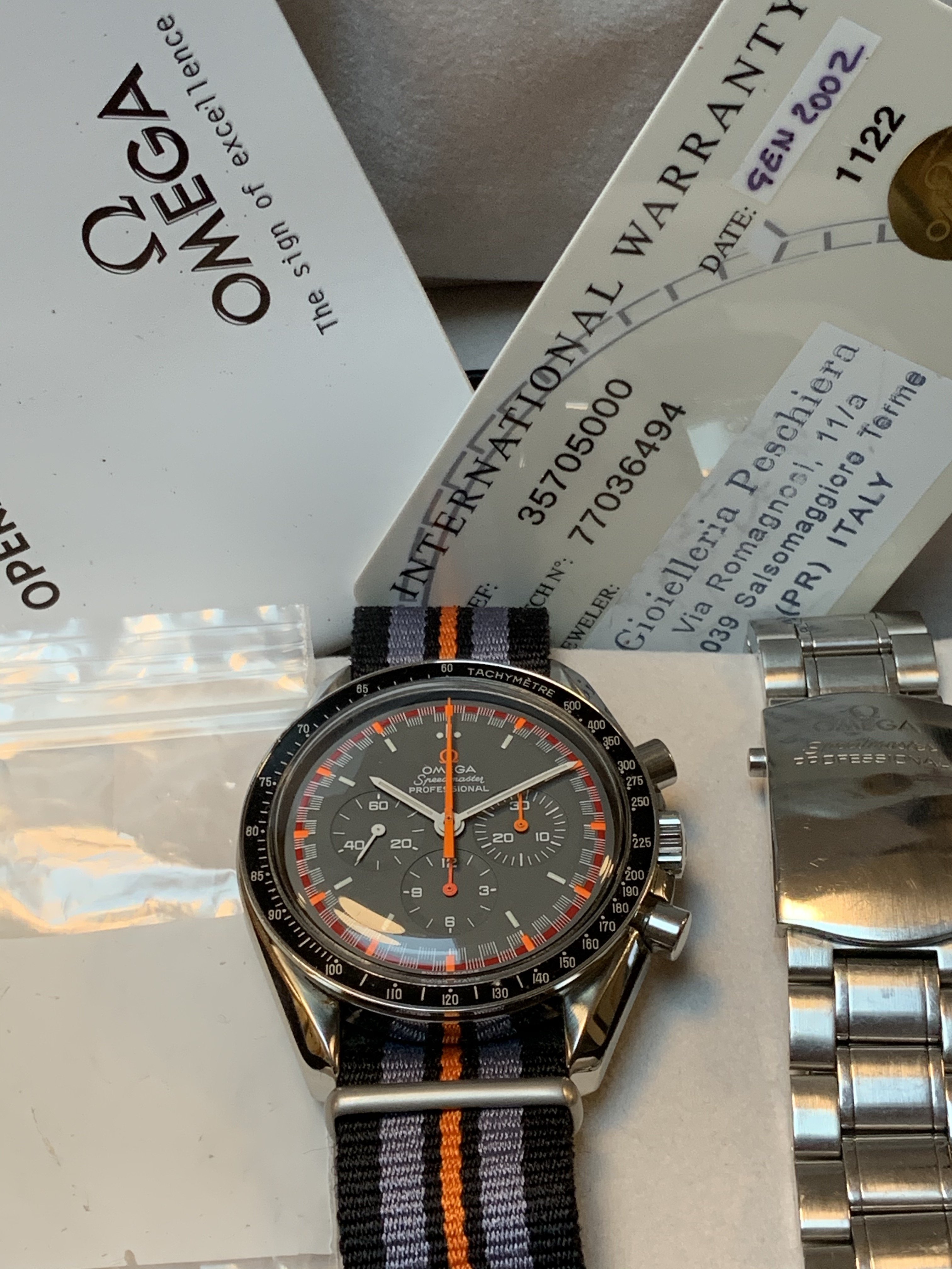 For sale, I have a beautiful Full Kit Omega Speedmaster 3570.50 with a Japanese Racing dial modification. I purchased the watch from the original owner who had acquired it during vacation in Italy. After modification was performed in 2006, the watch was in my rotation for about a year and was subsequently stored at an air-conditioned bank safe for the past 12 years.
