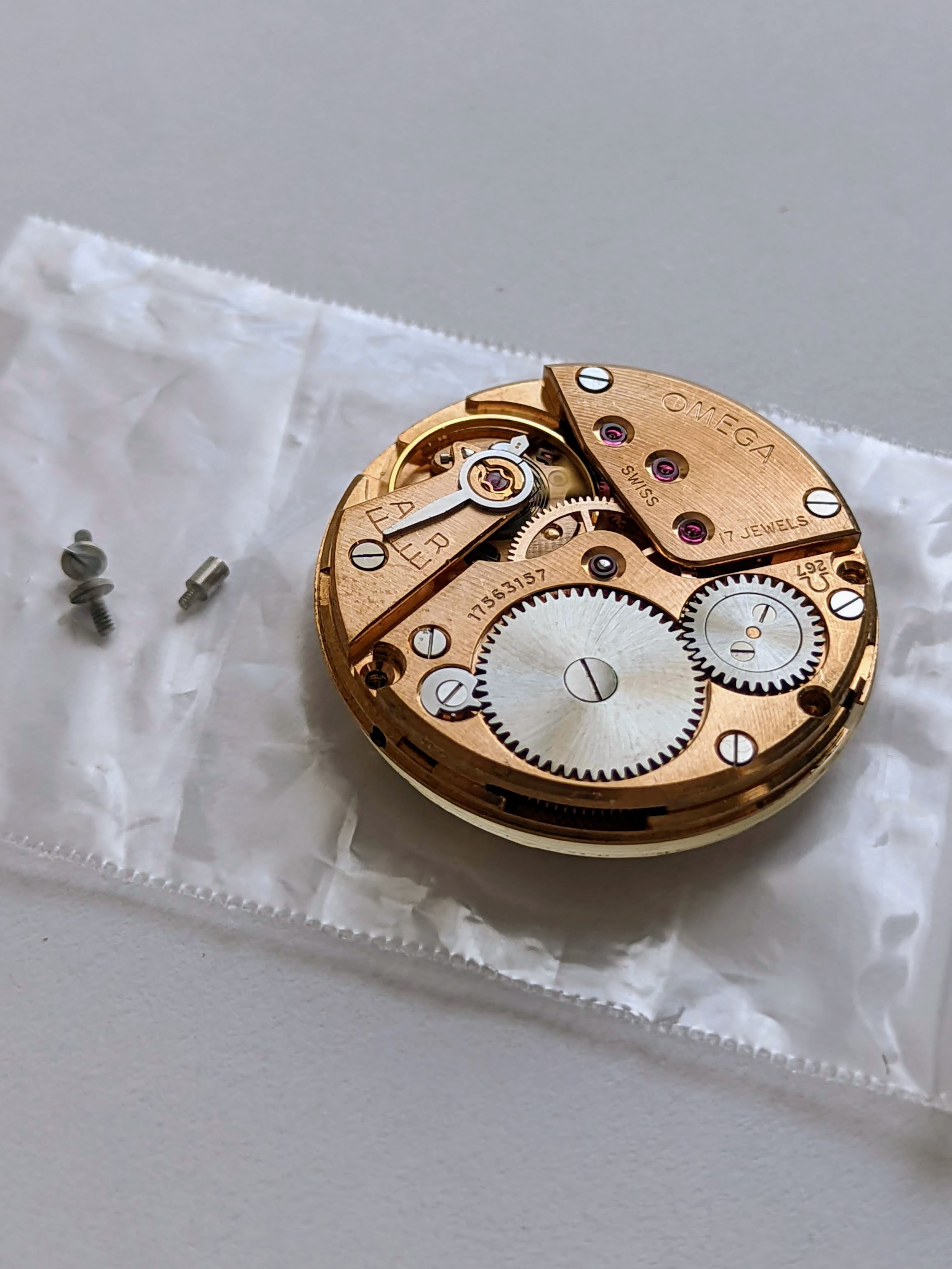 1. Full caliber 267 movement (serviced) + dial with nice patina Omega Genève cursive - 150€+shipping