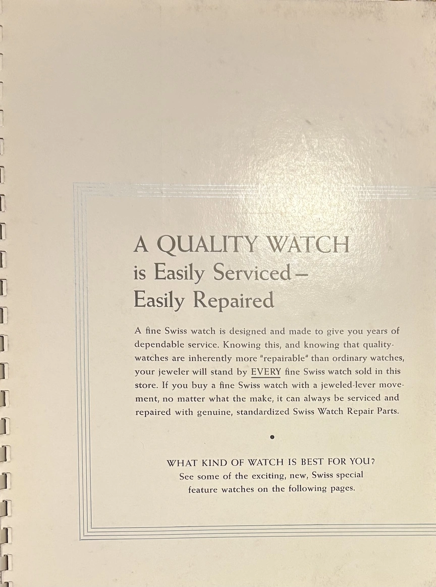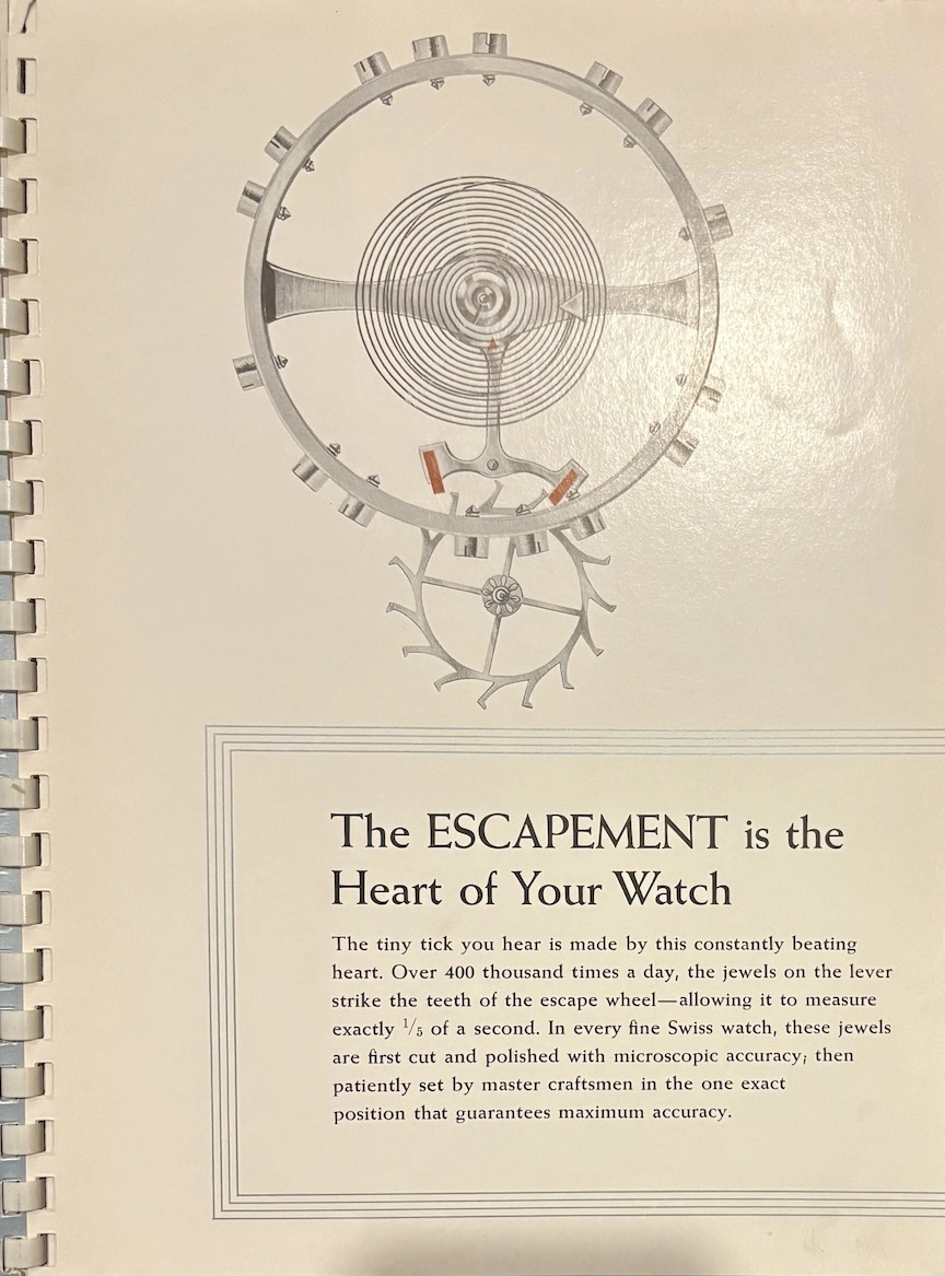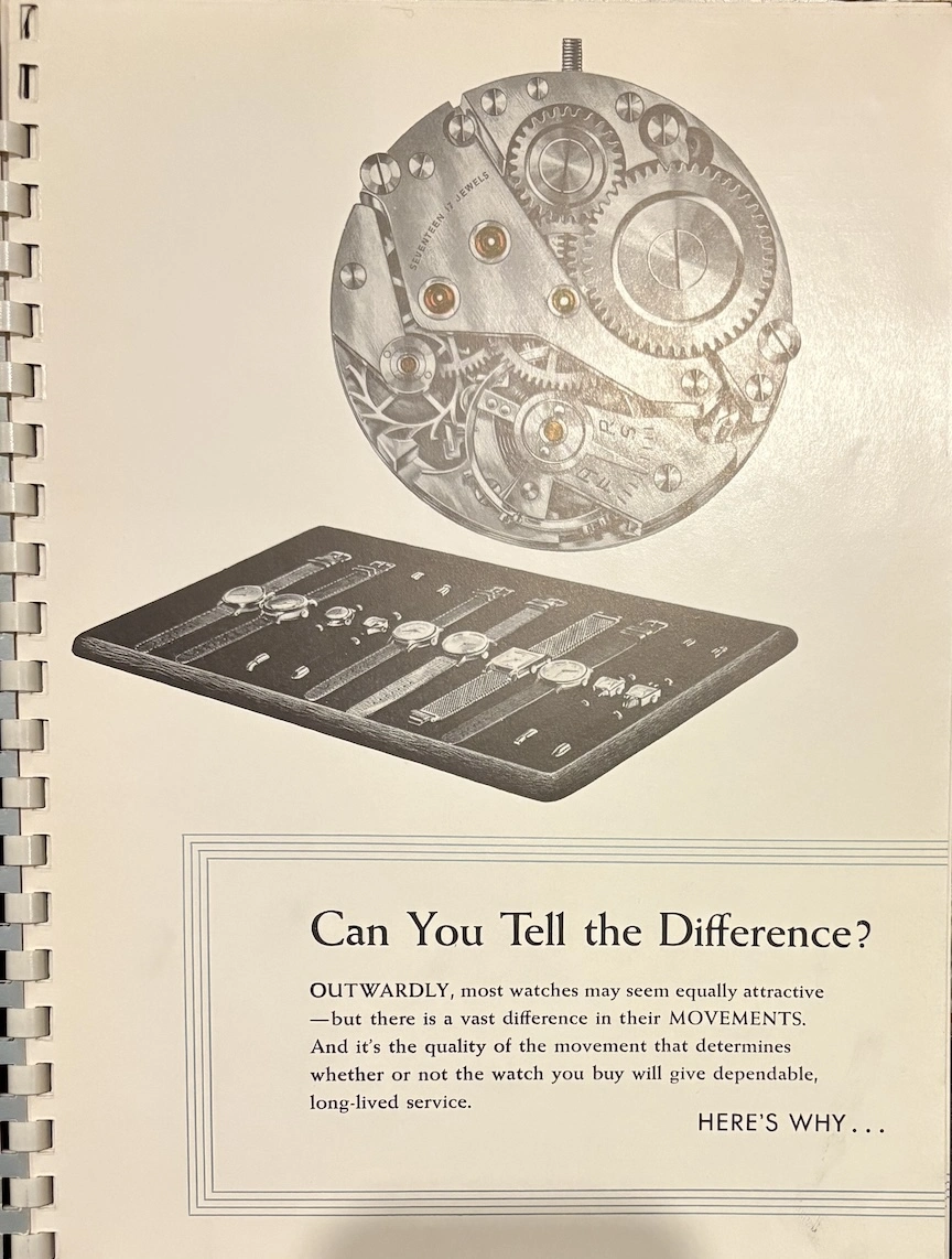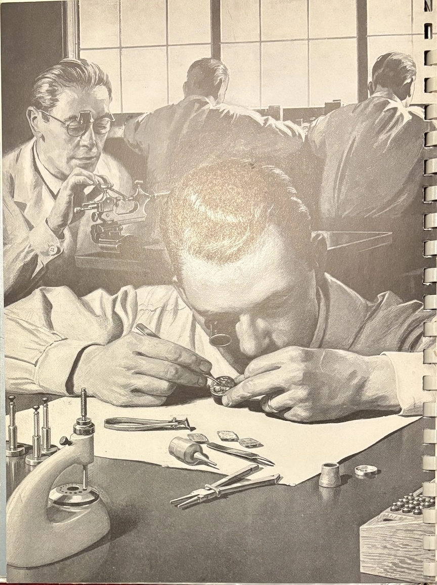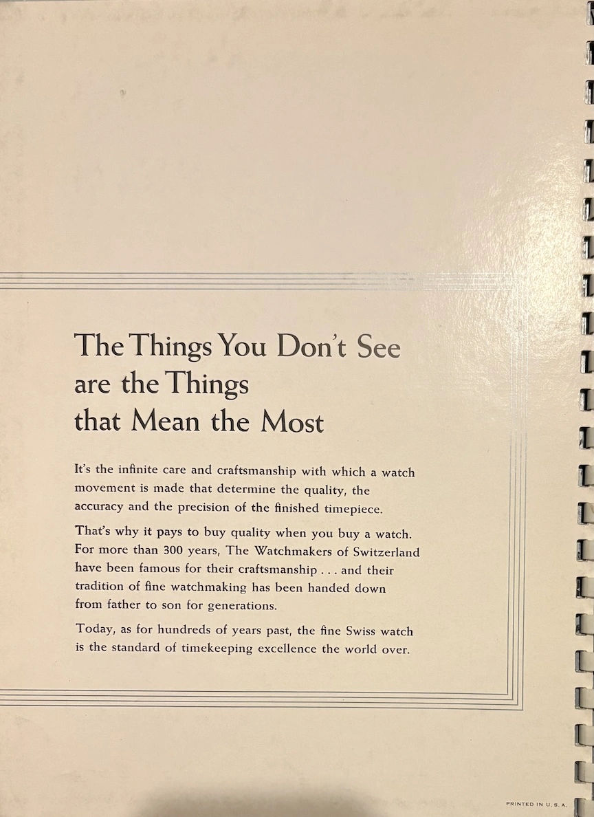 Previously, I have seen this type of transparent overlay in children's books or anatomy books, but it's interesting to see the movement cut away layer by layer, both front and back. And it's remarkable how different marketing was in the mid-20th century, when the general public was so excited by new technology. This almost feels like it could serve as a manual to illustrate movement assembly. Now it would just be about aesthetics and prestige.