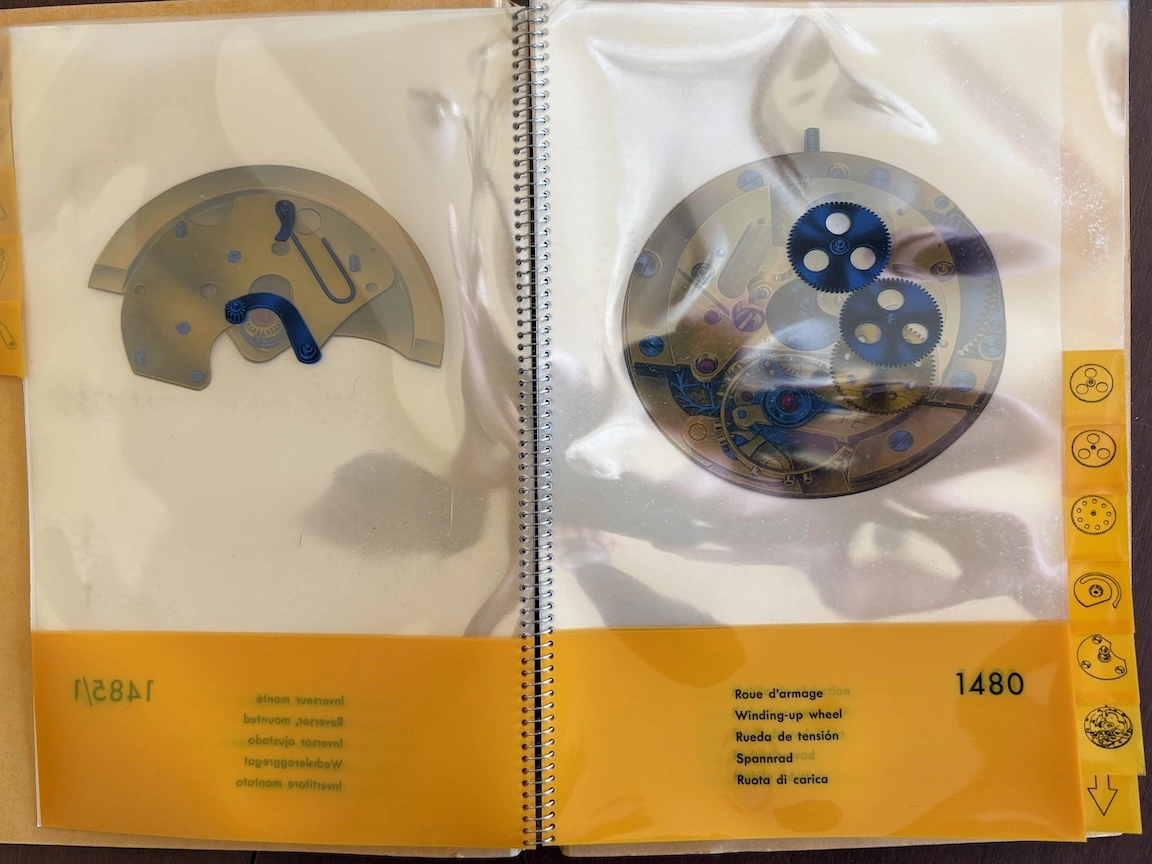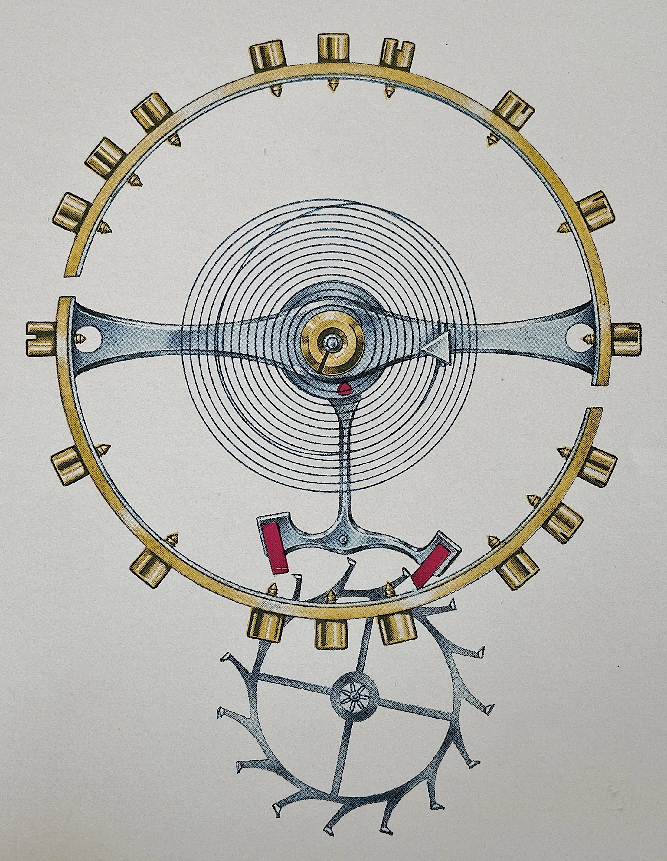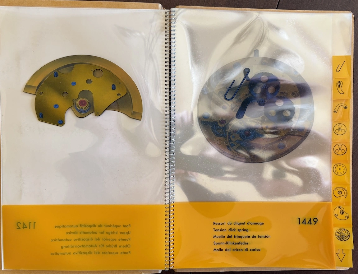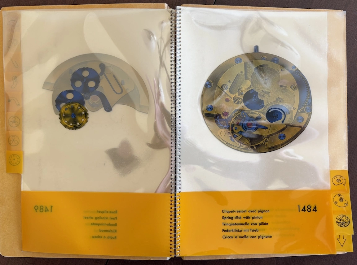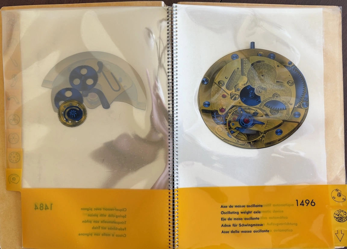 Previously, I have seen this type of transparent overlay in children's books or anatomy books, but it's interesting to see the movement cut away layer by layer, both front and back. And it's remarkable how different marketing was in the mid-20th century, when the general public was so excited by new technology. This almost feels like it could serve as a manual to illustrate movement assembly. Now it would just be about aesthetics and prestige.