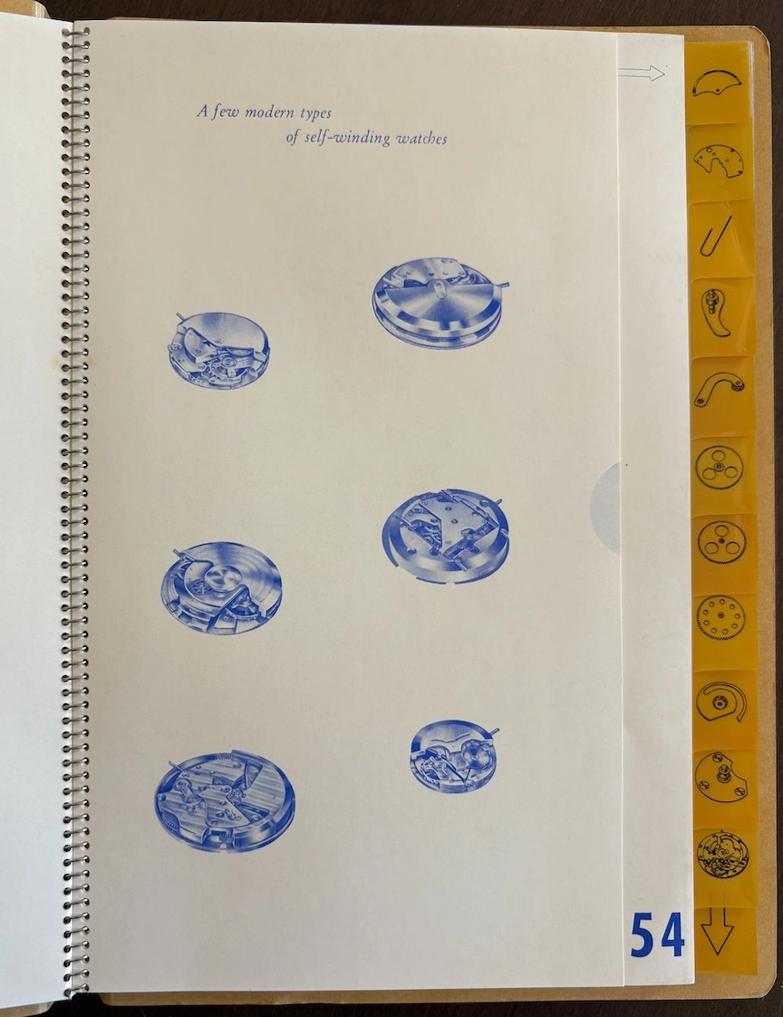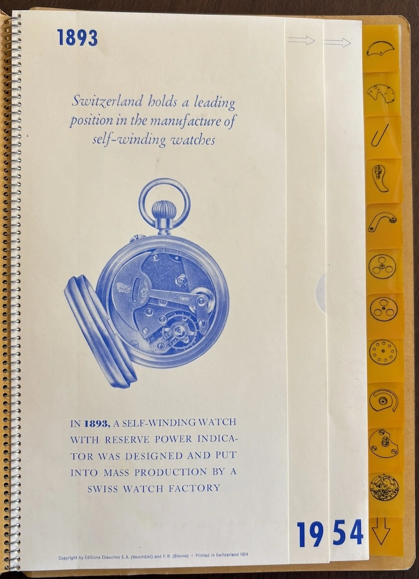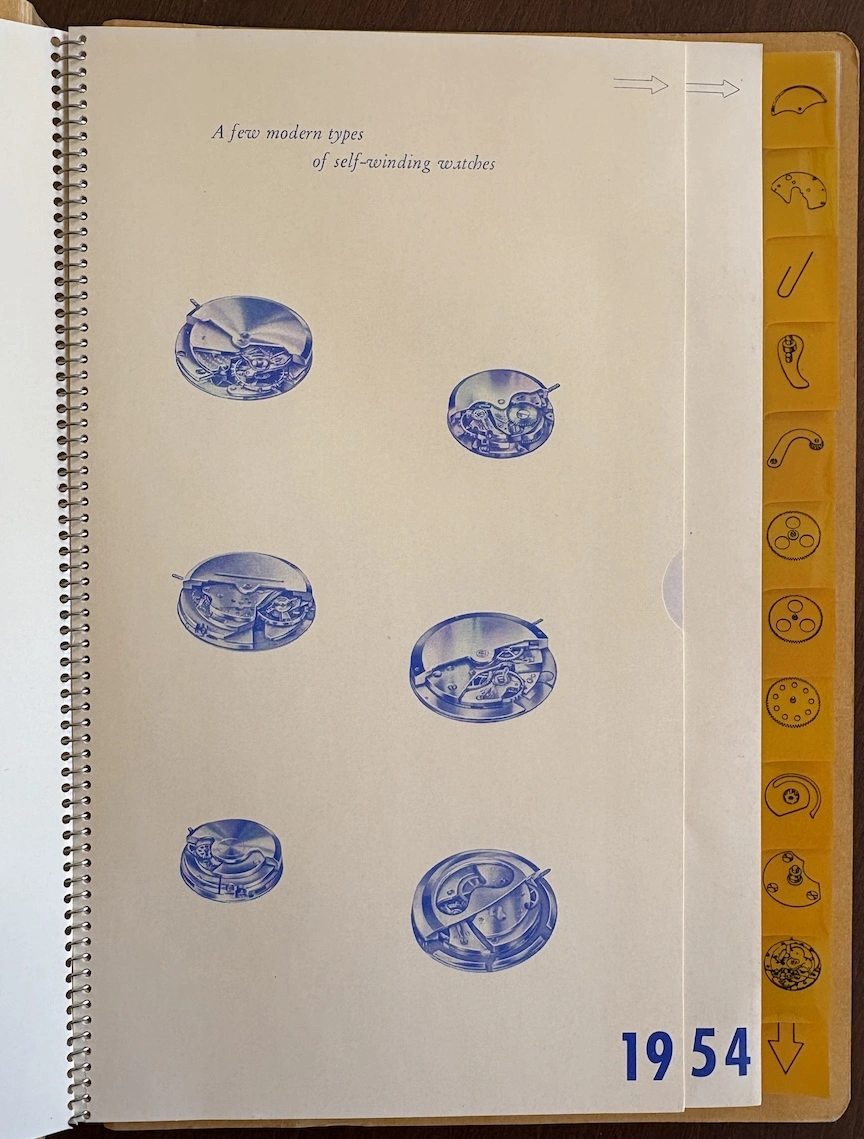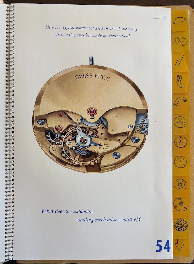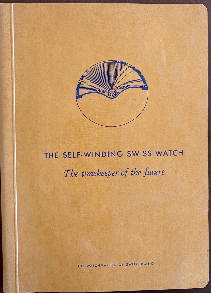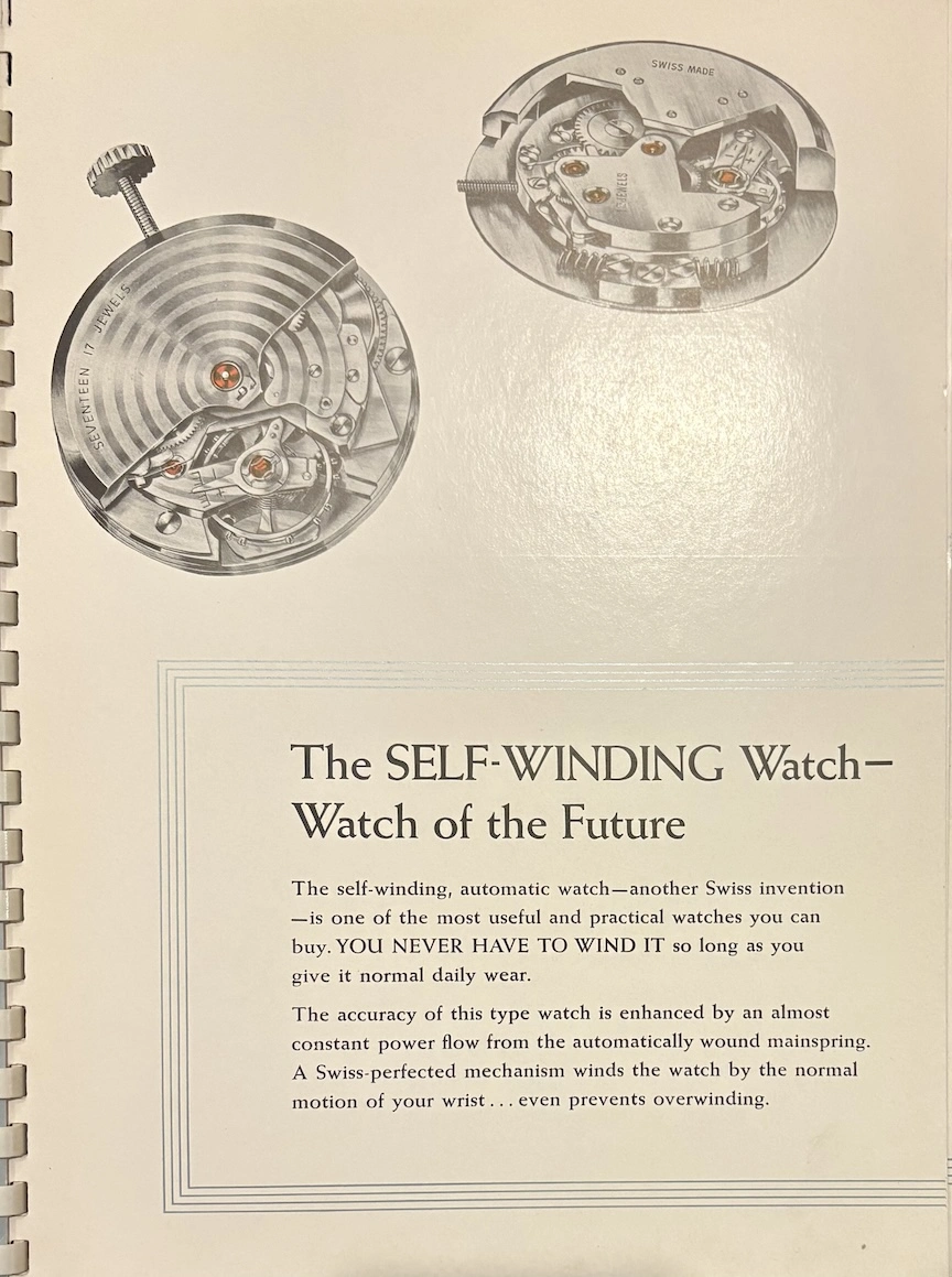 ·This was apparently a promotional item from 1954, placed in watch retail venues, marketing auto-winding watches with a highly technical and graphical explanation. It's interesting to see back when automatic movements were still considered "the timekeeper of the future!"