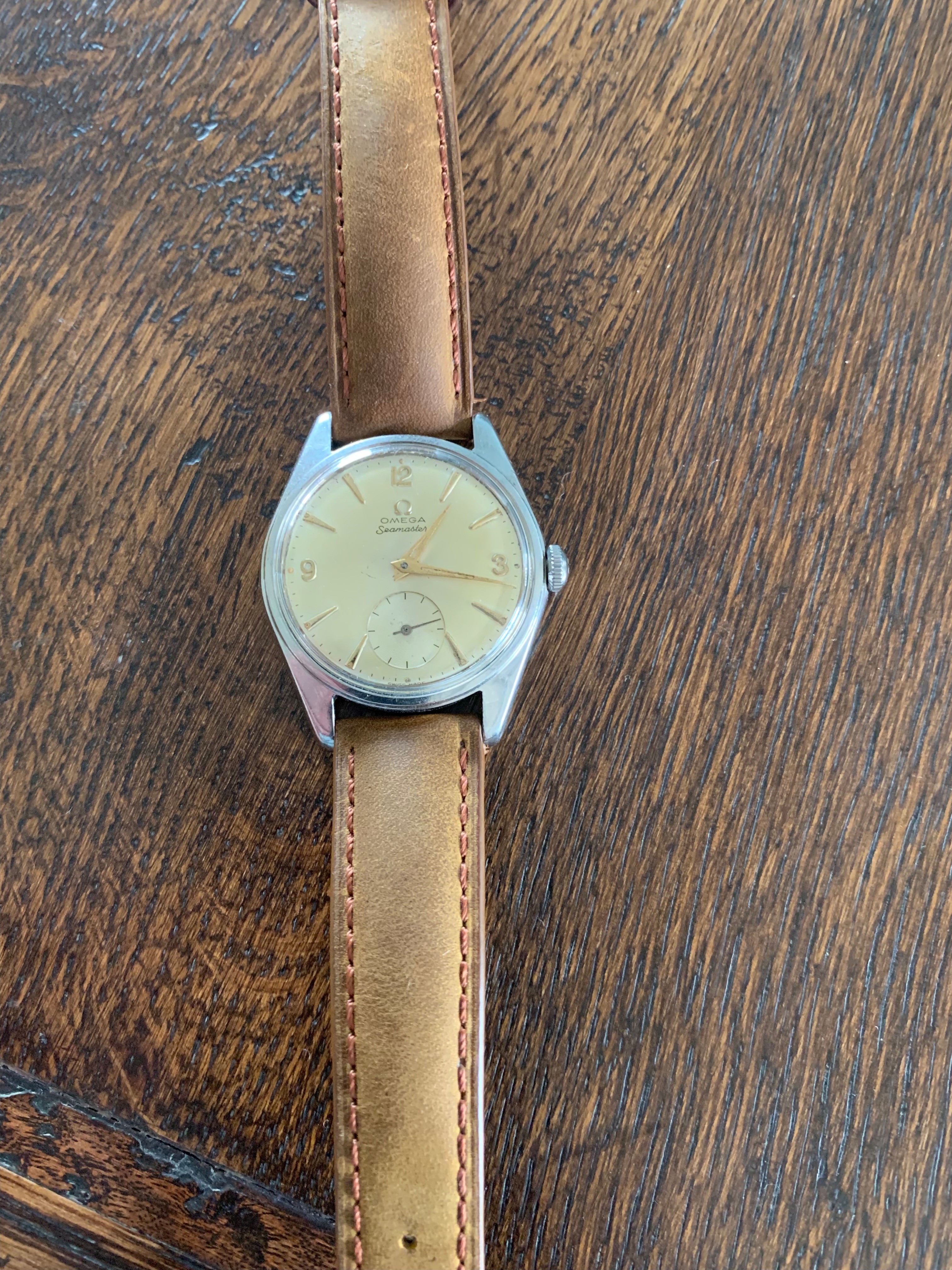 Dial: Has developed an attractive even patina. Applied gold toned Omega logo, arabic numerals at 3-9-12 and elongated hour batons. Gold toned dauphine hands.