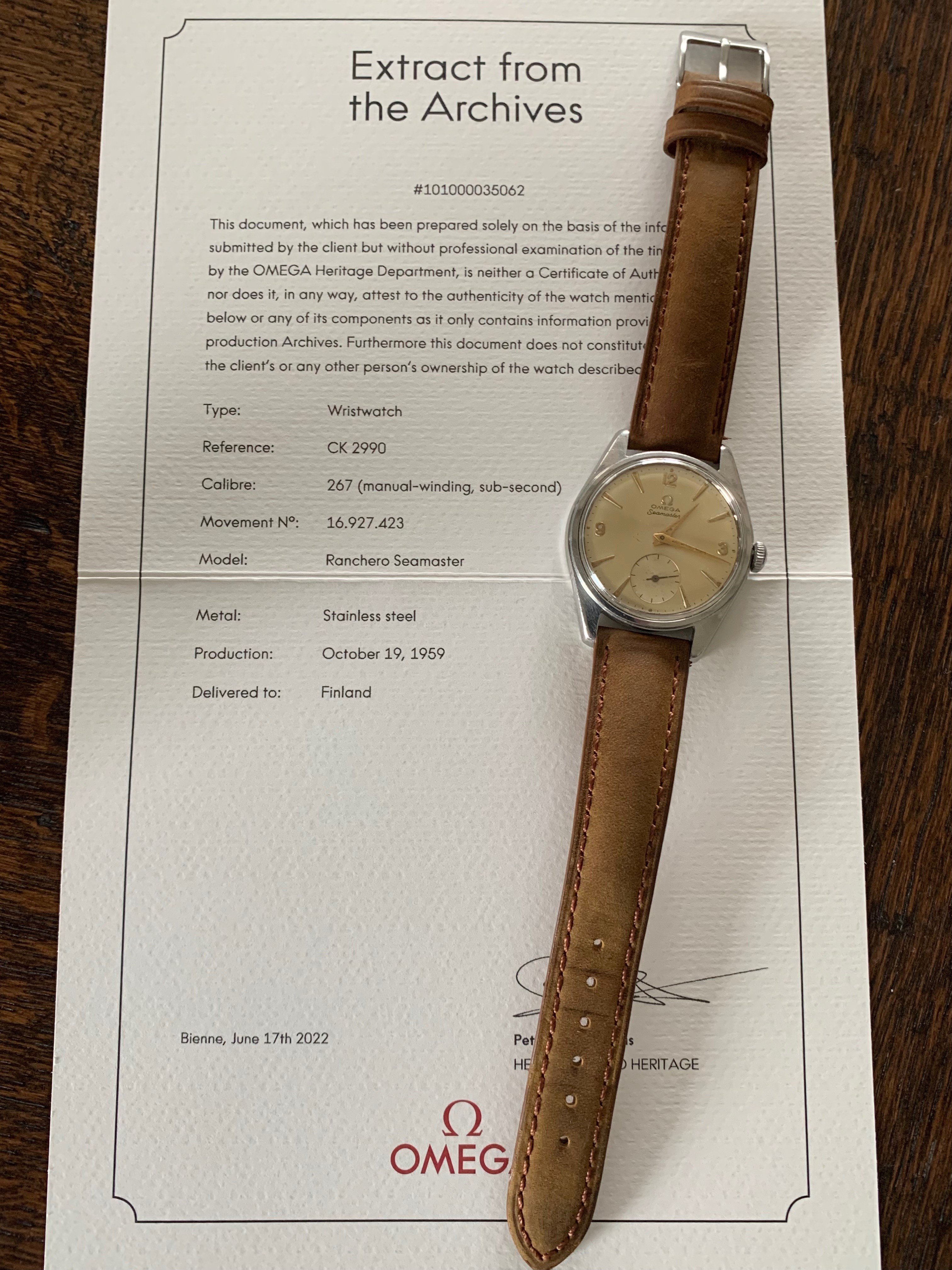 Per the extract this watch was delivered to Finland in October 1959. Offering this nice example at USD1,475 NOW USD1,175 (or market equivalent in any major currency that I can receive using Wise.com) - EUR, GBP, CHF, AUD...) - pricing includes international shipping to your door via FedEx or DHL.