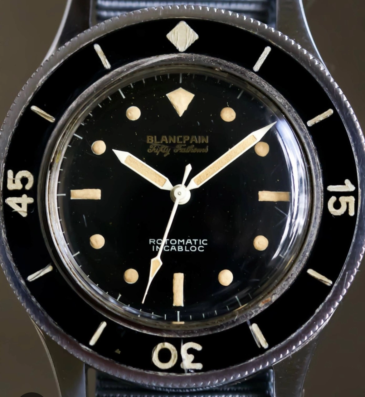 The design clearly draws inspiration from vintage military dive watches, featuring a bakelite-style bezel and cream-toned hands and markers, evoking the character of the legendary Blancpain Fifty Fathoms models.