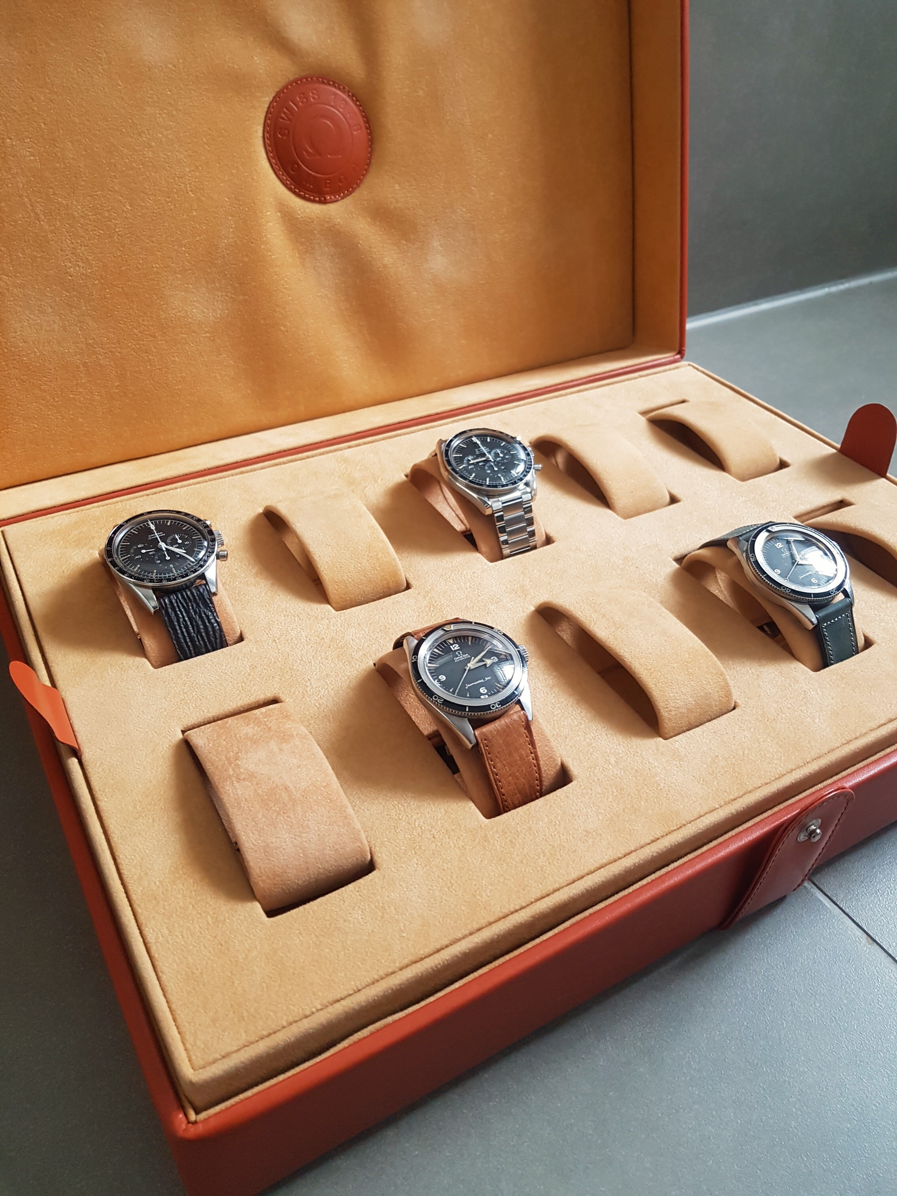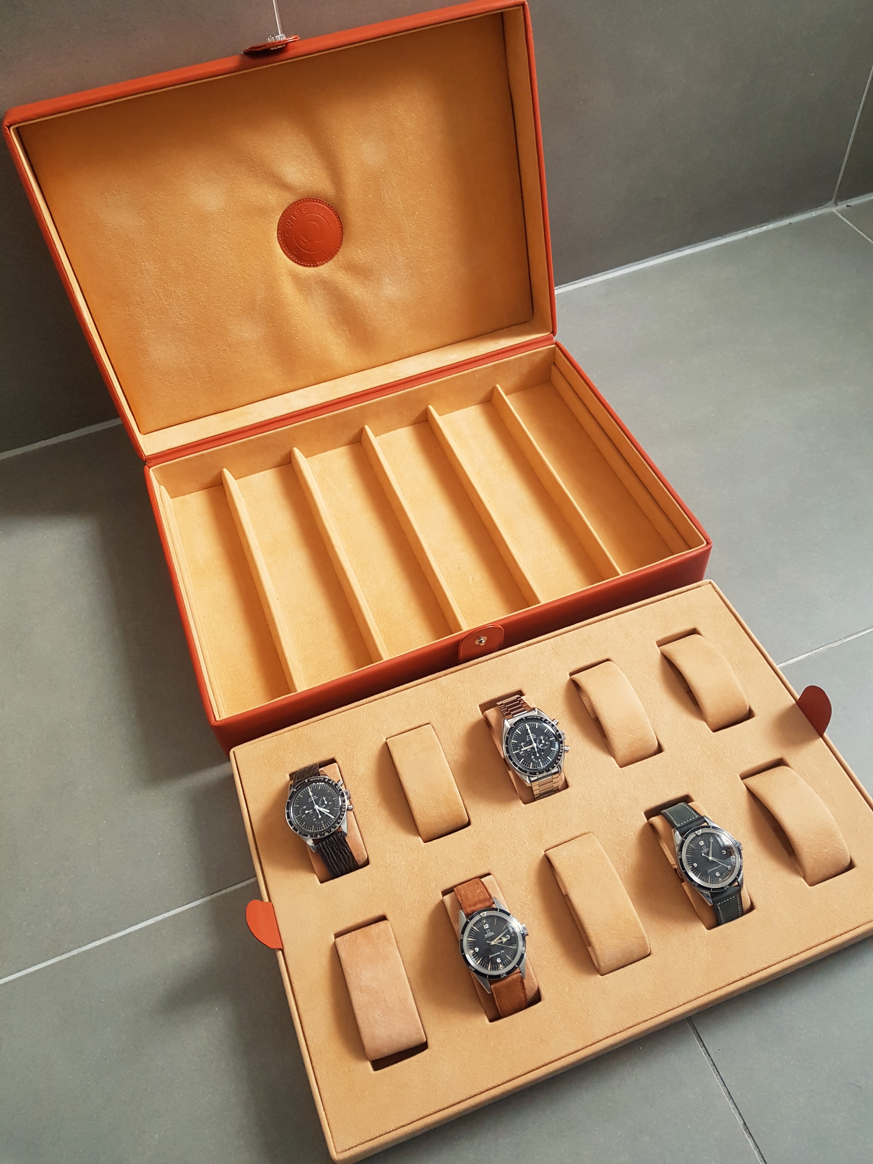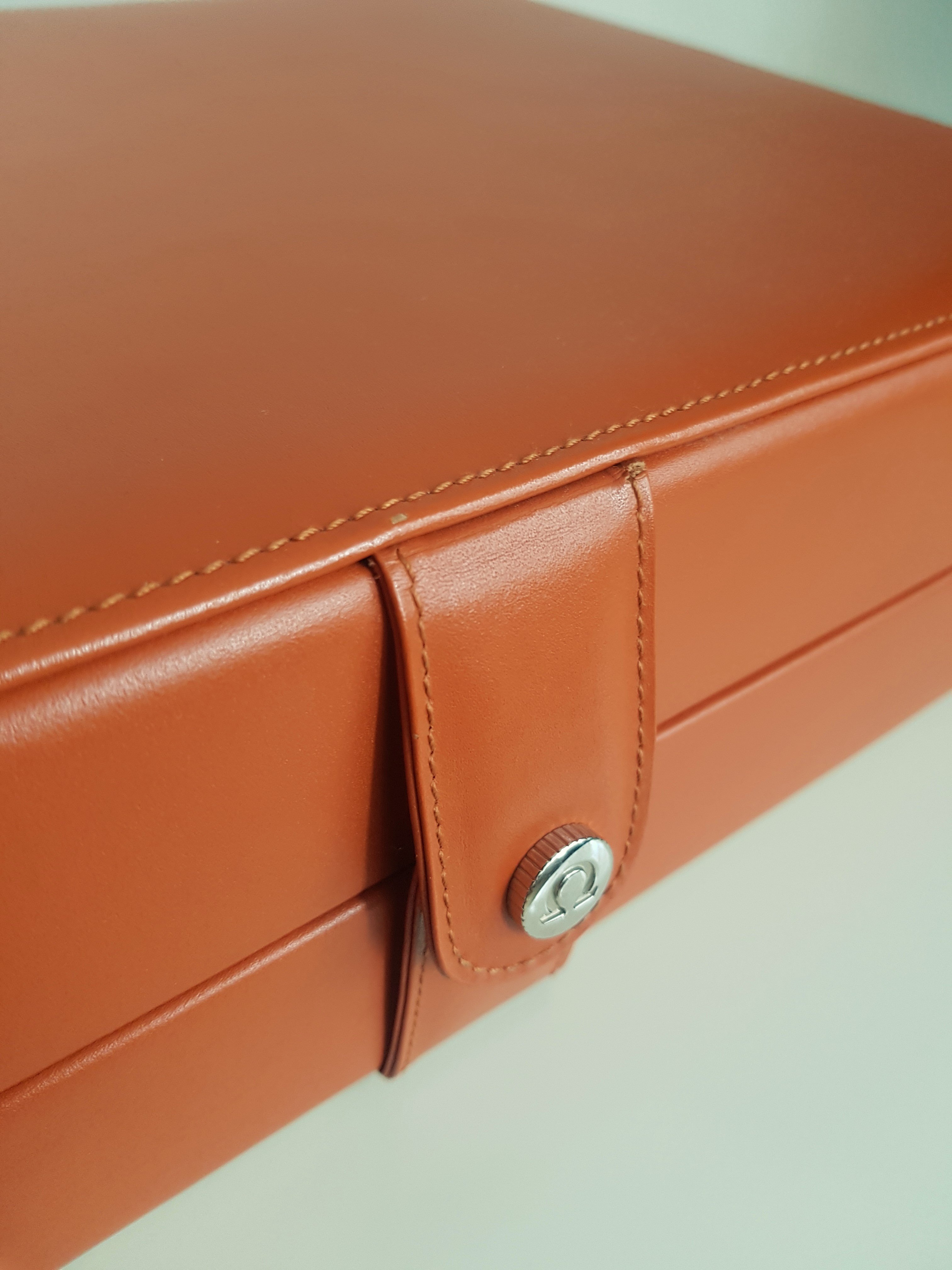 It has a very well made interior lined with a plush Nabuka micro-fibre and will accommodate 10 watches in the removable top layer and a further 6 in the lower layer. Nice detailing with the Omega logo on the clasp and patch.