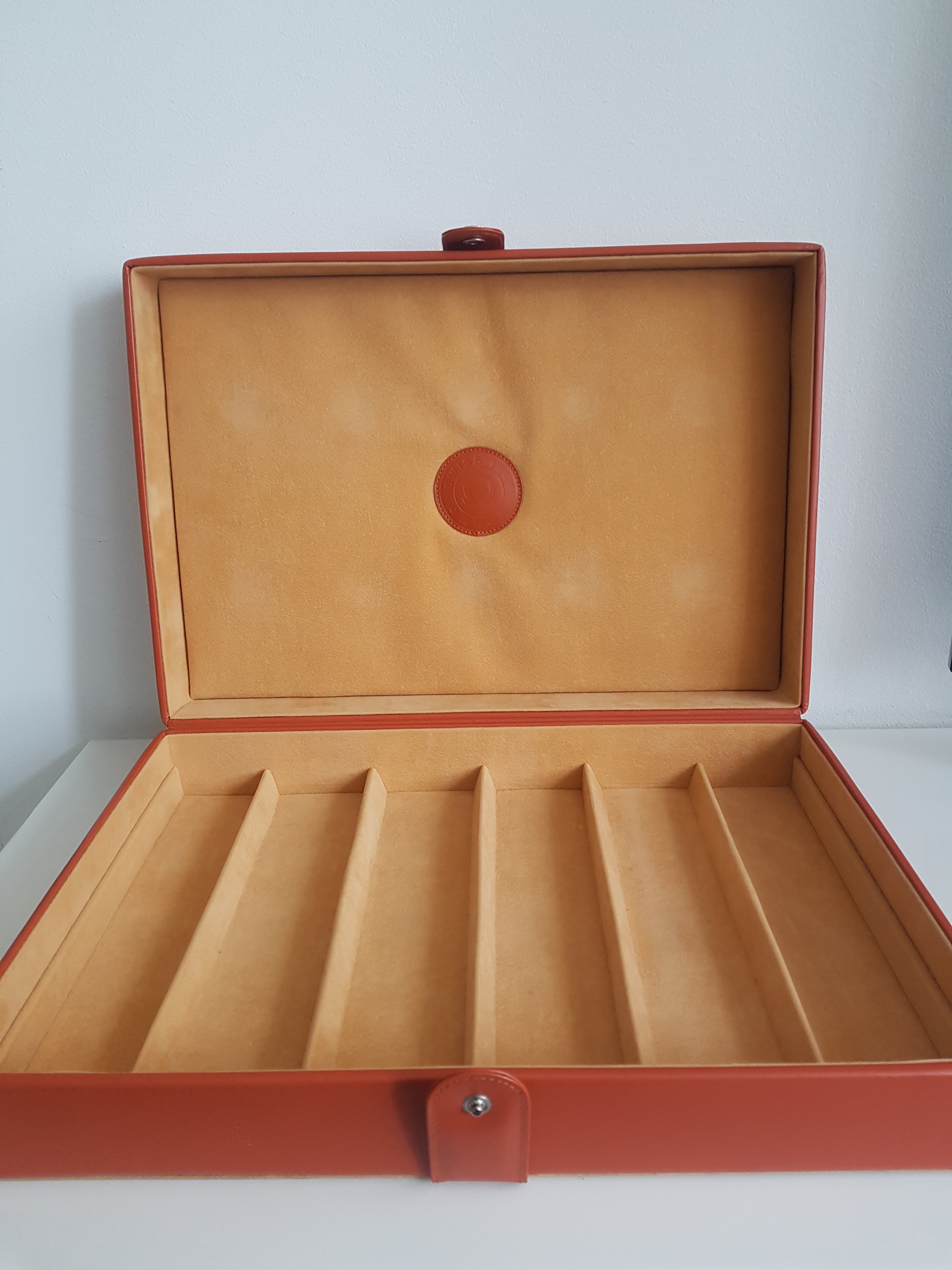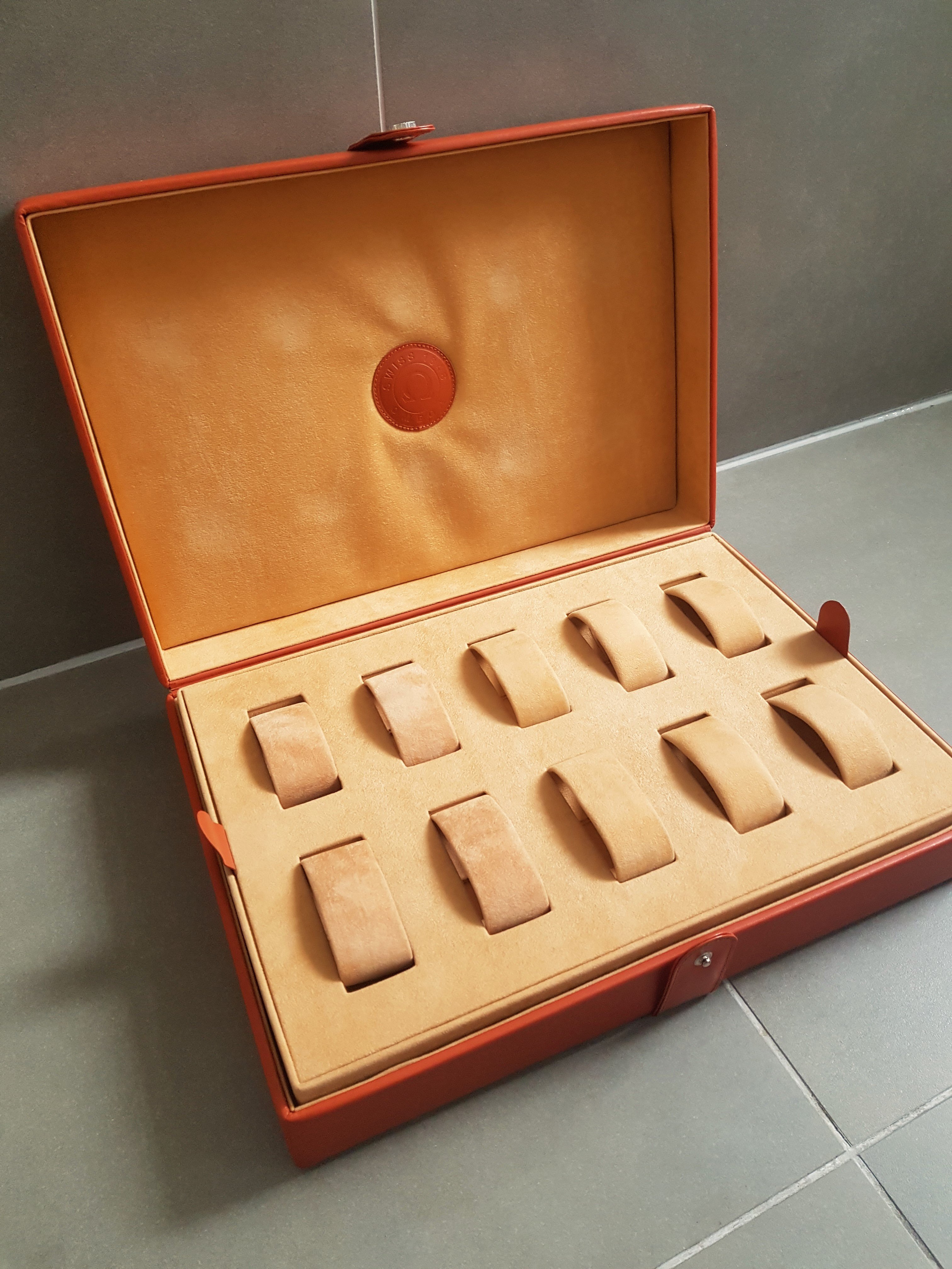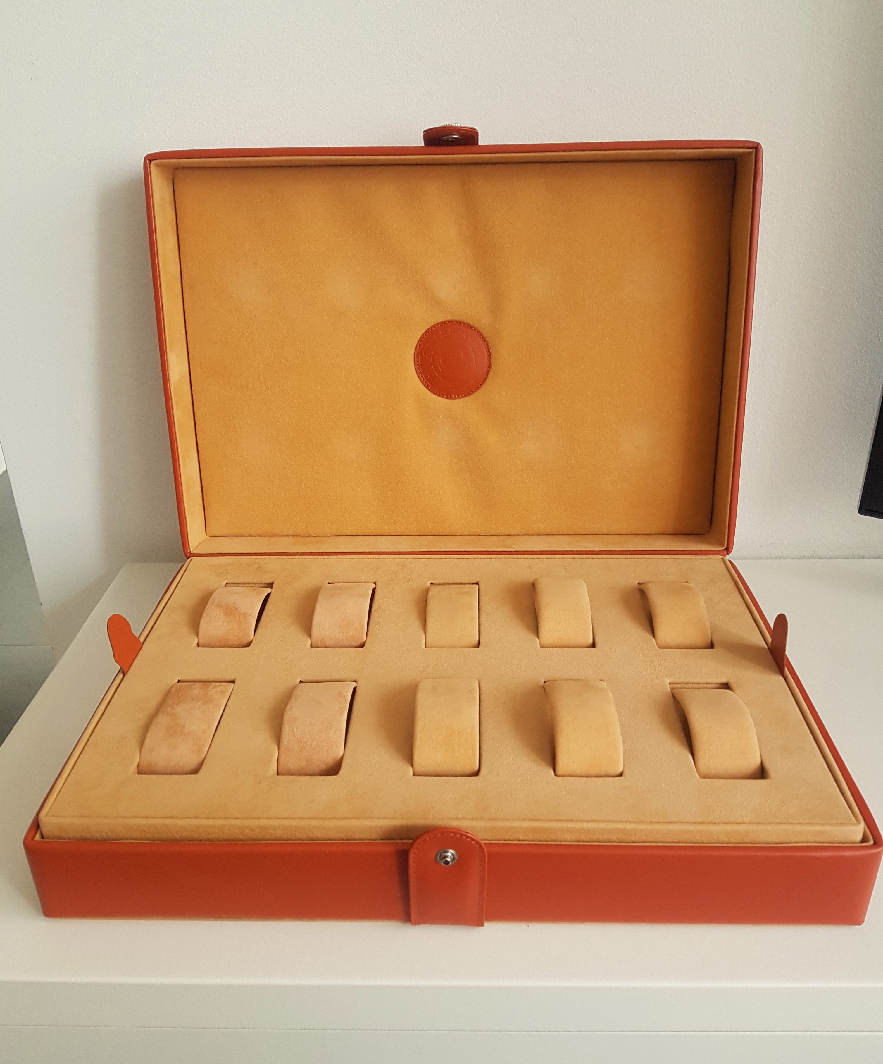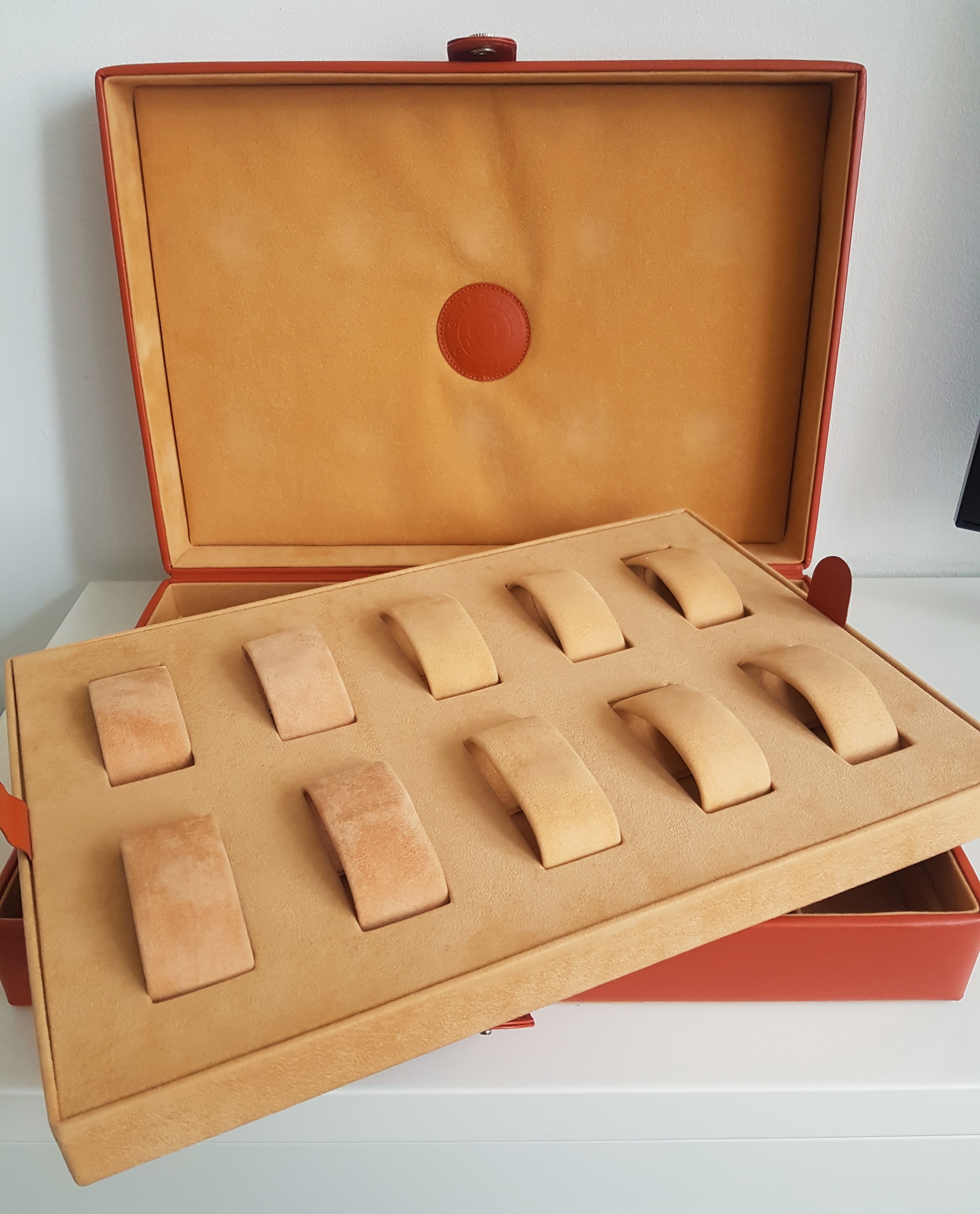 It has a very well made interior lined with a plush Nabuka micro-fibre and will accommodate 10 watches in the removable top layer and a further 6 in the lower layer. Nice detailing with the Omega logo on the clasp and patch.