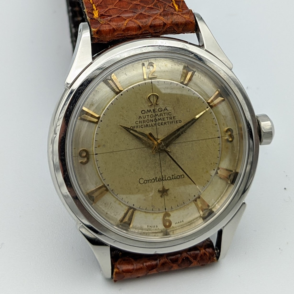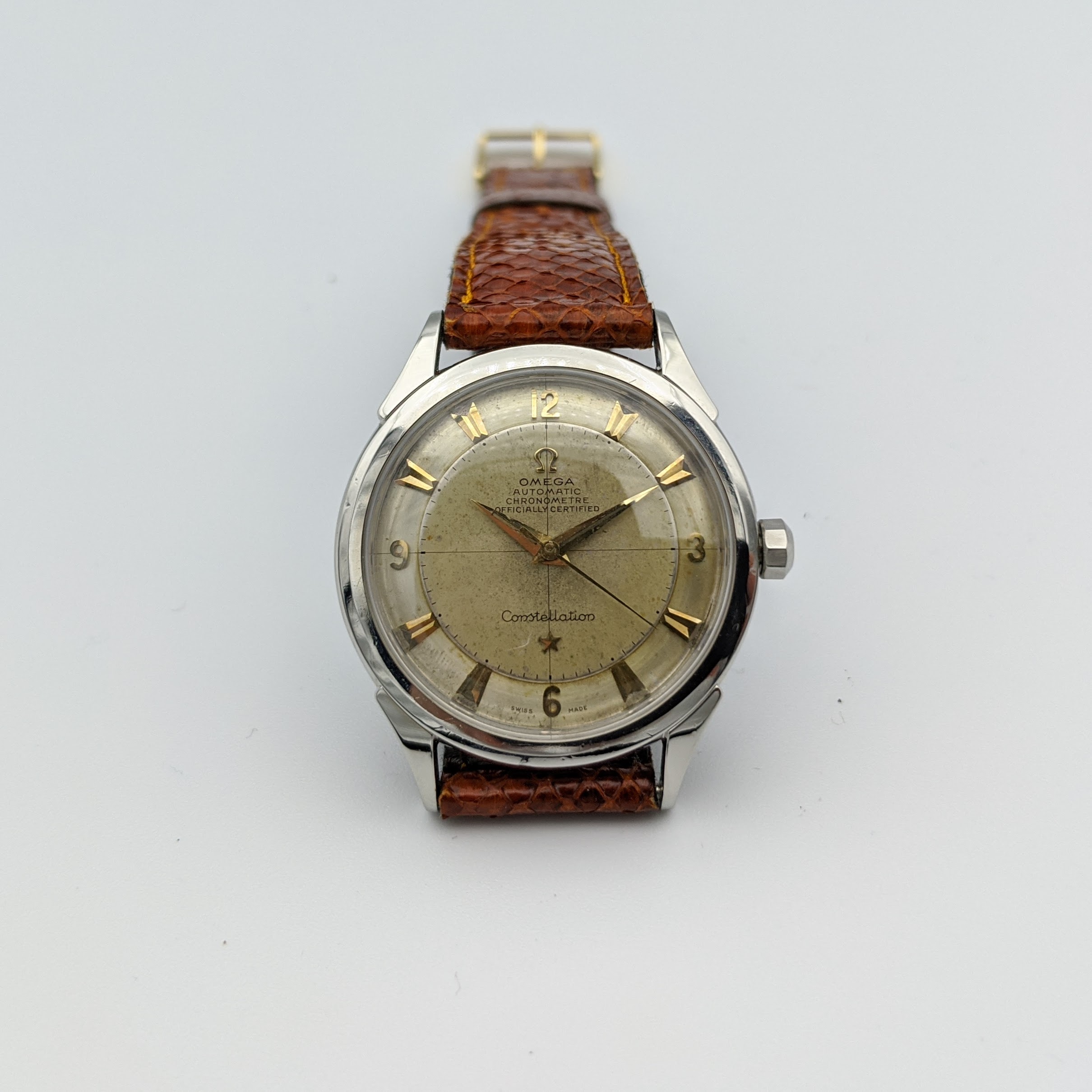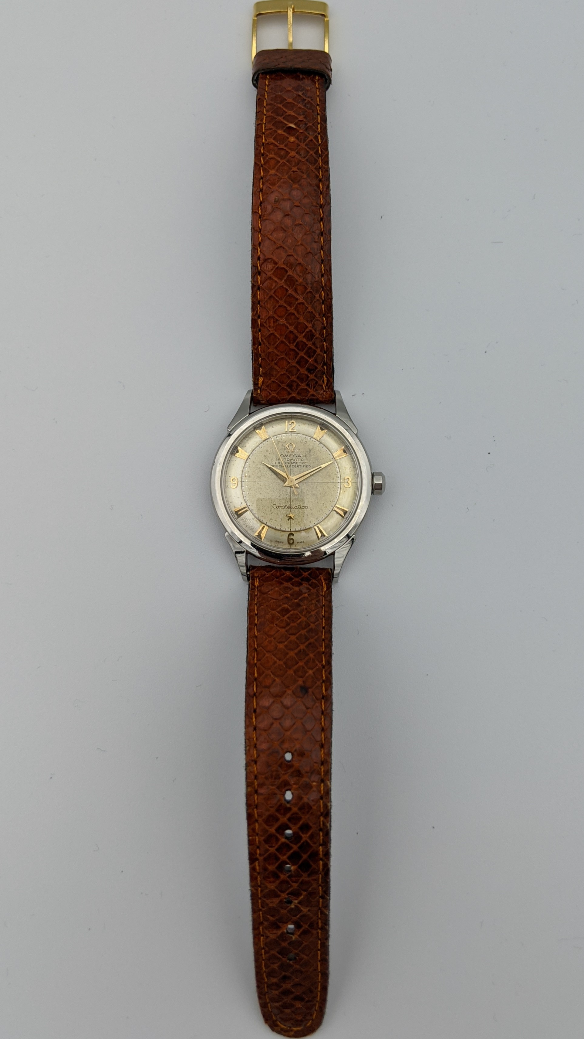 This is the second gen. Constellation - successor of the 2648, the only difference is the srew down case back. It has a rare Cal 352 bumper movement with a 12Mio serial plus an uncommon disk dial. All original nice and honest condition.
